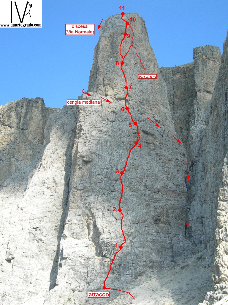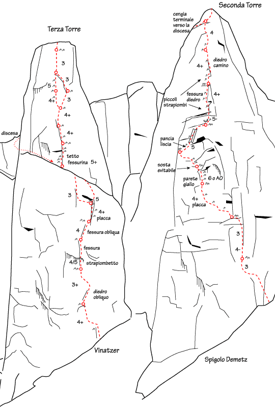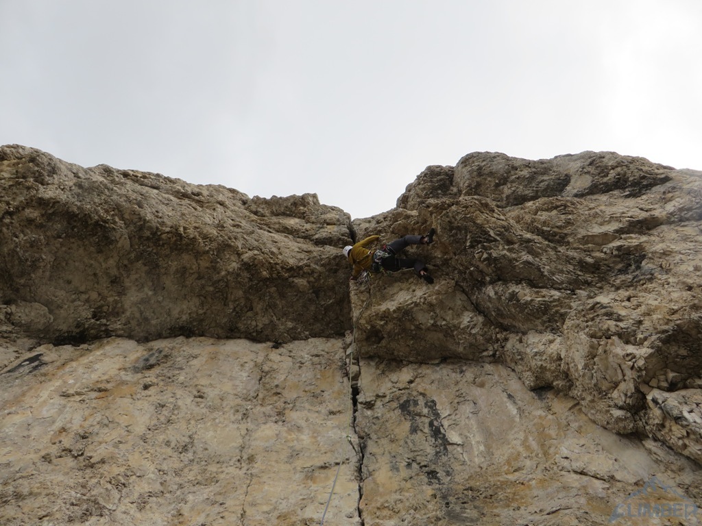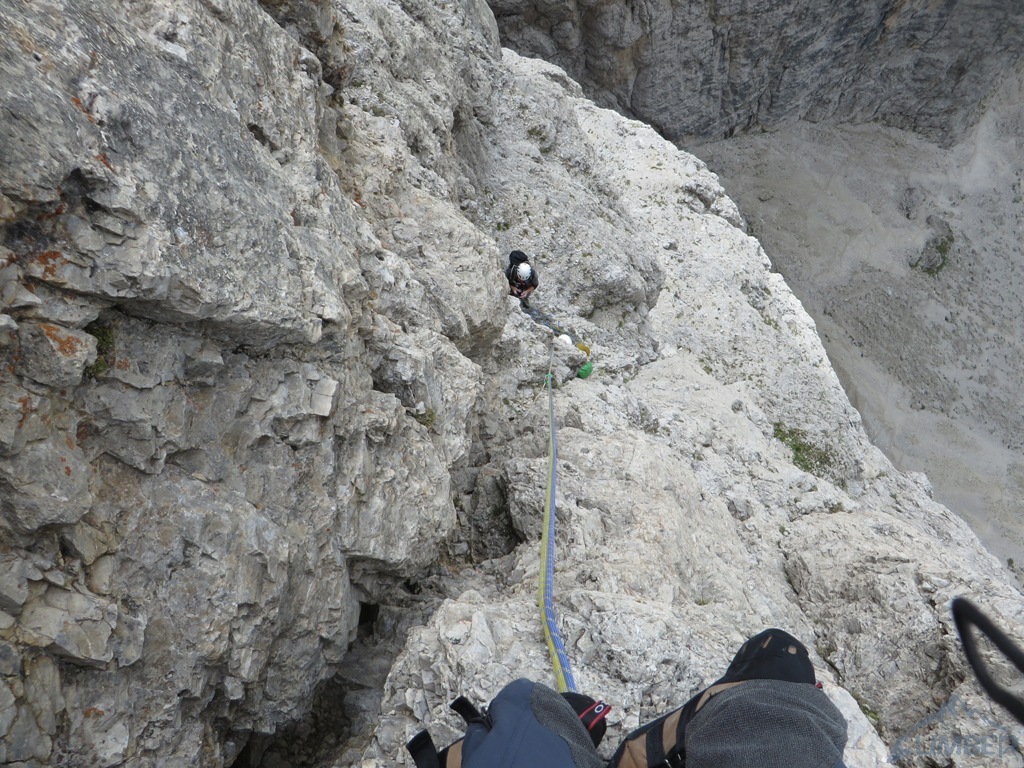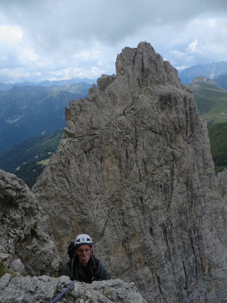 Zaczyna Jacek i szybko pokonuje pierwsze wyciągi, niestety sugeruje się wspinaczami przed nami, którzy moim zdaniem uciekli z drogi. Gdy moi koledzy przyznają mi rację, jest już za późno na wycof, kontynuujemy więc i po 3 „wariantowych” wyciągach wracamy na Vinatzera. Do cruxa startuje Grzesiek, źle jednak się składa i po „zbułowaniu" zapodaje lota na haku – zmieniam go i udaje mi się sprawnie pokonać najtrudniejszy, jak i kolejne wyciągi. Góra jest już łatwiejsza, dlatego też szybko meldujemy się na szczycie turni (wspinanie zajęło nam 5,5 godziny, 11 wyciągów).