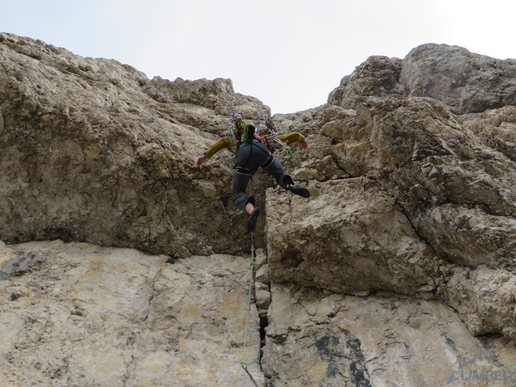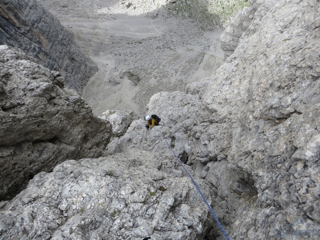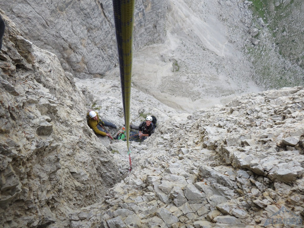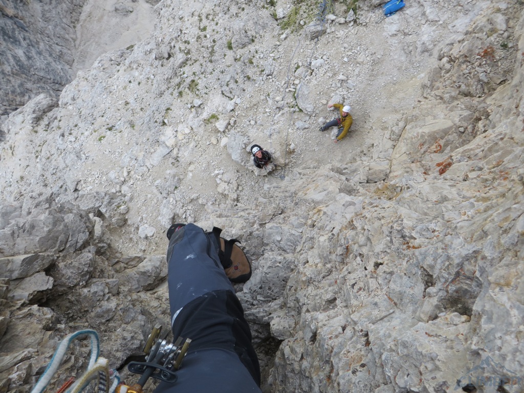 Powrót w dół to jeszcze większa przygoda niż na Andrichu – zjazdy poprowadzone są głównie kominami (z przerwą na trawers całej ściany półką), a stanowiska składają się czasem z jednego repa na ruchomym kamieniu 😉.