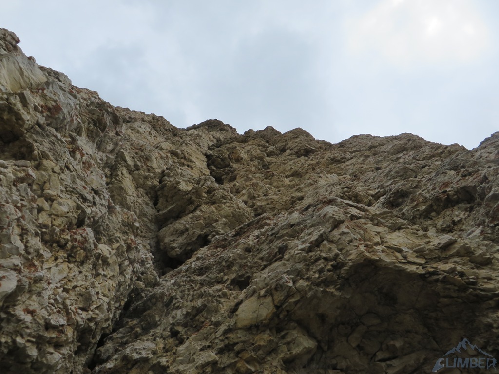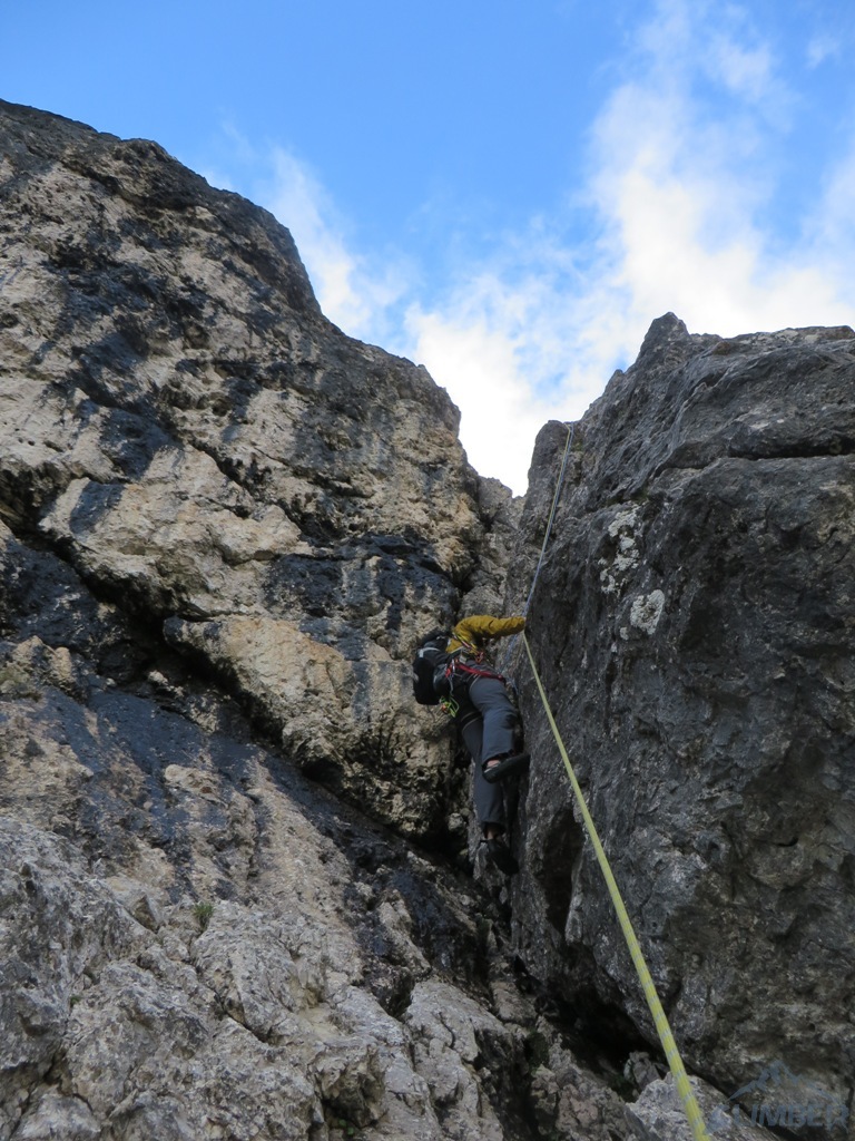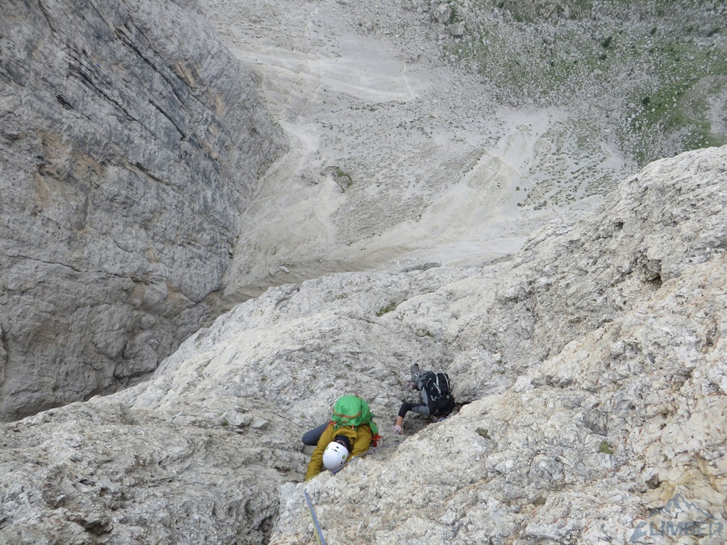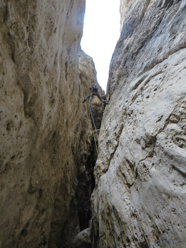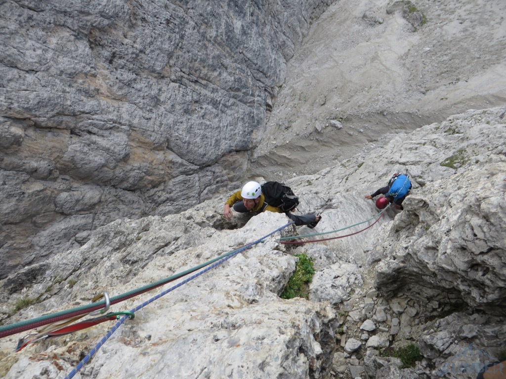 Powrót w dół to jeszcze większa przygoda niż na Andrichu – zjazdy poprowadzone są głównie kominami (z przerwą na trawers całej ściany półką), a stanowiska składają się czasem z jednego repa na ruchomym kamieniu 😉.