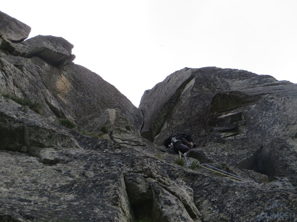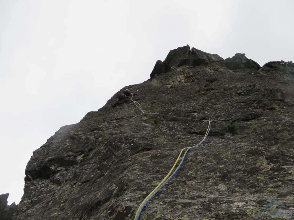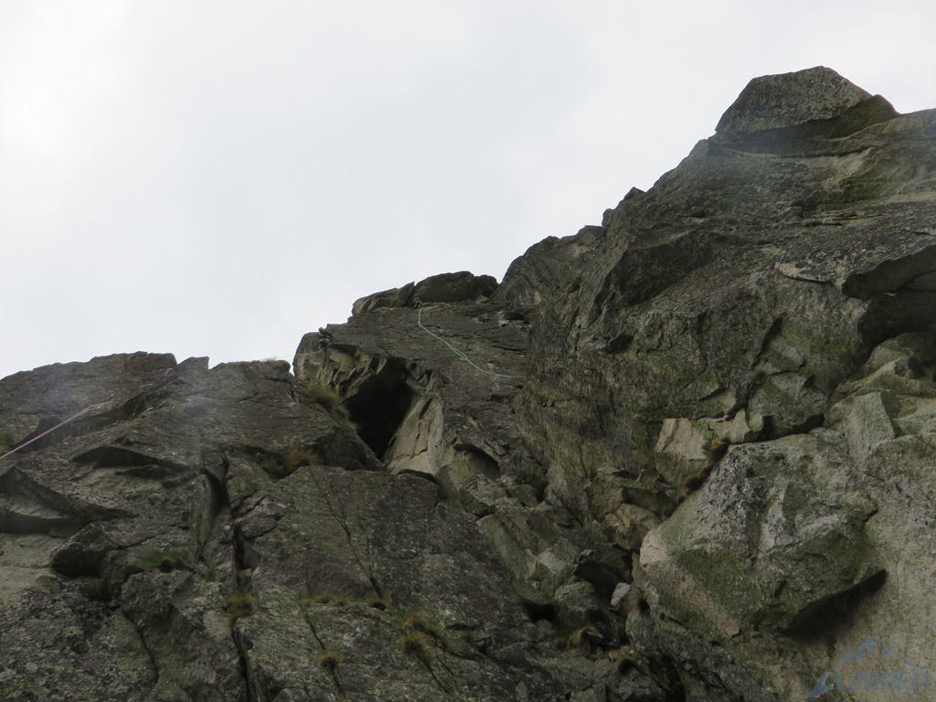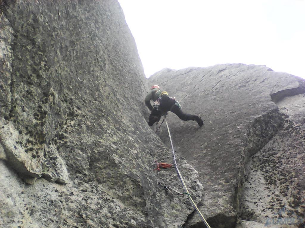Pod ścianą, mimo lekkiego opadu, decydujemy się jeszcze na linię Via AliNina (VI+), która oferuje trzy krótkie wyciągi o zbliżonych trudnościach. Droga jest praktycznie kompletnie obita więc w razie zlewy wycofać można się w każdej chwili. Prowadzenie przejmuje teraz Grzesiek – sprawnie radzi sobie z trudnościami na pierwszej płytce (jedno miejsce może zaskoczyć) i melduje się na stanie. Drugi odcinek drogi zaczyna się ciekawym okapem bez stopni, następnie przechodzi w kolejną płytę – bardzo ładne wspinanie. Nadal nie pada, można się zmienić. Na prowadzenie puszczamy Jacka, który chce poprawić sobie humor po wcześniejszej walce na drugiego 😉. Wspinanie nadal jest ciekawe, niestety droga szybko się kończy. Nie chcąc kusić losu (nadal nie lunęło), postanawiamy zakończyć wspinanie na dwóch drogach i wracamy na parking.