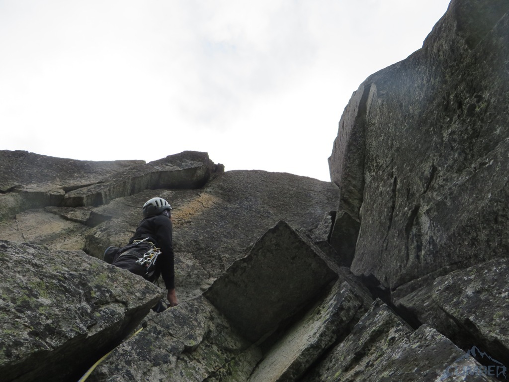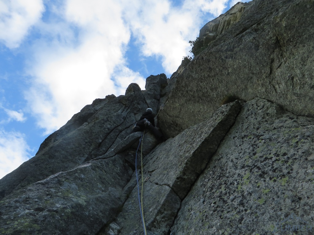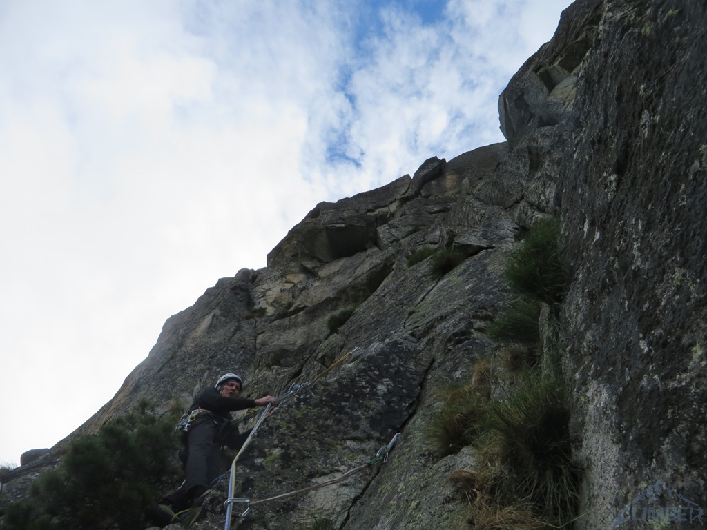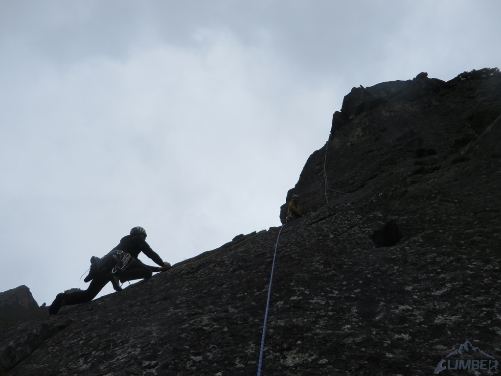 Pod ścianą, mimo lekkiego opadu, decydujemy się jeszcze na linię Via AliNina (VI+), która oferuje trzy krótkie wyciągi o zbliżonych trudnościach. Droga jest praktycznie kompletnie obita więc w razie zlewy wycofać można się w każdej chwili. Prowadzenie przejmuje teraz Grzesiek – sprawnie radzi sobie z trudnościami na pierwszej płytce (jedno miejsce może zaskoczyć) i melduje się na stanie. Drugi odcinek drogi zaczyna się ciekawym okapem bez stopni, następnie przechodzi w kolejną płytę – bardzo ładne wspinanie. Nadal nie pada, można się zmienić. Na prowadzenie puszczamy Jacka, który chce poprawić sobie humor po wcześniejszej walce na drugiego 😉. Wspinanie nadal jest ciekawe, niestety droga szybko się kończy. Nie chcąc kusić losu (nadal nie lunęło), postanawiamy zakończyć wspinanie na dwóch drogach i wracamy na parking.