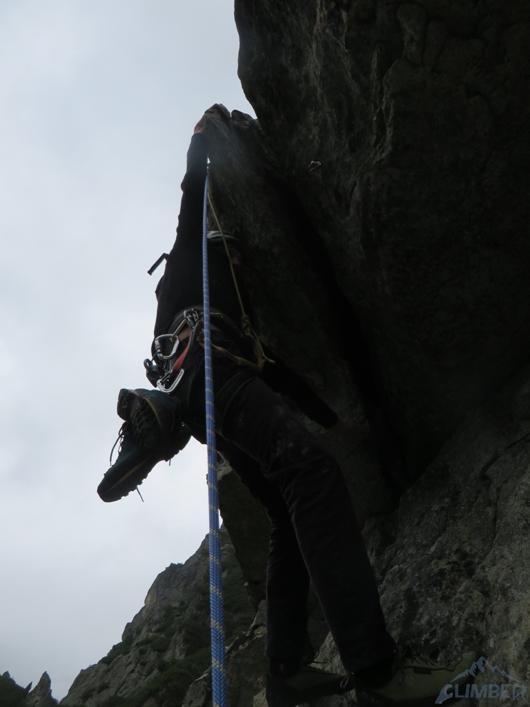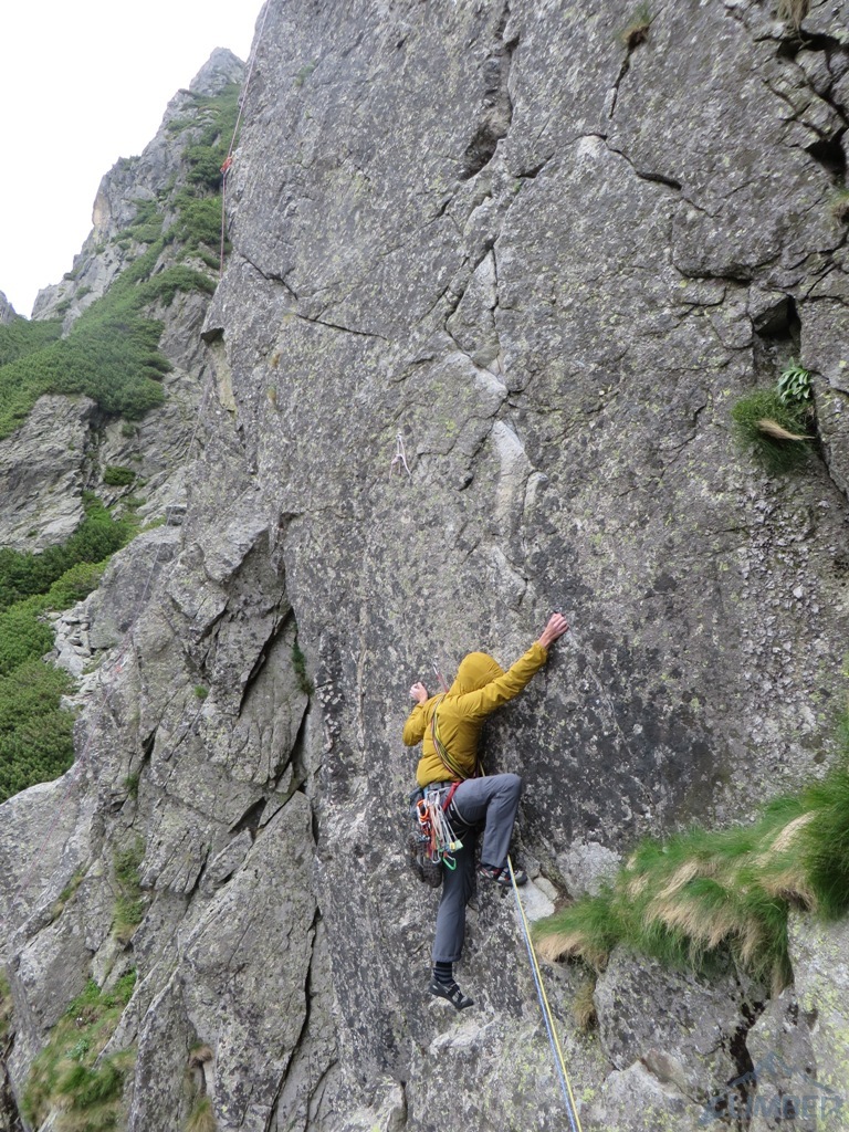 Tym razem prognozy nie są zbyt optymistyczne, dlatego też stawiamy na odległą zaledwie o godzinę marszu z parkingu Galerię Osterwy. Ściana ma bardziej charakter „skałkowy” niż górski, ale ciekawych dróg na niej sporo. Jest zimno i zanosi się na deszcz, dlatego od razu wchodzimy w nasz główny cel, drogę Dieška-Halás-Marek(VII-). Pierwsze dwa wyciągi to dobra rozgrzewka - najpierw łatwiejsze zacięcia, potem bardziej sprężny komin. Czwarty z kolei to wizytówka ściany i prawdziwa perełka! Pod kluczowym wyciągiem zmieniam Jacka i wchodzę w słynne zacięcie, które faktycznie oferuje piękne wspinanie. Po kilku minutach walki oraz poprawieniu ułożenia na ostatnim trudnym metrze (jeden zły ruch i OS z głowy, do powtórki), wchodzę w łatwiejszy teren. Ściągam chłopaków i szybko pędzę do ostatniego stanowiska bo zaczyna padać.
