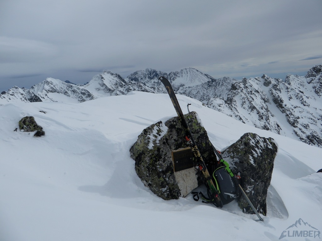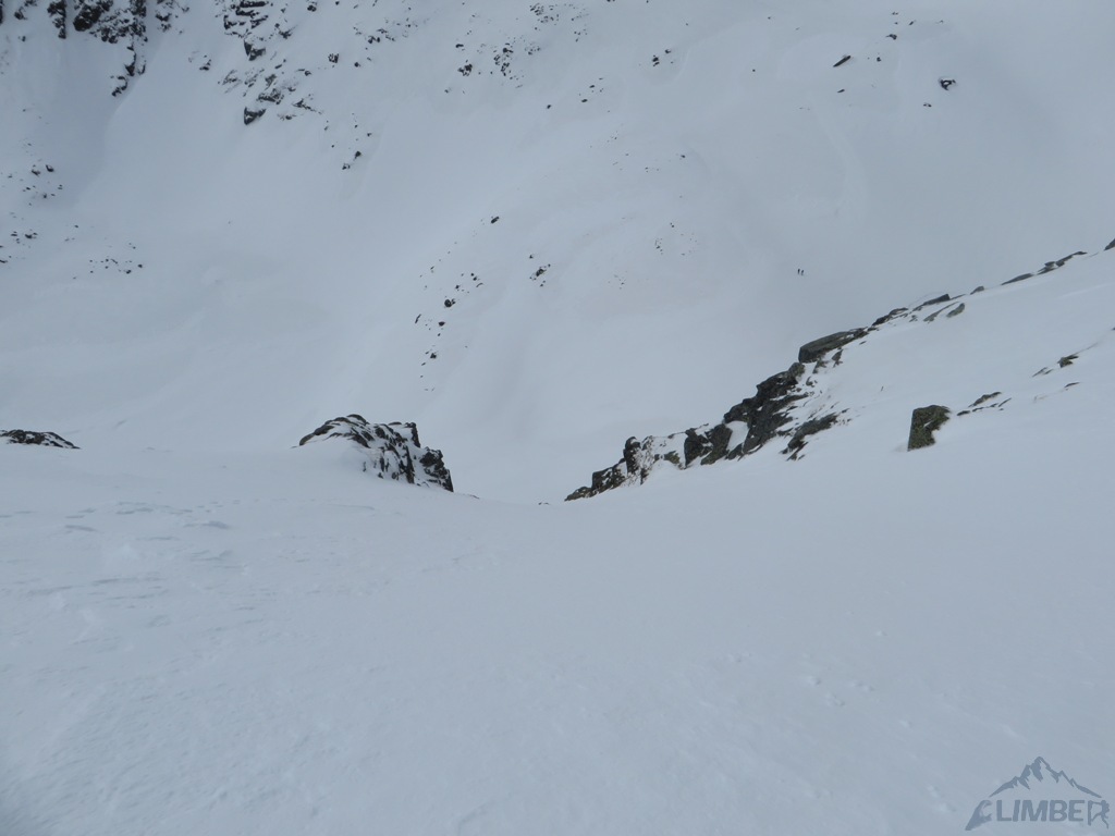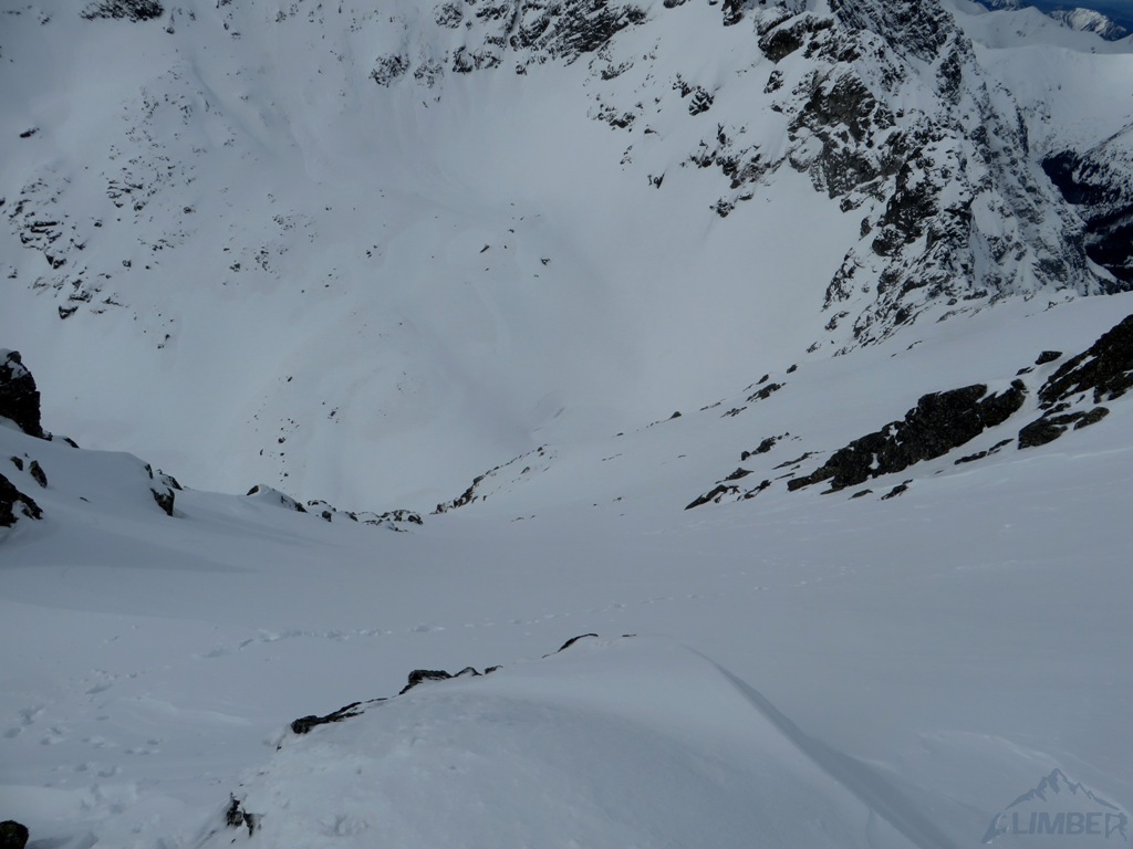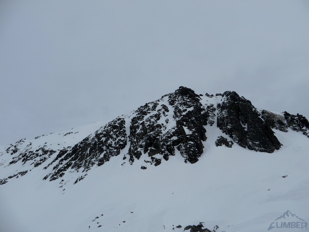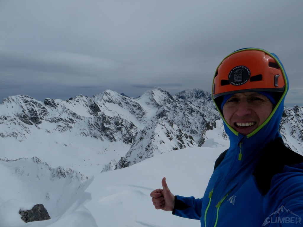 Na szczycie za długo nie zabawiam bo pogoda się coś popsuła – wieje i "się chmurzy". Do góry dałem radę, jak stąd jednak zjechać – zastanawiam się lekko przystresowany – jest bardziej stromo niż się spodziewałem a samemu jakoś tak dziwnie ;) Nie ma co pękać, zapinam narty i jadę, dość zachowawczo jednak, a najtrudniejszy odcinek między skałami pokonuję zsuwem – mimo dużej ilości śniegu miejscami jest twardo i wolę nie ryzykować.
