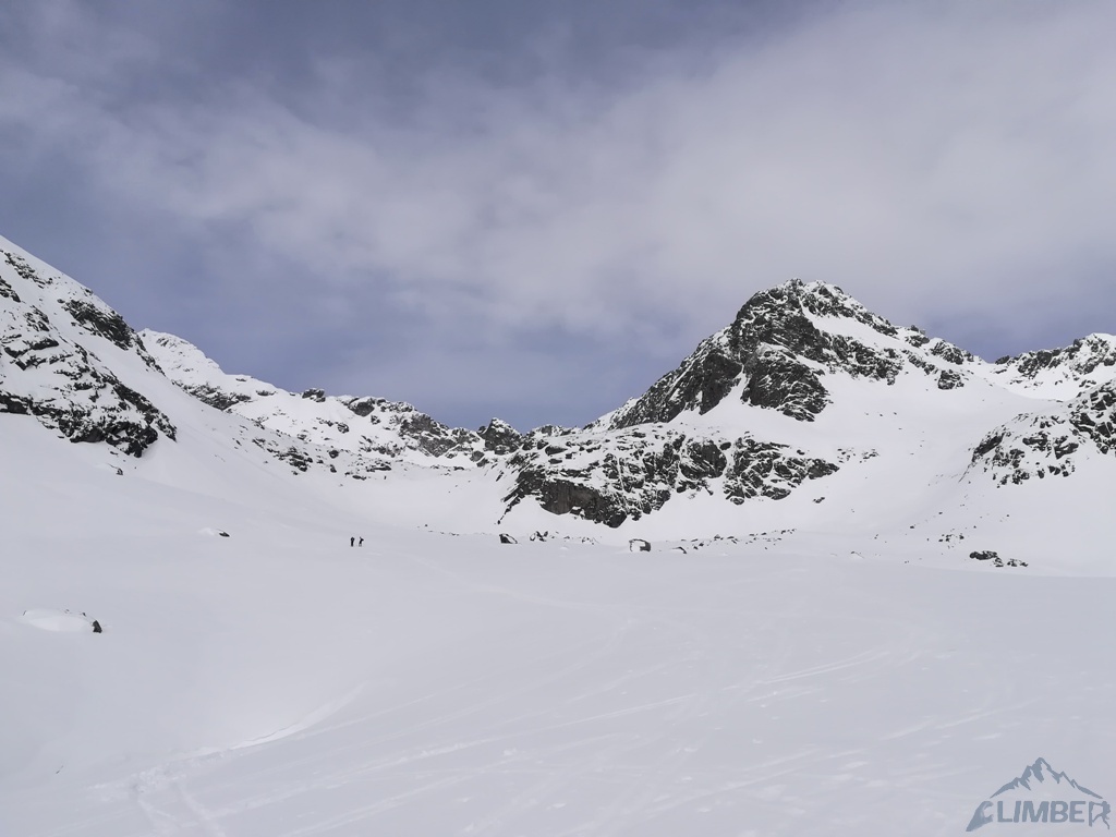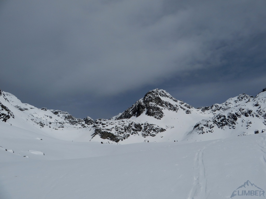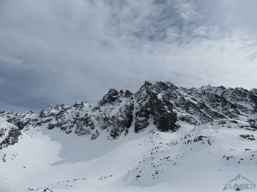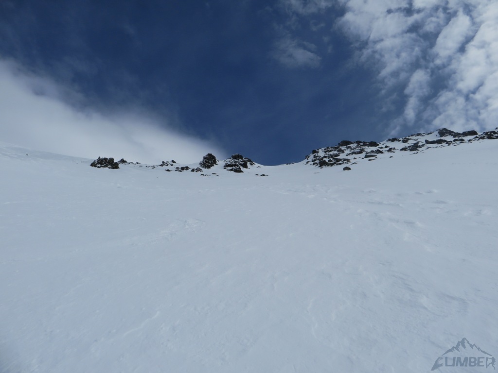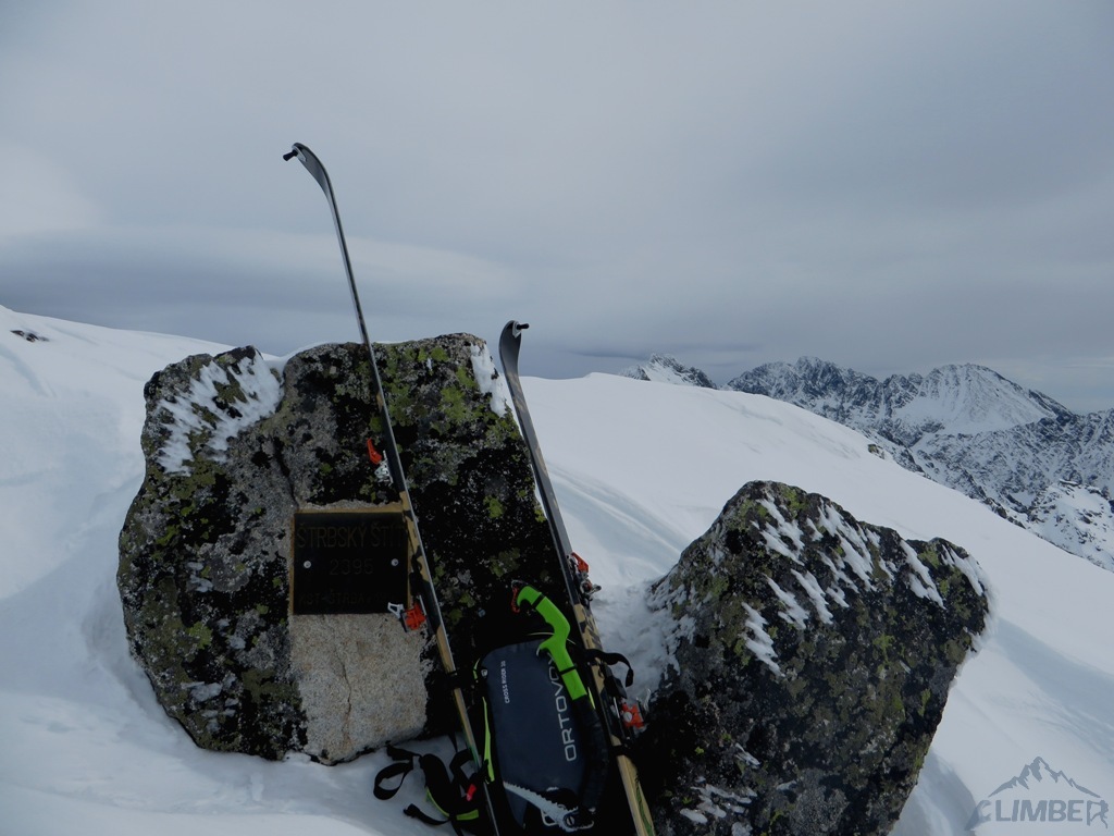 Na szczycie za długo nie zabawiam bo pogoda się coś popsuła – wieje i "się chmurzy". Do góry dałem radę, jak stąd jednak zjechać – zastanawiam się lekko przystresowany – jest bardziej stromo niż się spodziewałem a samemu jakoś tak dziwnie ;) Nie ma co pękać, zapinam narty i jadę, dość zachowawczo jednak, a najtrudniejszy odcinek między skałami pokonuję zsuwem – mimo dużej ilości śniegu miejscami jest twardo i wolę nie ryzykować.