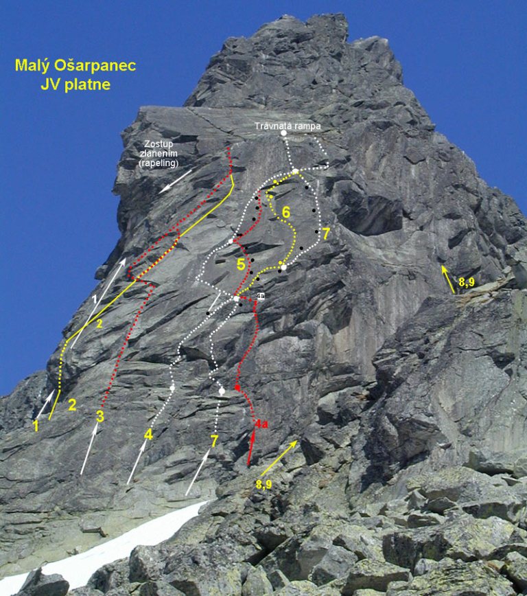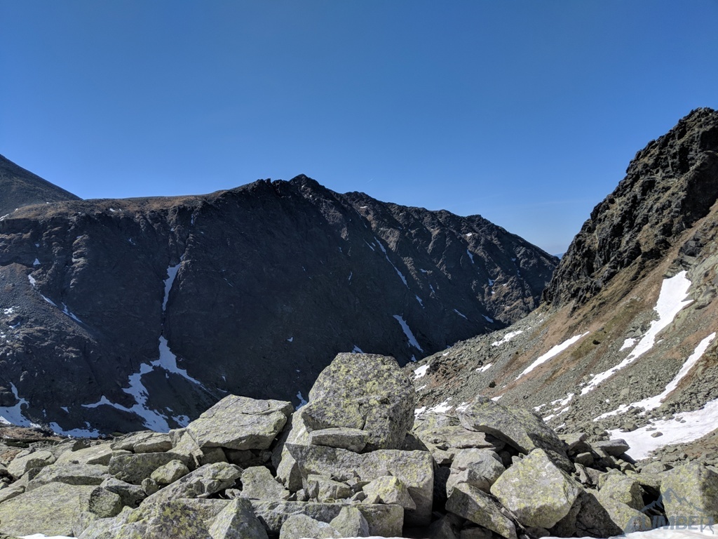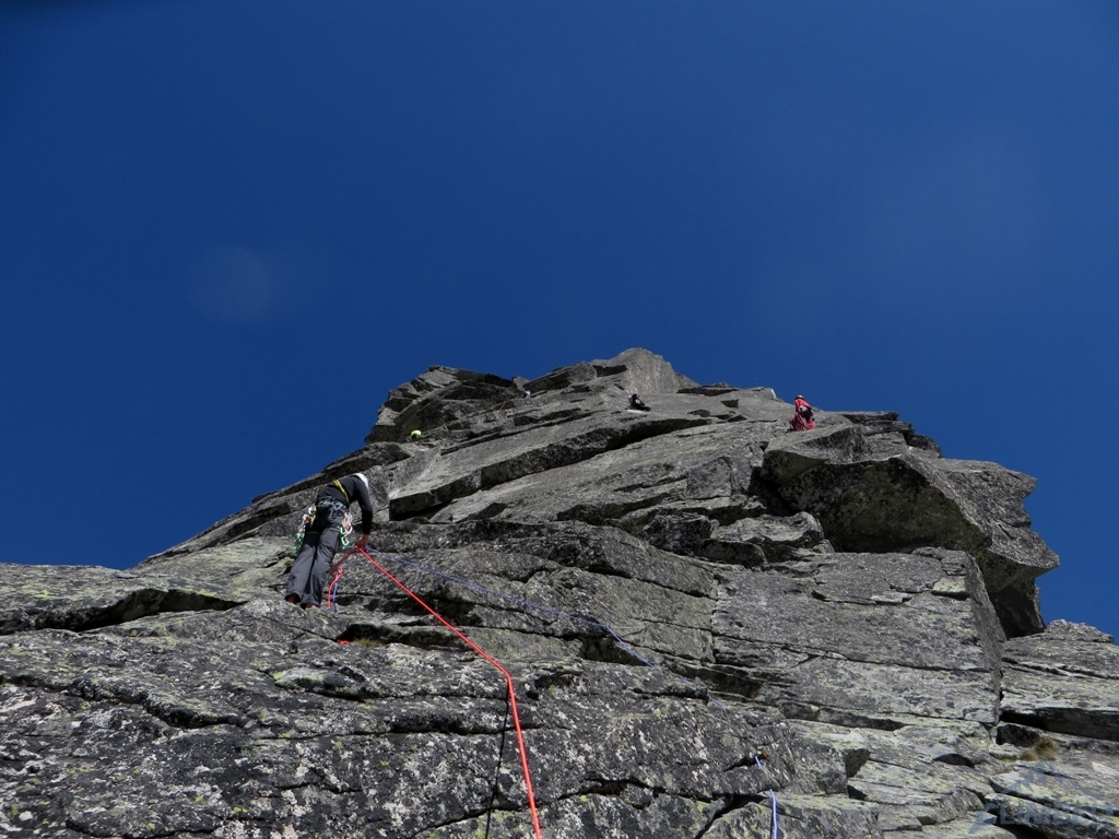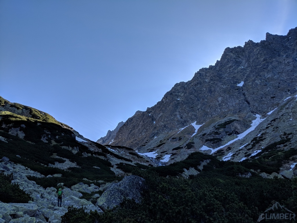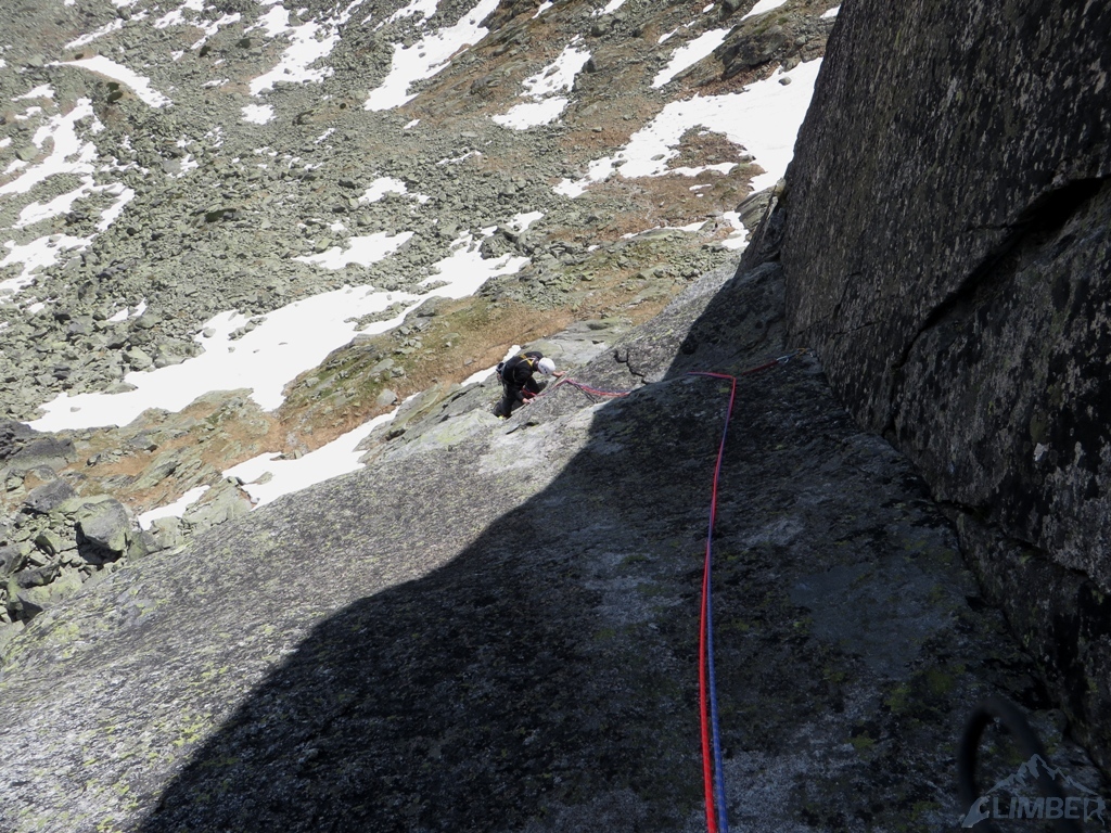 Śniegu na podejściu brak, zalega tylko w żlebach, bezpośrednio pod niektórymi ścianami oraz w zacienionych miejscach. Gdy docieramy pod ścianę, na drodze Puškáša są już dwa zespoły - jeden kończy drogę, drugi jest w połowie. Na szczęście więcej osób się nie pojawia, jest więc szansa na spokojne wspinanie. Pierwsze dwa wyciągi prowadzi Grzesiek - początek to łatwe dojście do stanowiska, nad którym jest kluczowy odcinek - bulderowe wejście na płytę z cienką rysą. Asekuracja jest bardzo dobra (ring pod cruxem a wyżej super siada własny mały sprzęt), a wspinanie ciekawe i zajmujące. Zmieniamy się na prowadzeniu, szybko przechodzę równie ciekawy, ale krótki wyciąg numer trzy. Ostatni odcinek jest dłuższy i prowadzi wzdłuż rys. Zjeżdżamy Kominem Komarnickiego pod zachodnią ścianę (równo 60 metrów) i schodzimy kawałek by wrócić na stronę południową, gdzie zostawiliśmy plecaki. Krótki odpoczynek i wracamy w ścianę.
