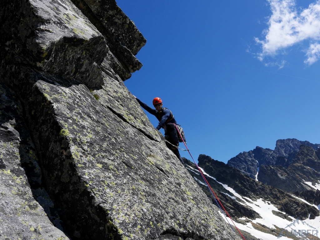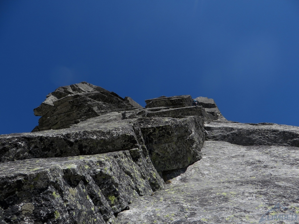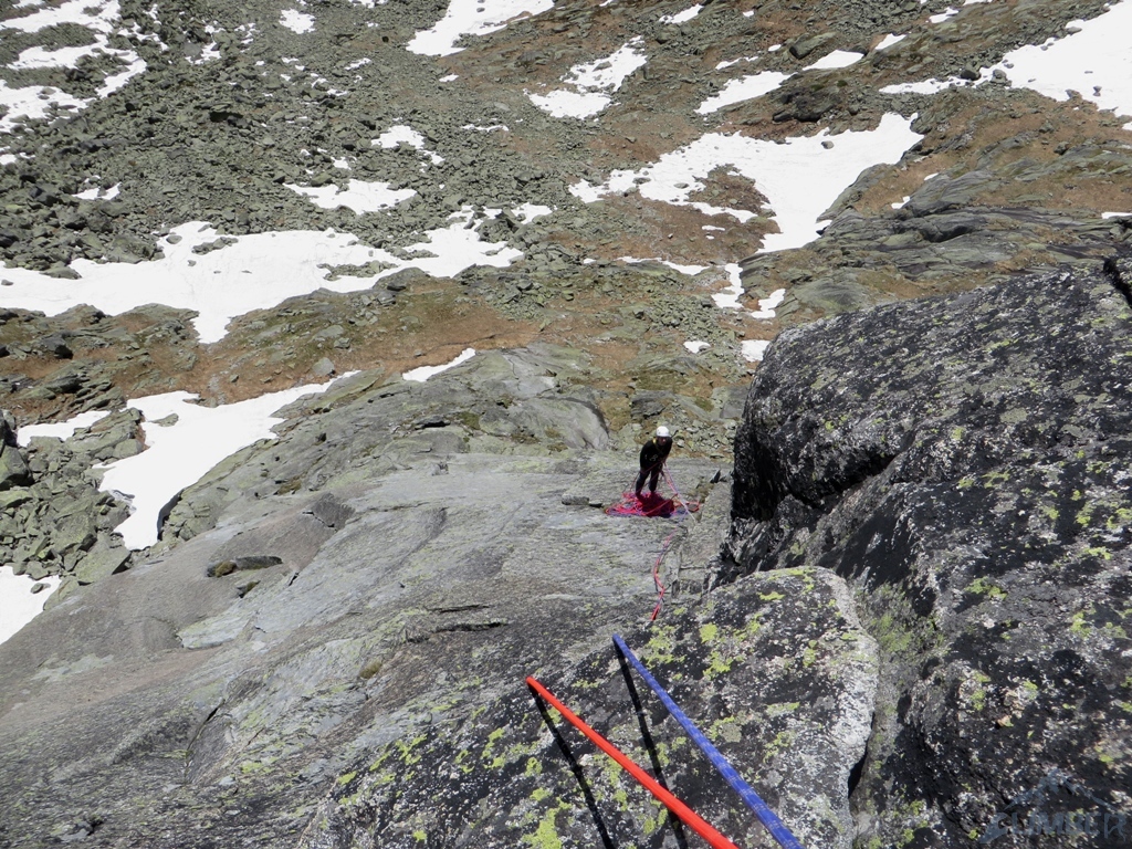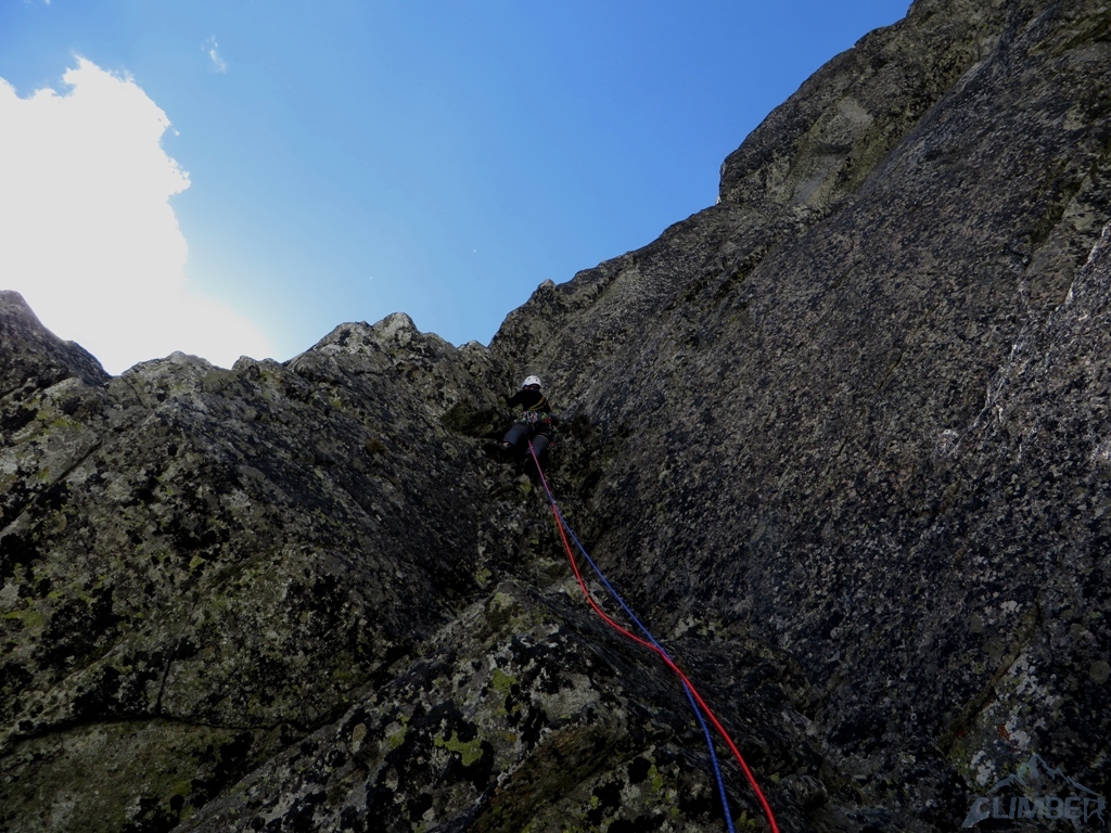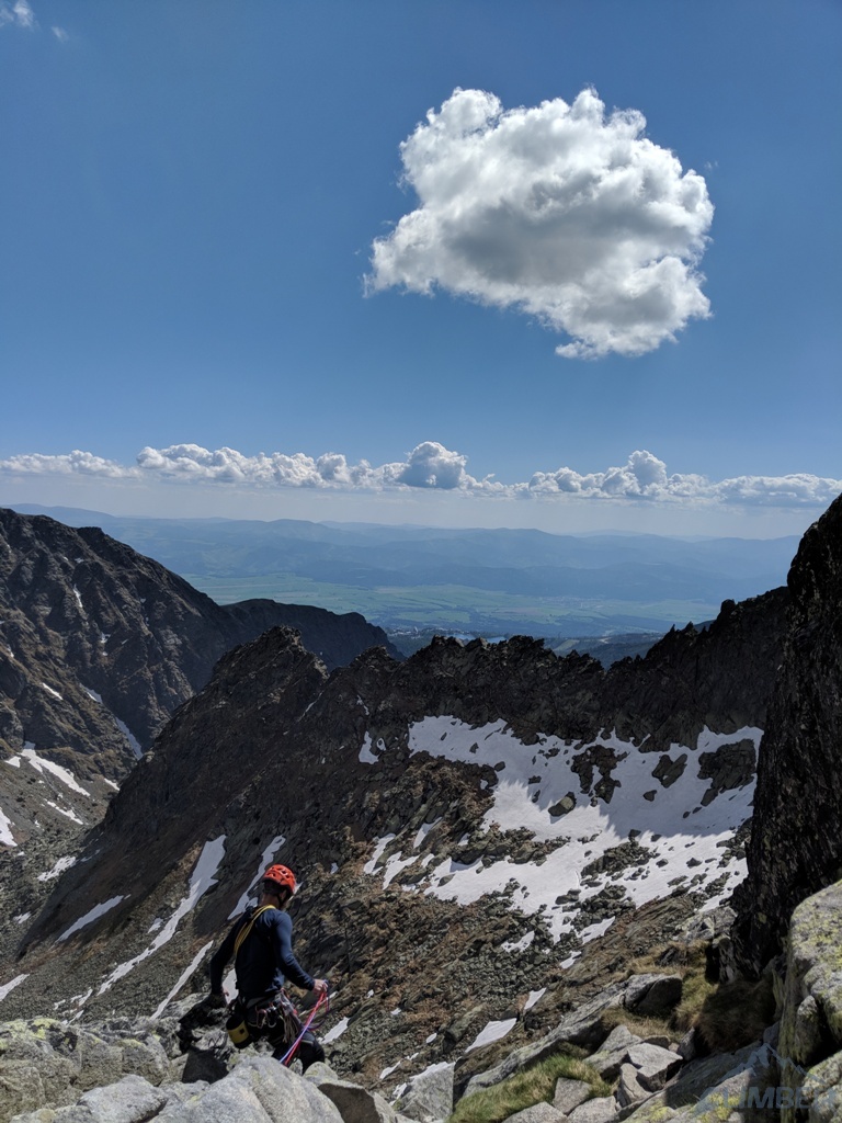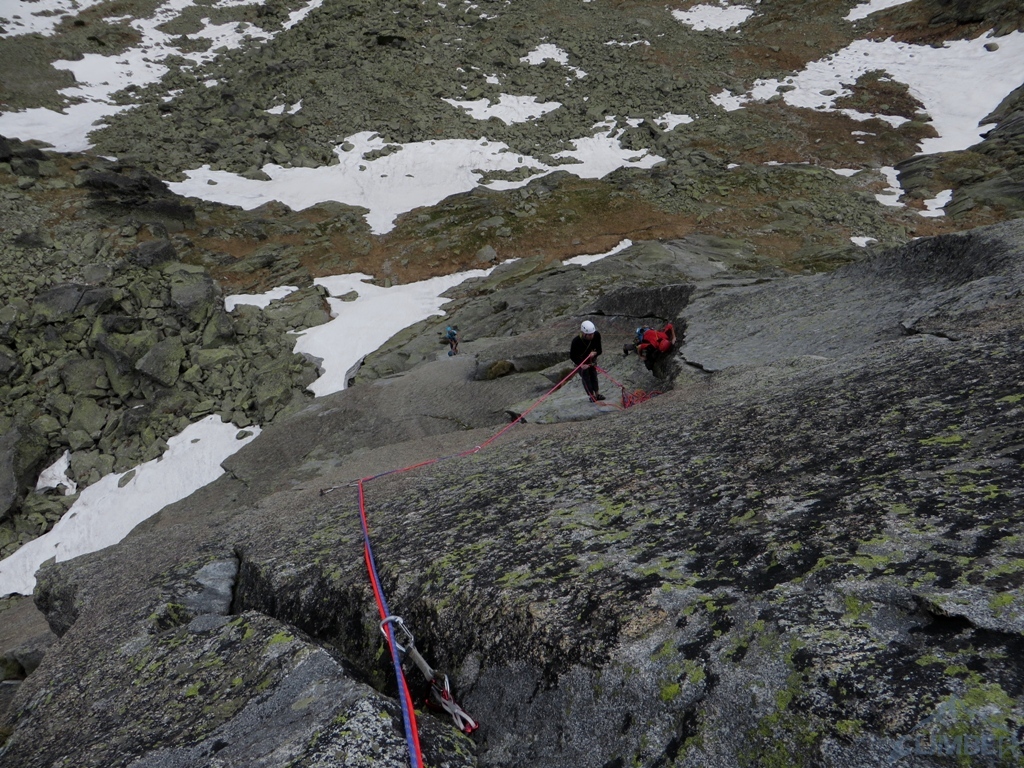 Czas na moje prowadzenie - kluczowy wyciąg (VII) prowadzi po połogiej płycie praktycznie pozbawionej chwytów - dobra praca nóg wystarcza by przejść ten odcinek (asekuracja to 3 spity na całej długości, w połowie można coś dołożyć). Po przejściu tego odcinka, droga łączy się już z Plškiem - pozostają więc na koniec dwa warianty by wyjść ze ściany. My wybieramy ten prostujący (VI), który okazuje się bardziej wymagający niż myśleliśmy - głównie przez mokre chwyty w rysie. Dajemy jednak radę i po raz drugi meldujemy się na rampie, po czym ponownie zjeżdżamy kominem. Pierwszy tegoroczny letni wspinaczkowy w dzień w Tatrach uważamy za bardzo udany 😊.