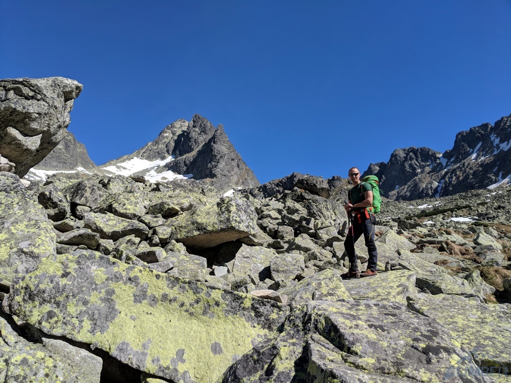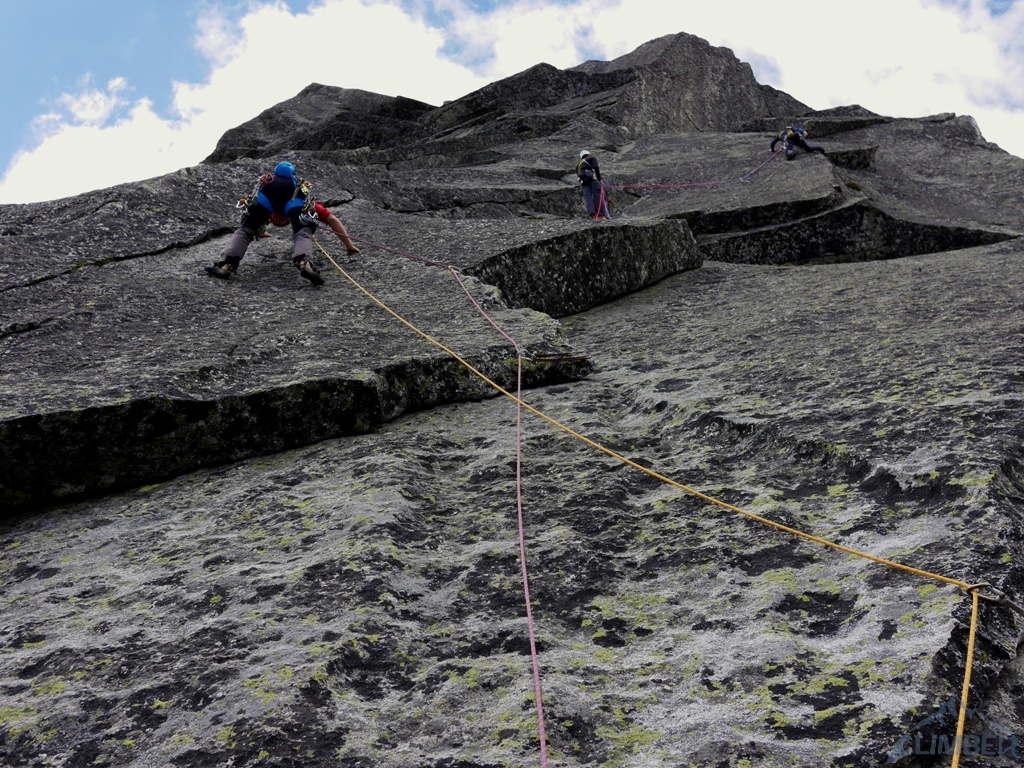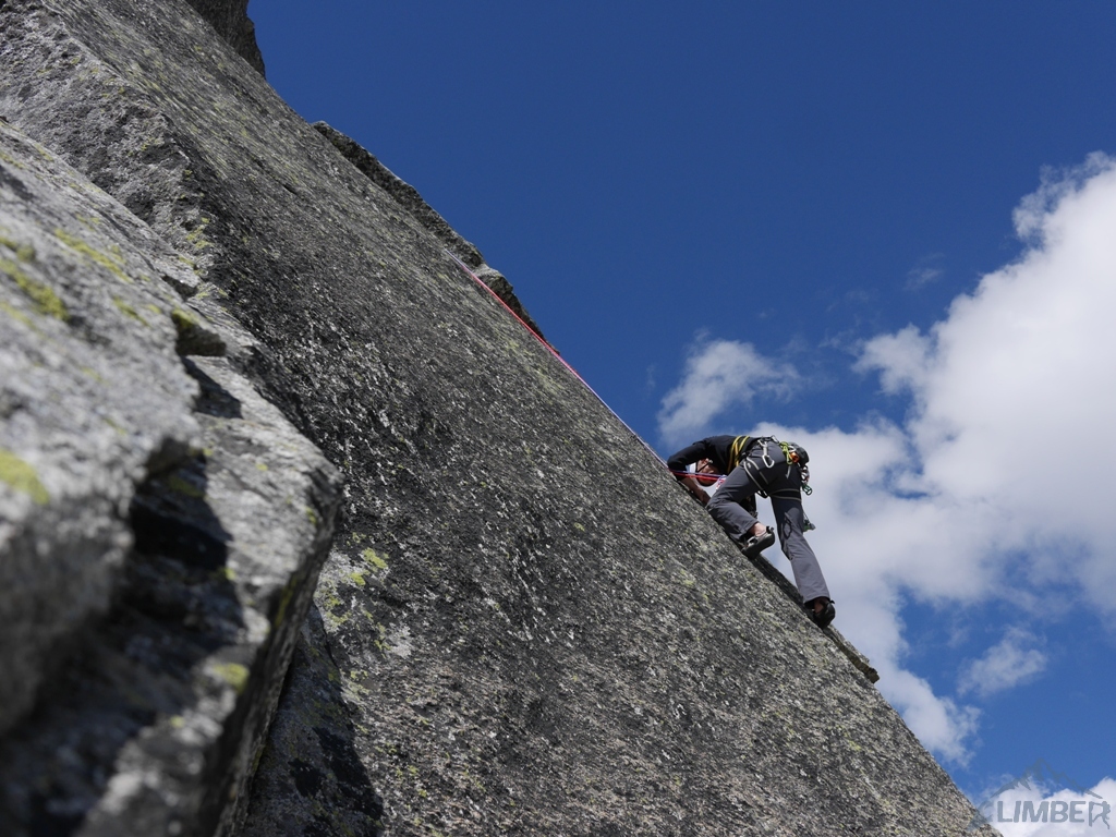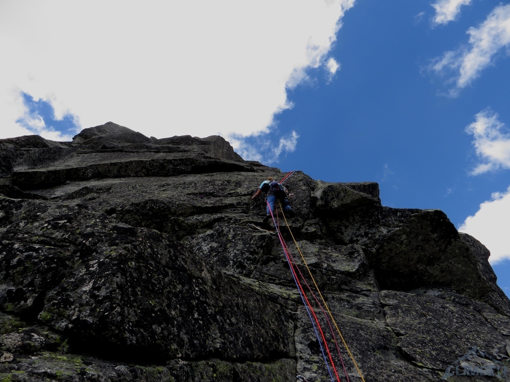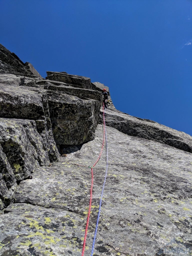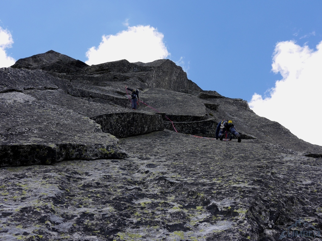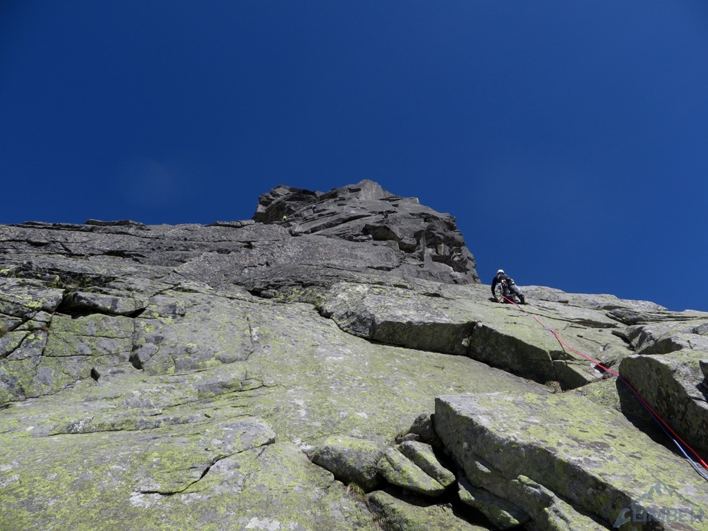 Czas na moje prowadzenie - kluczowy wyciąg (VII) prowadzi po połogiej płycie praktycznie pozbawionej chwytów - dobra praca nóg wystarcza by przejść ten odcinek (asekuracja to 3 spity na całej długości, w połowie można coś dołożyć). Po przejściu tego odcinka, droga łączy się już z Plškiem - pozostają więc na koniec dwa warianty by wyjść ze ściany. My wybieramy ten prostujący (VI), który okazuje się bardziej wymagający niż myśleliśmy - głównie przez mokre chwyty w rysie. Dajemy jednak radę i po raz drugi meldujemy się na rampie, po czym ponownie zjeżdżamy kominem. Pierwszy tegoroczny letni wspinaczkowy w dzień w Tatrach uważamy za bardzo udany 😊.
