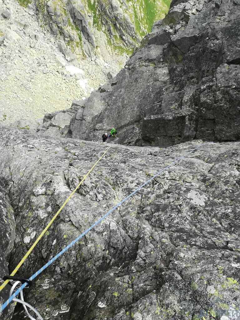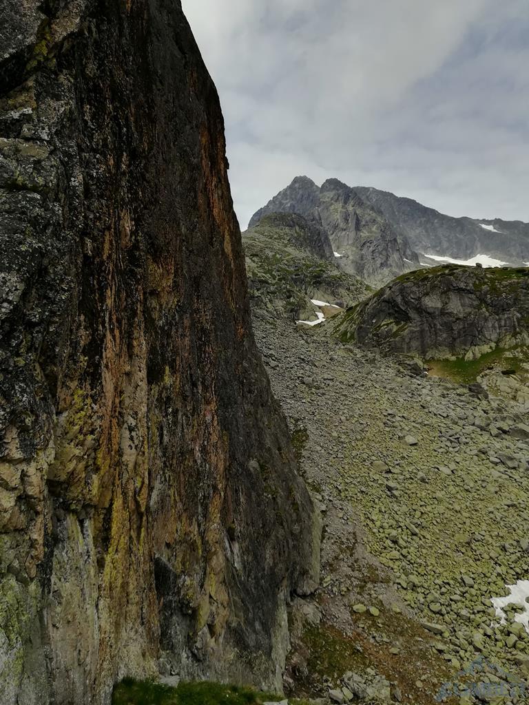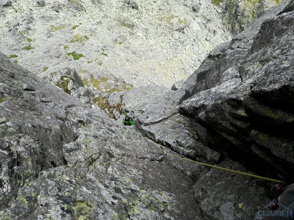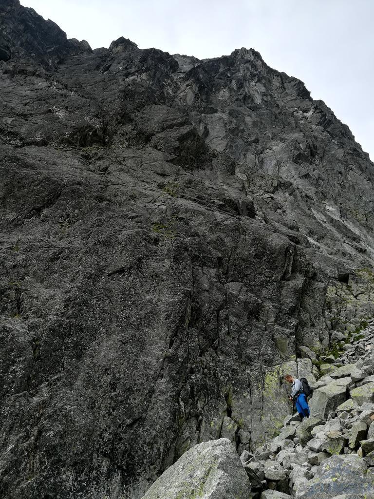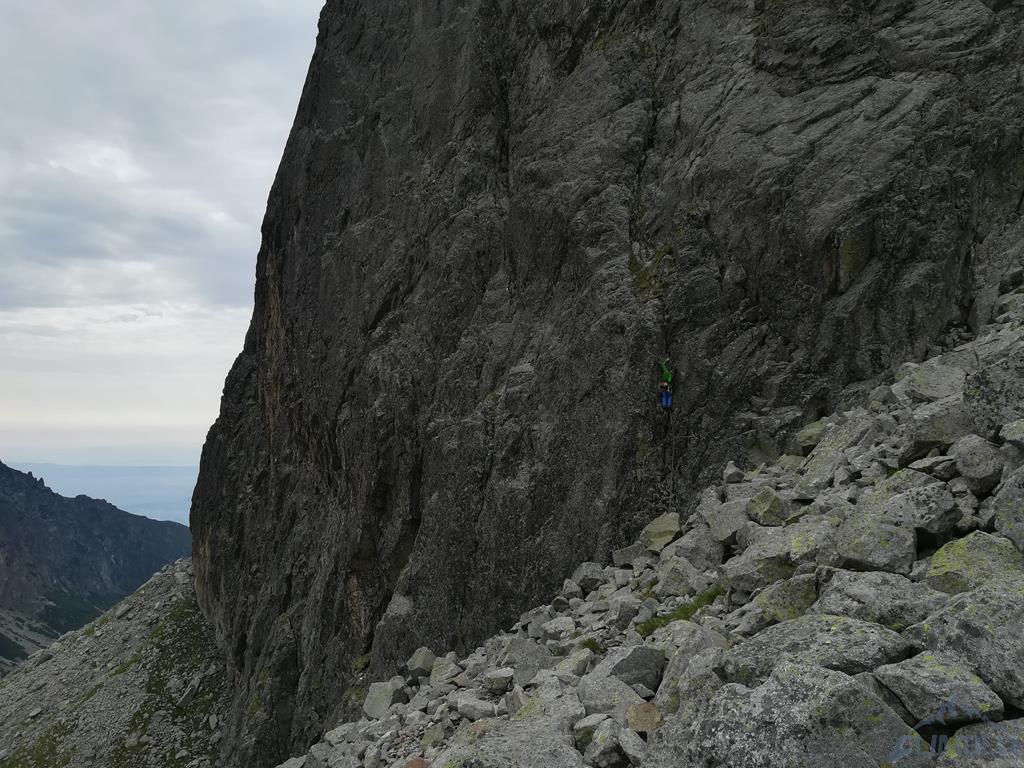 Pogoda nadal nie jest stabilna, kolejny raz w prognozach na weekend pojawiają się opady, stąd wybór ścian i dróg jest mocno ograniczony. Finalnie w składzie trzyosobowym postanawiamy wybrać się na Żółtą Ścianę - nie jest wysoka, dojście jest dogodne, więc jest duża szansa na zrobienie przynajmniej jednej drogi. Turnia zlokalizowana jest naprzeciwko Chaty Teryho, jej północno-wschodnia ściana dostępna jest wprost ze ścieżki, stąd nie raz zwracała moją uwagę gdy podchodziłem do Pięciu Stawów Spiskich - w końcu nadszedł czas żeby poznać ją z bliska. Klasykiem jest Korosadowicz (V) my jednak wybieramy drogę Platňami (Jackovič-Jakubec, VI-), mając nadzieję na przyjemne wspinanie w litej skale.