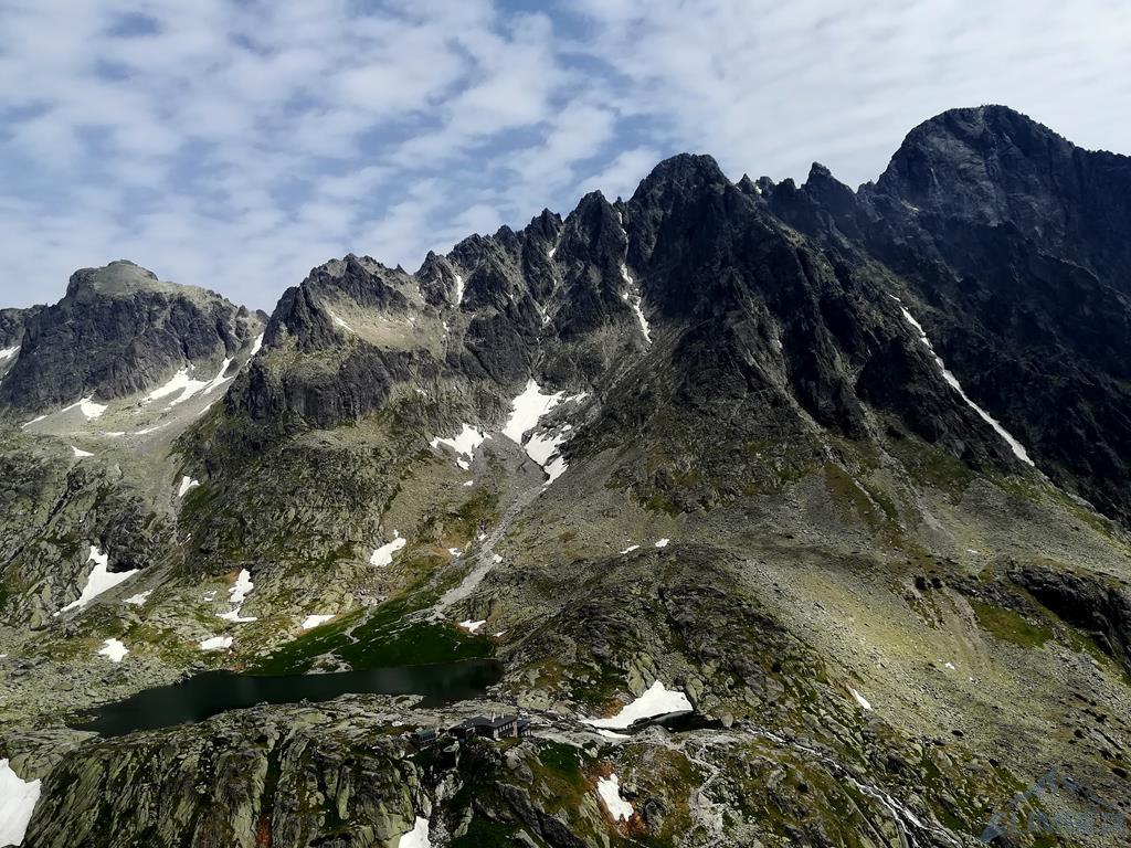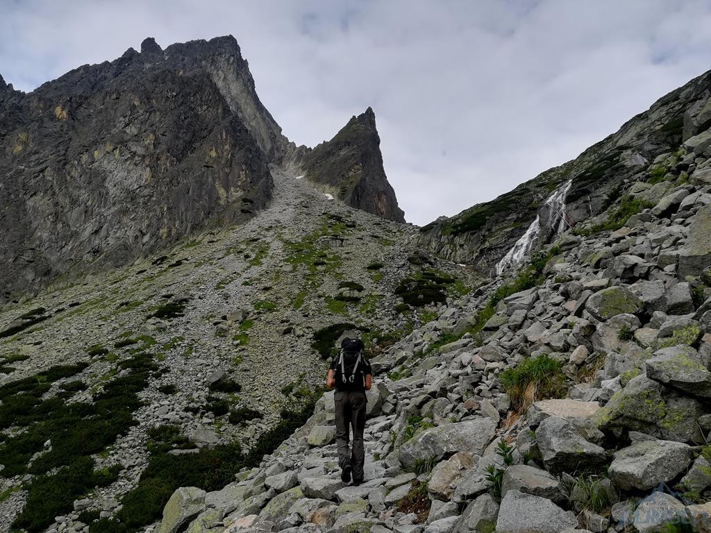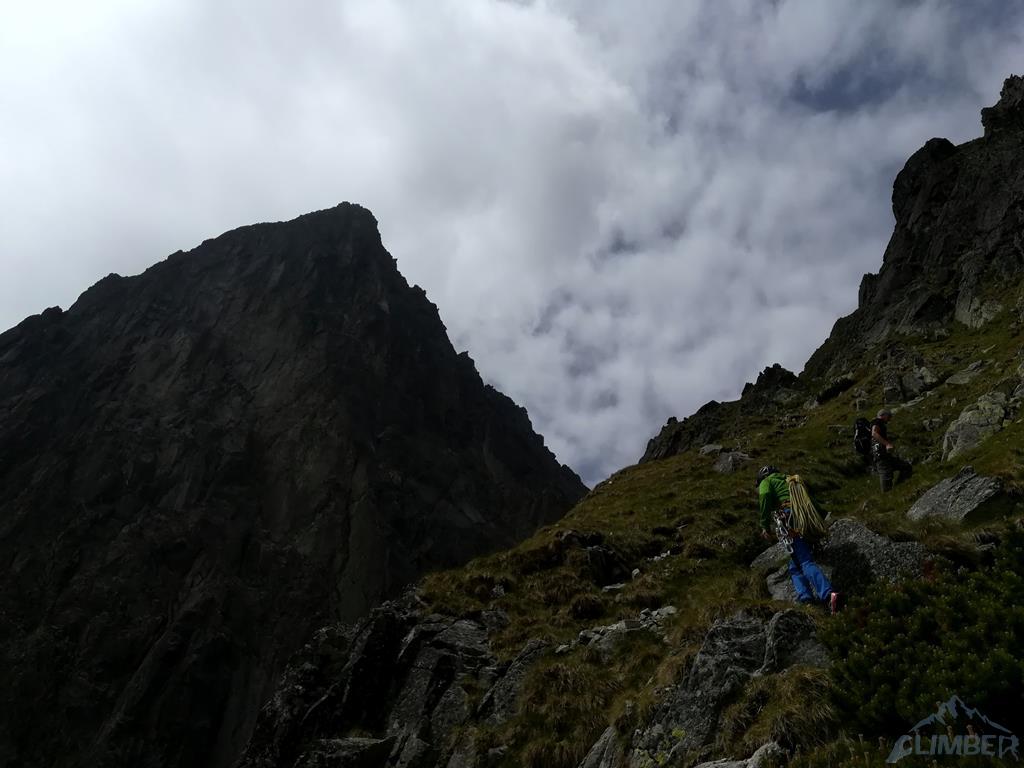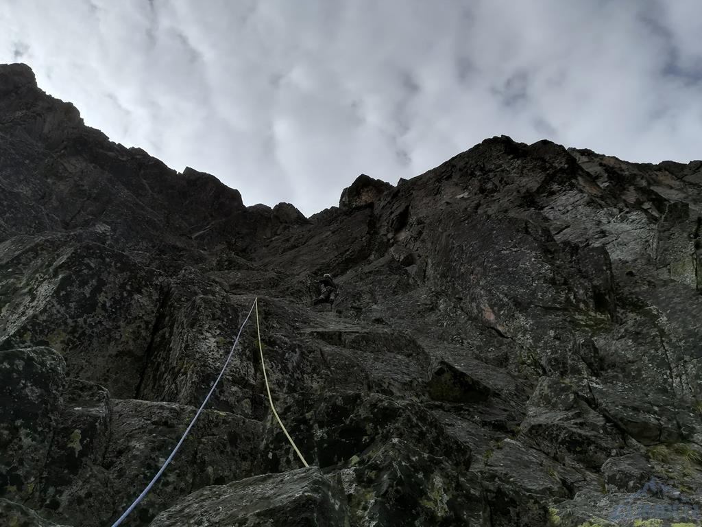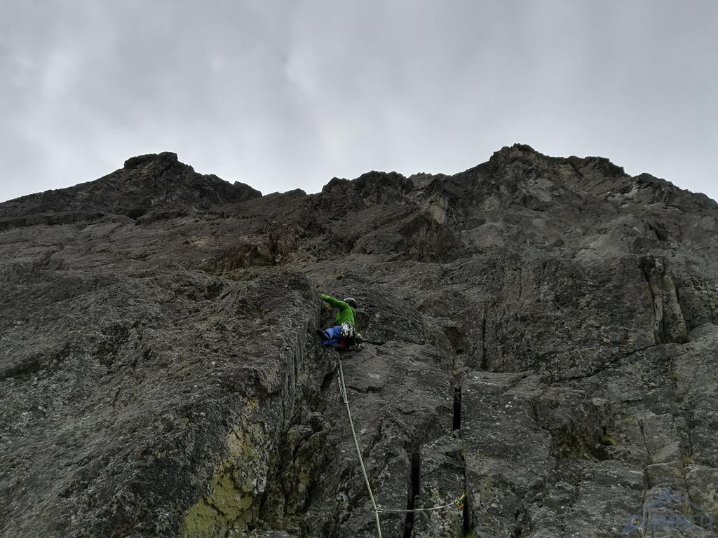 Pogoda nadal nie jest stabilna, kolejny raz w prognozach na weekend pojawiają się opady, stąd wybór ścian i dróg jest mocno ograniczony. Finalnie w składzie trzyosobowym postanawiamy wybrać się na Żółtą Ścianę - nie jest wysoka, dojście jest dogodne, więc jest duża szansa na zrobienie przynajmniej jednej drogi. Turnia zlokalizowana jest naprzeciwko Chaty Teryho, jej północno-wschodnia ściana dostępna jest wprost ze ścieżki, stąd nie raz zwracała moją uwagę gdy podchodziłem do Pięciu Stawów Spiskich - w końcu nadszedł czas żeby poznać ją z bliska. Klasykiem jest Korosadowicz (V) my jednak wybieramy drogę Platňami (Jackovič-Jakubec, VI-), mając nadzieję na przyjemne wspinanie w litej skale.
