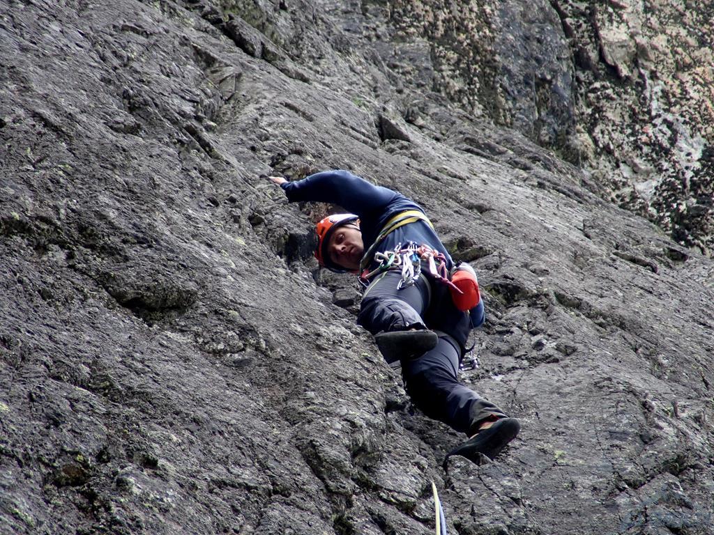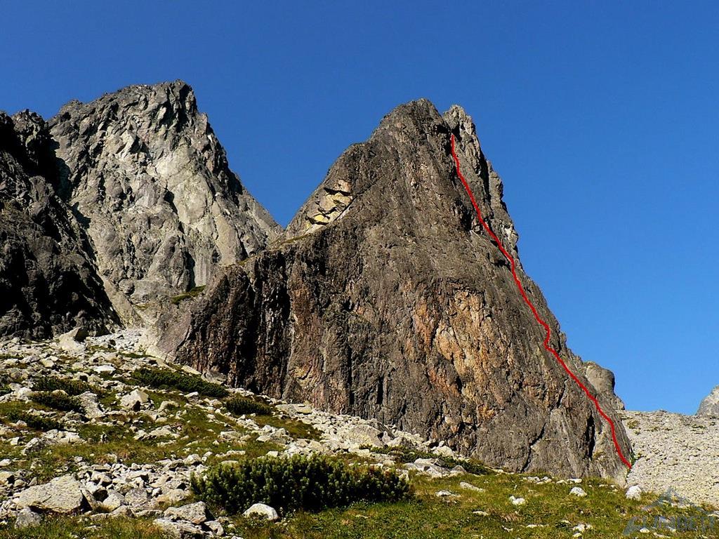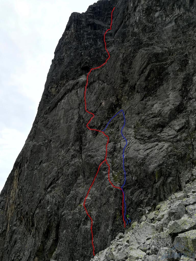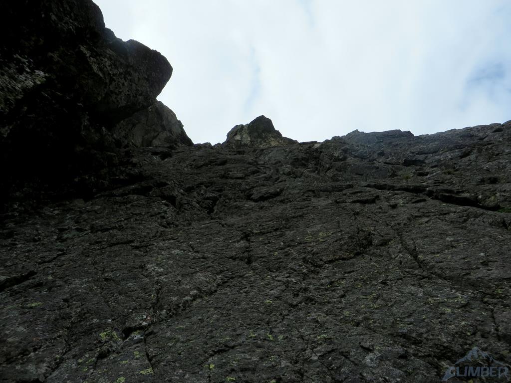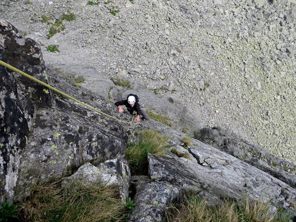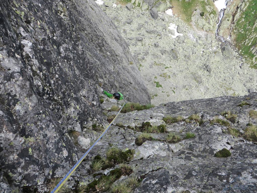Przed piątym, kluczowym wyciągiem, przejmuję prowadzenie. Na początku czujny trawers, po czym w końcu ładny odcinek do góry po płycie (trudności w miarę trzymają od V do VI-) i nadal kieruję się w prawo. Tutaj narzuca się by iść nadal do góry - powyżej jest hak i stanowisko - jak się później okaże to wariant drogi, którego nie ma w schemacie. Ja jednak idę wg topo i docieram w okolicę kolejnego stanu. Postanawiam iść dalej (szósty wyciąg) - najpierw trawers w lewo po zarośniętej płycie, po czym pionowo do góry zacięciem, które doprowadza nas do końca drogi. Po drodze wyłącznie własna asekuracja. By dostać się pod ścianę, najpierw podchodzimy do góry w stronę przełęczy, wykonujemy zjazd do żlebu i schodzimy nim dalej w dół (jest drugie stanowisko zjazdowe w razie potrzeby). Następnie obchodzimy turnię i wracamy w miejsce, gdzie rozpoczęliśmy wspinanie.