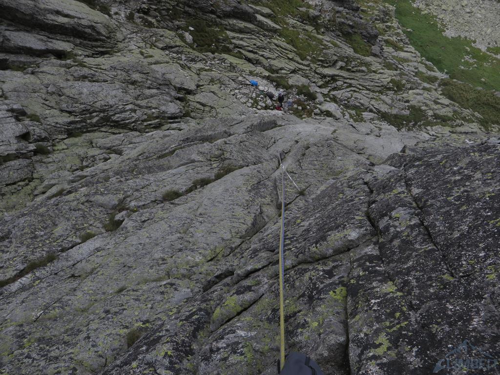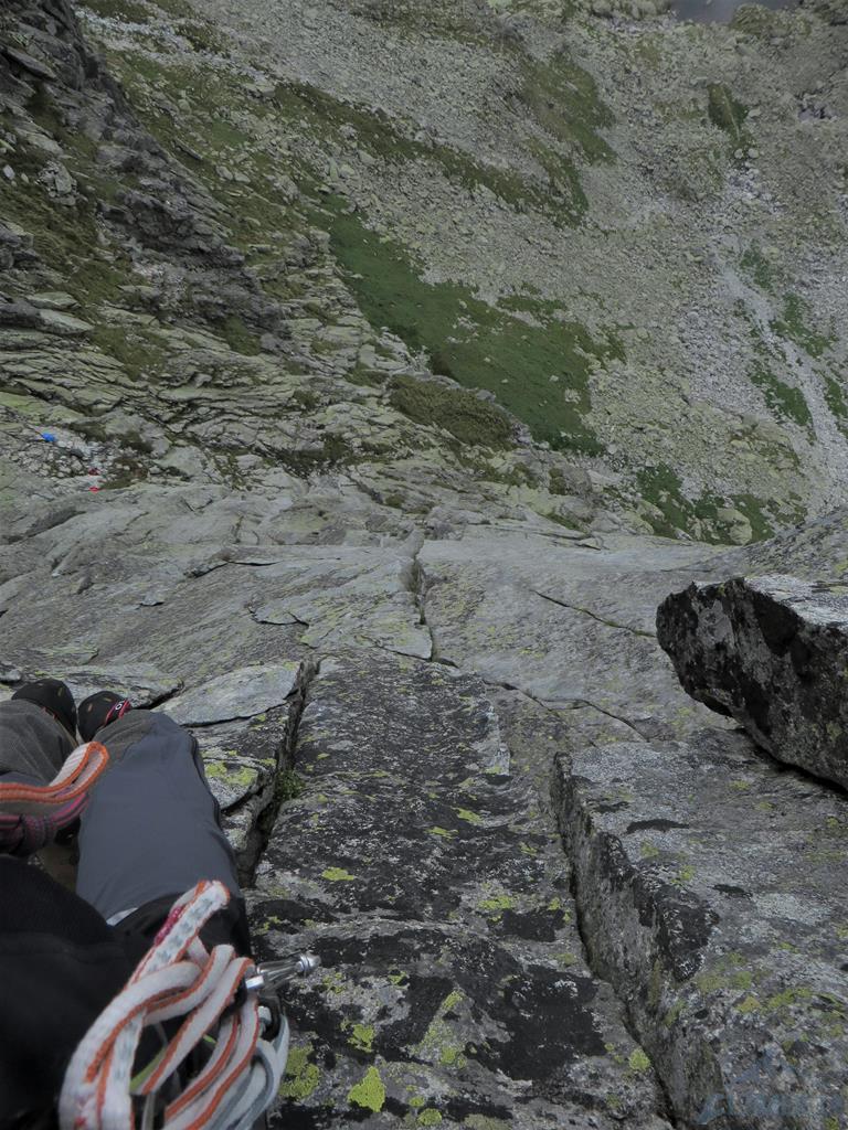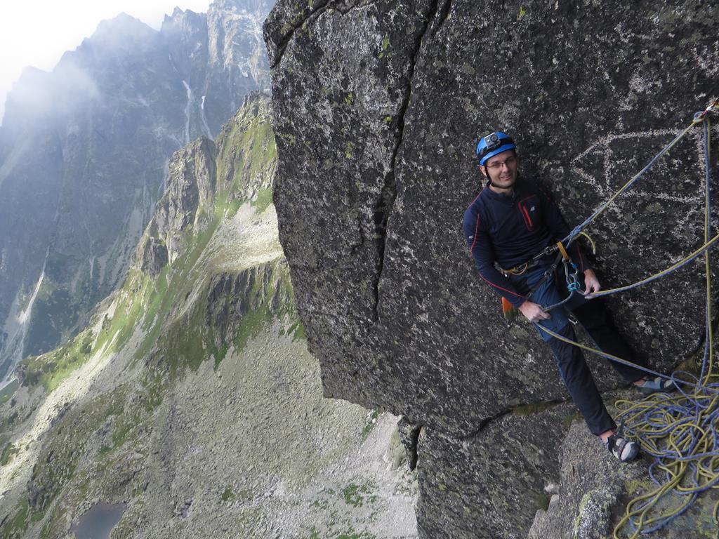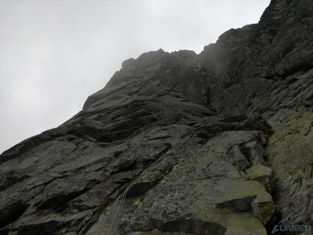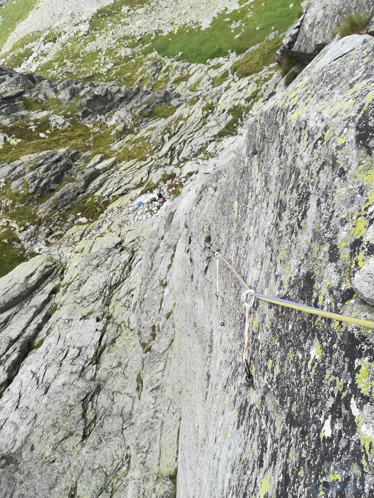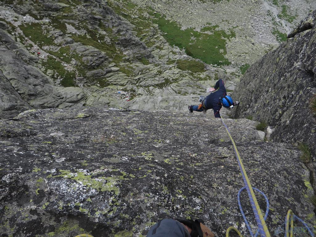 Pod ścianą chwila przerwy, rzut okiem na coraz gęstsze chmury i decyzja – próbujemy jeszcze jedną drogę. Pozostałe zespoły kończą swoje przejścia i szykują się do zjazdów płytami po lewej stronie, gdy ja znajduję się już na pierwszych metrach Hviezdovej (VI+). Trzeba się spieszyć, od razu postanawiam więc przejść dwa wyciągi (55 metrów) – pierwszy jest szybki, drugi po łatwym początku wchodzi w płytkę z rysą na której znajduje się crux (są haki). Idzie mi bardzo szybko i po chwili ściągam do siebie Łukasza, niestety gdy ten jest już pod stanem, zaczyna padać. Przez chwilę mamy nadzieję, że przejdzie, po czym zaczyna grzmieć i robi się regularna zlewa – ścianami w momencie zaczynają płynąć rzeki, a kominami wodospady. Niestety wisimy na dwóch hakach (trzeci wyciągam palcami 😉), zostawiam więc starą taśmę i mailona. Leje okrutnie dlatego zjazd trochę nam zajmuje, w końcu jednak wracamy pod ścianę i pomagamy parze znajomych z zaklinowaną liną (dwa pozostałe zespoły zdążyły już uciec).