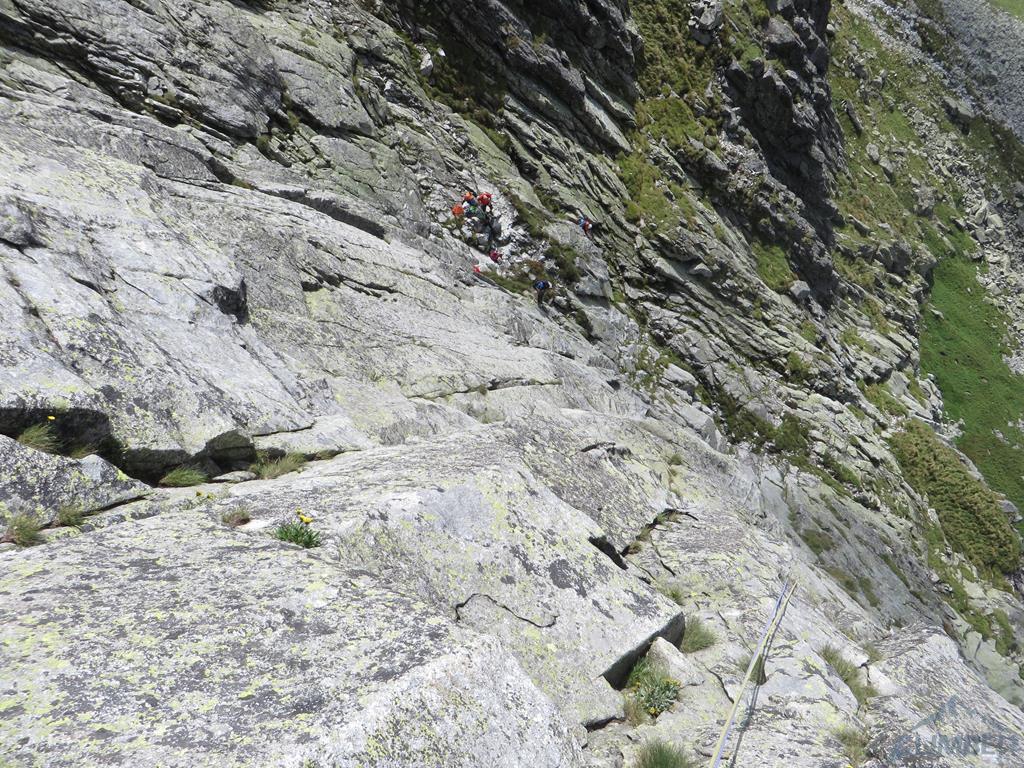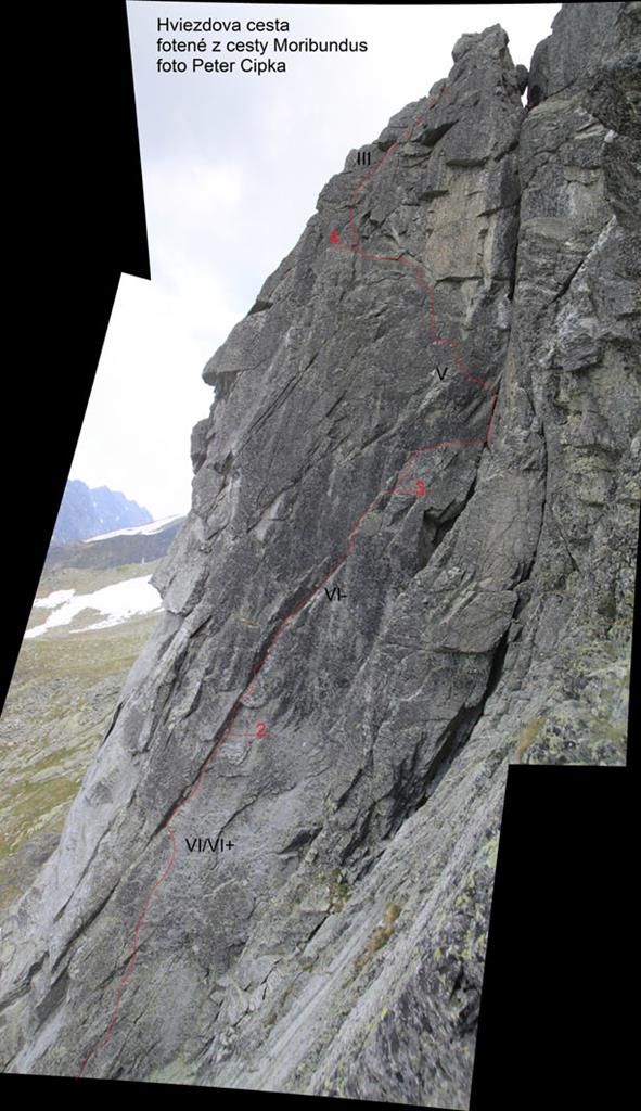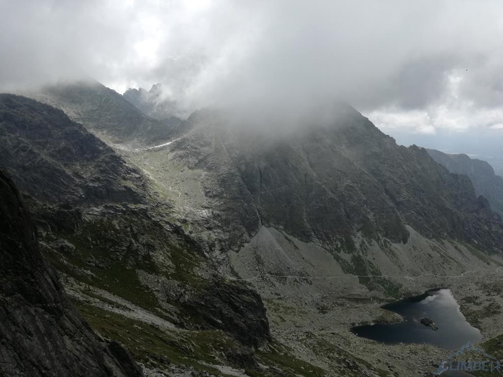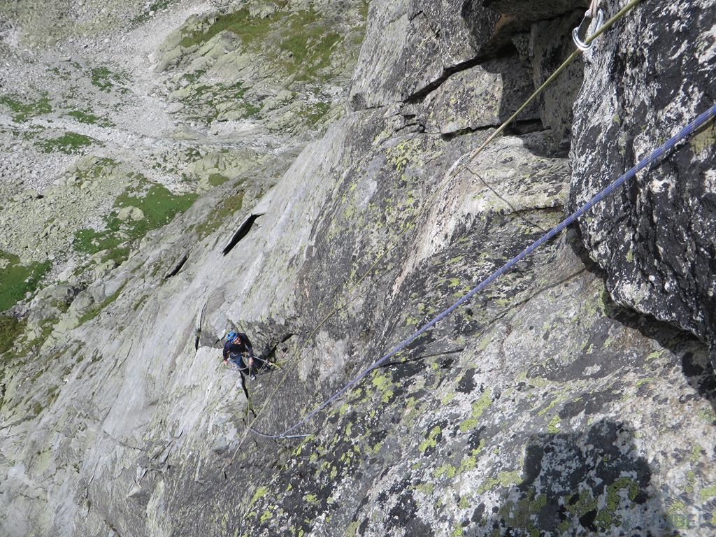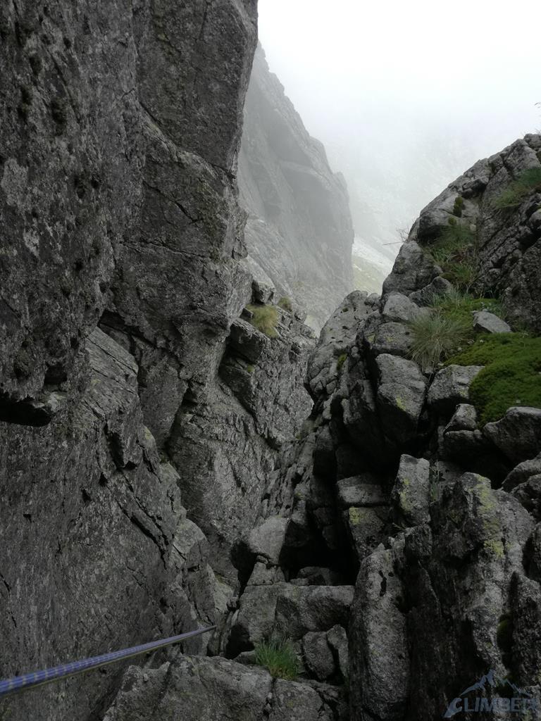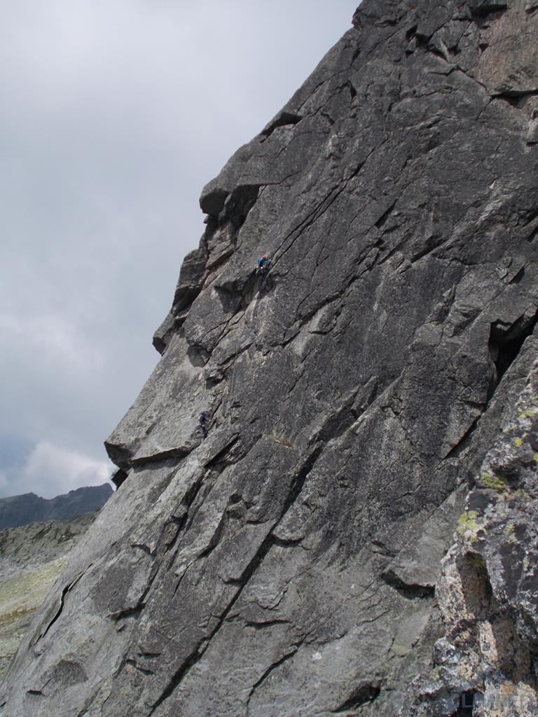 Pod ścianą chwila przerwy, rzut okiem na coraz gęstsze chmury i decyzja – próbujemy jeszcze jedną drogę. Pozostałe zespoły kończą swoje przejścia i szykują się do zjazdów płytami po lewej stronie, gdy ja znajduję się już na pierwszych metrach Hviezdovej (VI+). Trzeba się spieszyć, od razu postanawiam więc przejść dwa wyciągi (55 metrów) – pierwszy jest szybki, drugi po łatwym początku wchodzi w płytkę z rysą na której znajduje się crux (są haki). Idzie mi bardzo szybko i po chwili ściągam do siebie Łukasza, niestety gdy ten jest już pod stanem, zaczyna padać. Przez chwilę mamy nadzieję, że przejdzie, po czym zaczyna grzmieć i robi się regularna zlewa – ścianami w momencie zaczynają płynąć rzeki, a kominami wodospady. Niestety wisimy na dwóch hakach (trzeci wyciągam palcami 😉), zostawiam więc starą taśmę i mailona. Leje okrutnie dlatego zjazd trochę nam zajmuje, w końcu jednak wracamy pod ścianę i pomagamy parze znajomych z zaklinowaną liną (dwa pozostałe zespoły zdążyły już uciec).