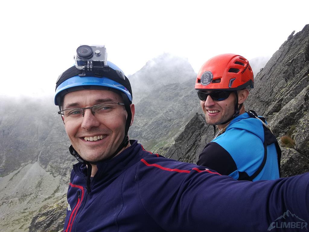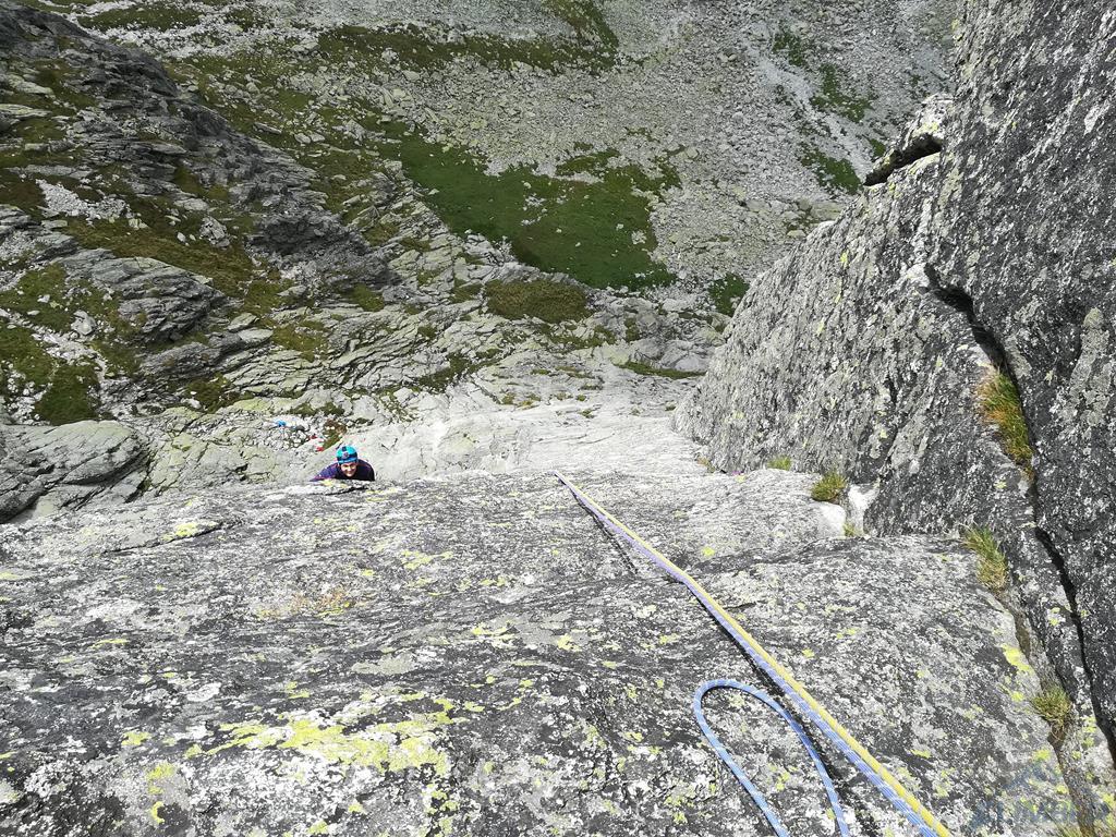Zaczynam pierwszy – trawersuję pod małe przewieszki i nad nimi dochodzę do stanowiska. Następnie na prowadzenie swojego pierwszego tatrzańskiego wyciągu rusza Łukasz – trafia mu się bardzo ciekawa rysa za VI i krótkie zacięcie wyprowadzające pod kluczowe trudności (robi 2 wyciągi wg schematu). Wracam na prowadzenie – na początek piątkowa płyta, później ciekawe przejście na podchwytach (haki) za VI i przewinięcie między okapikami, po którym czeka najtrudniejszy fragment (jest spit). Na moje nieszczęście trawers rozpoczynam za nisko i utrudniam sobie sprawę – idę właściwie „po niczym”, a jedyne chwyty jakie znajduję to dwa małe kryształki 😊. Jestem bliski lotu ale finalnie udaje mi się pokonać to miejsce i wejść w zacięcie (VI), którym od razu kontynuuję dalej. Ściągam Łukasza i cieszę się, że stanowisko jest na ringach bo kolega dwa razy mi je testuje, a po przechodzę ostatnie metry drogi i wpinam się do łańcucha nad Kominem Puškáša.