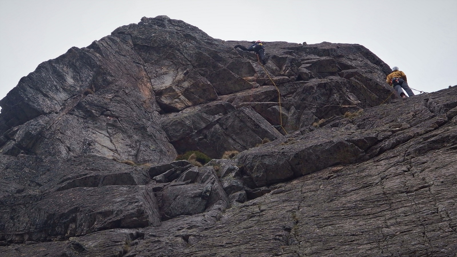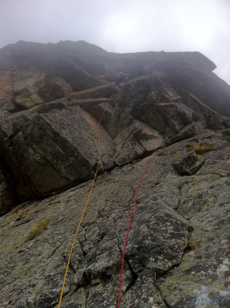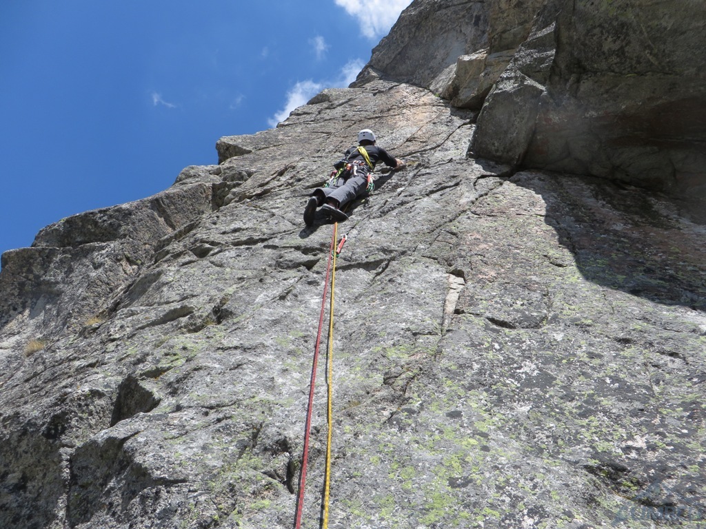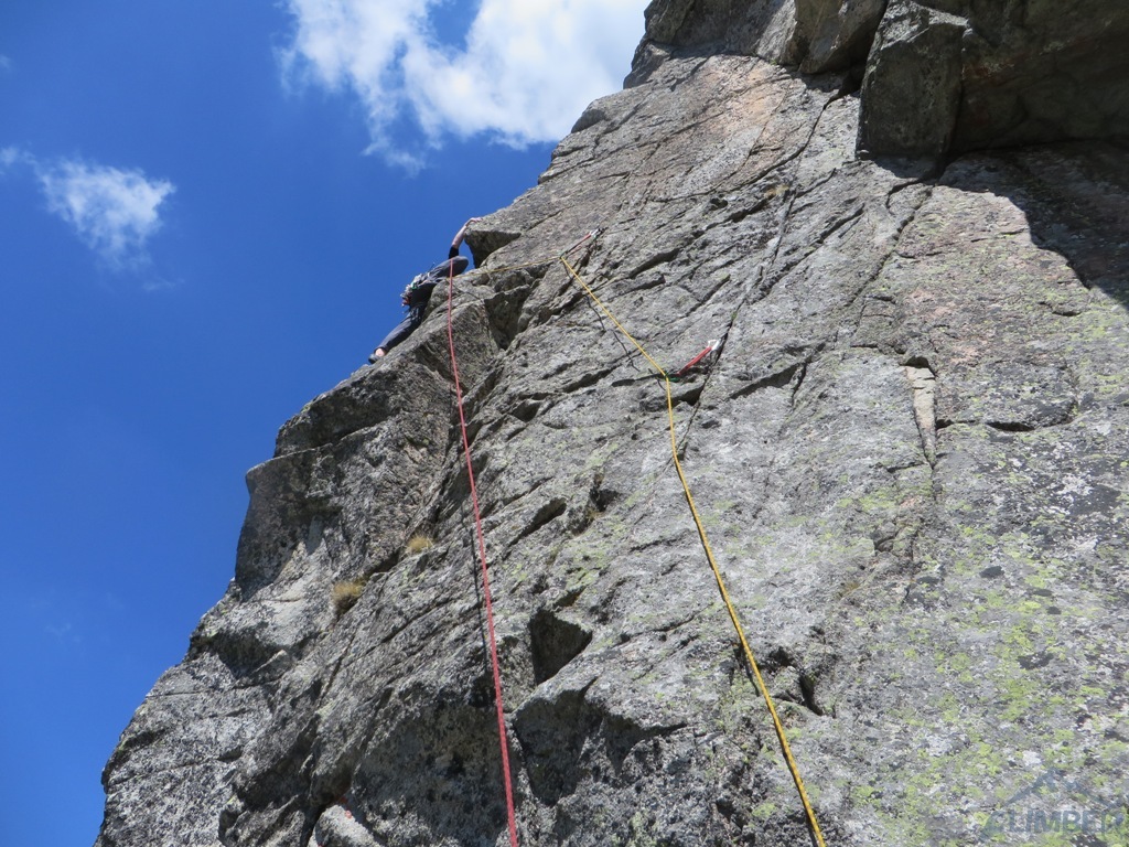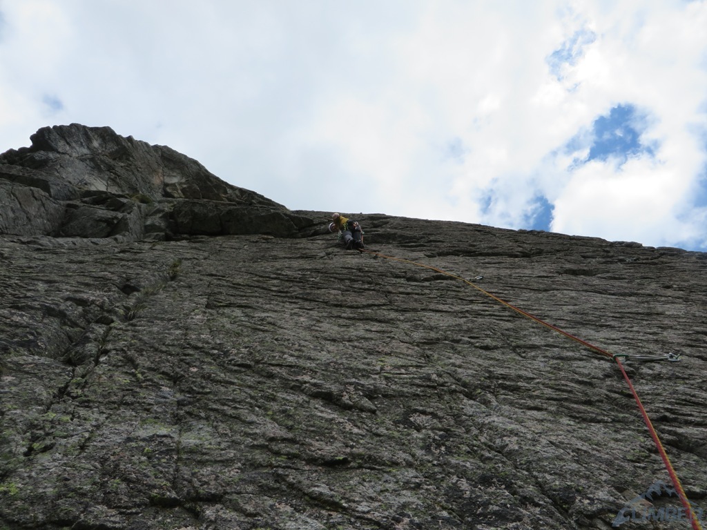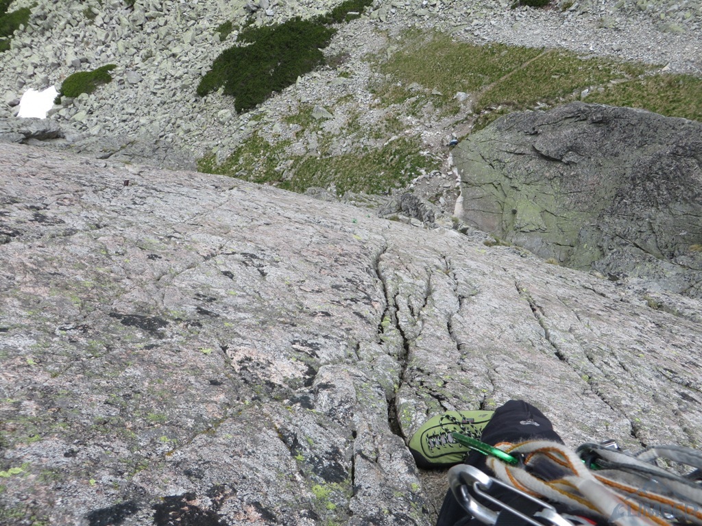 Obaj chcemy prowadzić kluczowy odcinek, a żaden za nas nie chce kolejnego - wyglądającego niezbyt przyjaźnie okapu za VI+ dlatego pozostawiamy decyzję losowi – Grzesiek wygrywa... Szybko przebiegam pierwszy łatwy wyciąg i przekazuję prowadzenie koledze. Płytowy wyciąg jest piękny i zajmujący, obicie nie jest sportowe więc trzeba dokładać małe friendy i kostki lub decydować się na kilkumetrowe run-outy. Na szczęście Grzesiek bardzo dobrze sobie radzi i stwierdza, że wycena jest zawyżona 😊. Idę za nim i również udaje mi się zaliczyć czyste przejście. Co prawda mam kiepskie (duże) buty bo nie szykowałem się na takie trudności, dlatego problemem jest ustanie małych lub tarciowych stopni, jednakże krawądki okazują się bardzo dobre. I faktycznie, mimo iż to moja "życiówka", zdarzały się wyciągi VI+, które dały bardziej popalić - można więc śmiało cisnąć!