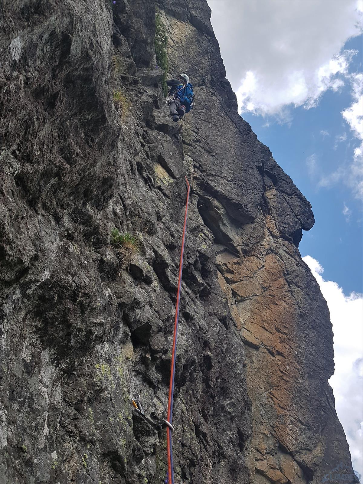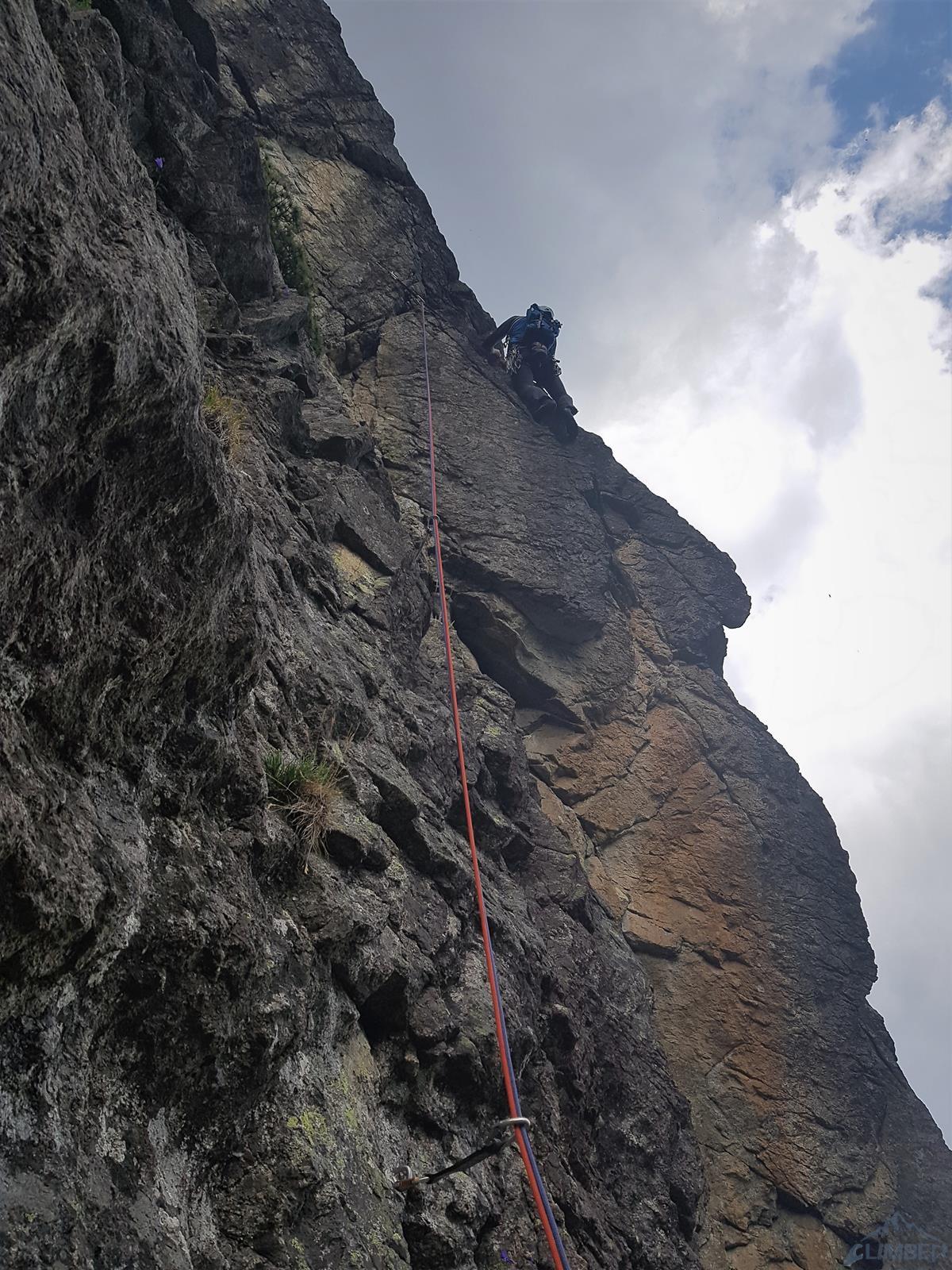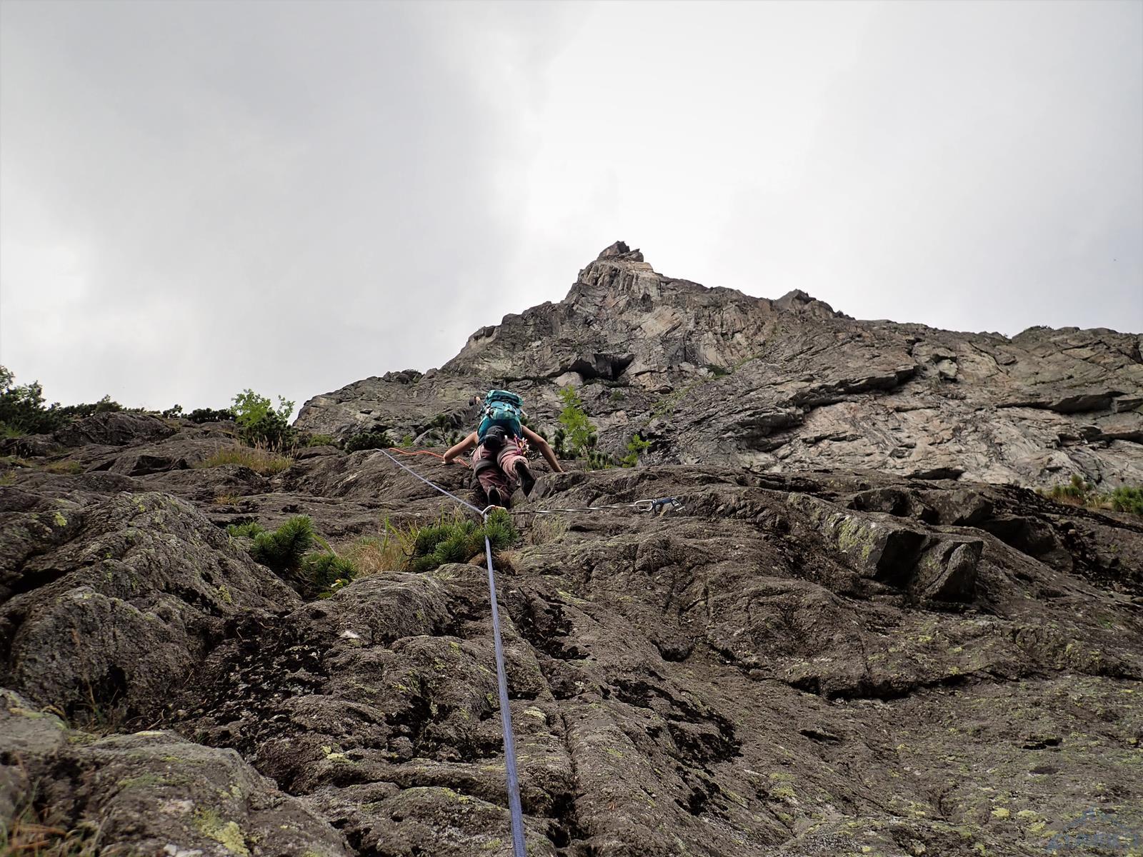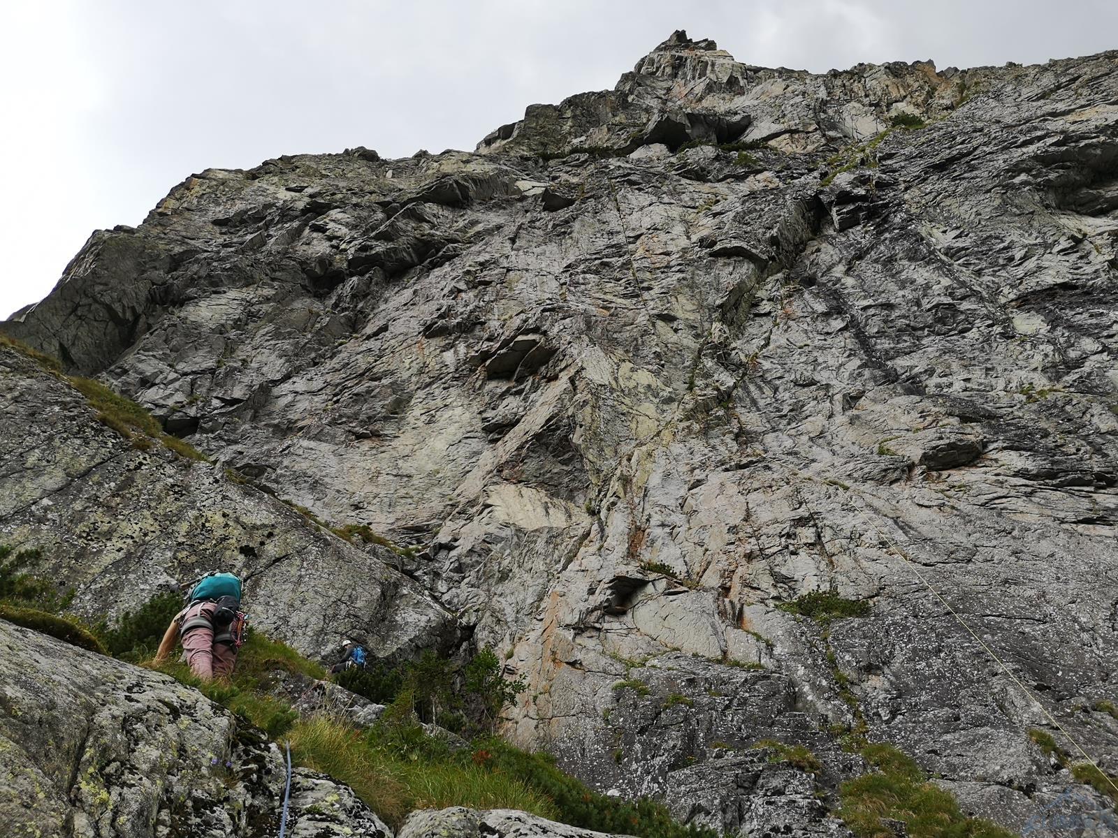 Dotarcie pod ścianę nie oznacza jednak w przypadku Młynarczyka dotarcia pod drogi, te bowiem w większości startują 50 metrów wyżej, u szczytu wielkiego trawiasto-skalnego progu… Najsłabszym punktem progu jest czwórkowy, parchaty przewieszający się kominek, który należy pokonać by dostać się wyżej. Na topo ściany zaznaczona jest w tym miejscu poręczkówka, na miejscu okazuje się jednak, że leży poniżej… W kominku dziś mocno się leje, brak asekuracji, a próba jego przejścia w wykonaniu Szymona kończy się ryzykownym wycofem. Trochę nam wstyd, że pokonał nas czwórkowy teren, brak poręczówki w tym miejscu to jednak duże niebezpieczeństwo – lot z kominka grozi co najmniej poważnym połamaniem. Nie poddajemy się jednak i proponuję inną opcję dojściową – pokonanie dwóch pierwszych wyciągów z drogi Pasja, startującej z chaszczy pod ścianą.