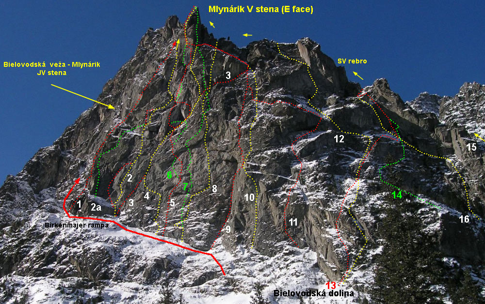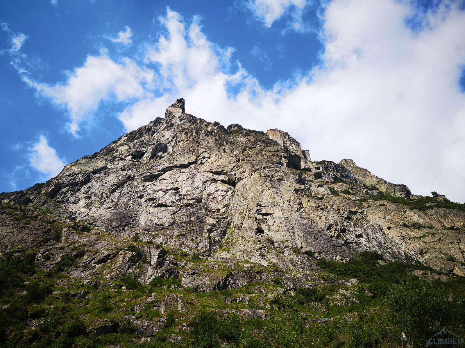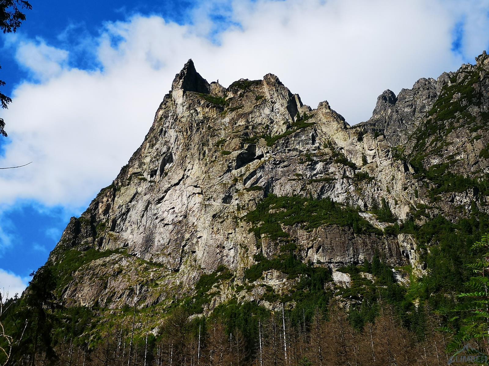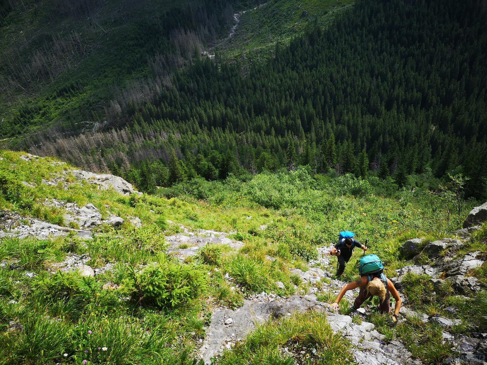 Dotarcie pod ścianę nie oznacza jednak w przypadku Młynarczyka dotarcia pod drogi, te bowiem w większości startują 50 metrów wyżej, u szczytu wielkiego trawiasto-skalnego progu… Najsłabszym punktem progu jest czwórkowy, parchaty przewieszający się kominek, który należy pokonać by dostać się wyżej. Na topo ściany zaznaczona jest w tym miejscu poręczkówka, na miejscu okazuje się jednak, że leży poniżej… W kominku dziś mocno się leje, brak asekuracji, a próba jego przejścia w wykonaniu Szymona kończy się ryzykownym wycofem. Trochę nam wstyd, że pokonał nas czwórkowy teren, brak poręczówki w tym miejscu to jednak duże niebezpieczeństwo – lot z kominka grozi co najmniej poważnym połamaniem. Nie poddajemy się jednak i proponuję inną opcję dojściową – pokonanie dwóch pierwszych wyciągów z drogi Pasja, startującej z chaszczy pod ścianą.