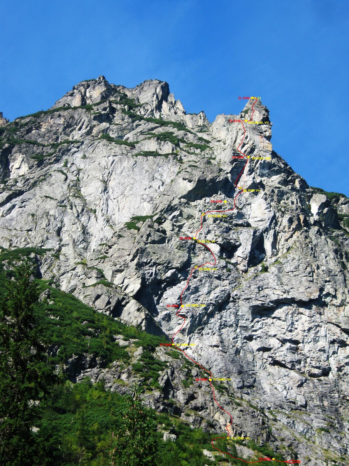 Nie daliśmy rady wejść za IV, wchodzimy więc za VII- 😉 Obicie na pierwszym wyciągu okazuje się mocno górskie, Szymon jednak staje na wysokości zadania i nie bez problemów, ale jednak go przechodzi. Drugi wyciąg jest łatwiejszy (IV+) i po jego pokonaniu nareszcie (po 4 godzinach!) stajemy pod Szewską Pasją. Niestety jest za późno (za 2-3 godziny ma padać) by w drogę wchodzić, poza tym straciliśmy za dużo energii i nerwów by mieć jakiekolwiek szanse. Wdrażamy plan awaryjny – kosówkami i gęstymi trawami (tym razem już w ścianie), trawersujemy pod Lewy Filar (VI). Dostajemy jednak kolejnego pstryczka – pierwszy wyciąg jest mocno zalany i próba jego sforsowania kończy się wycofem. Ostatecznie poddajemy się i trzema długimi zjazdami wracamy w krzaki pod ścianę.