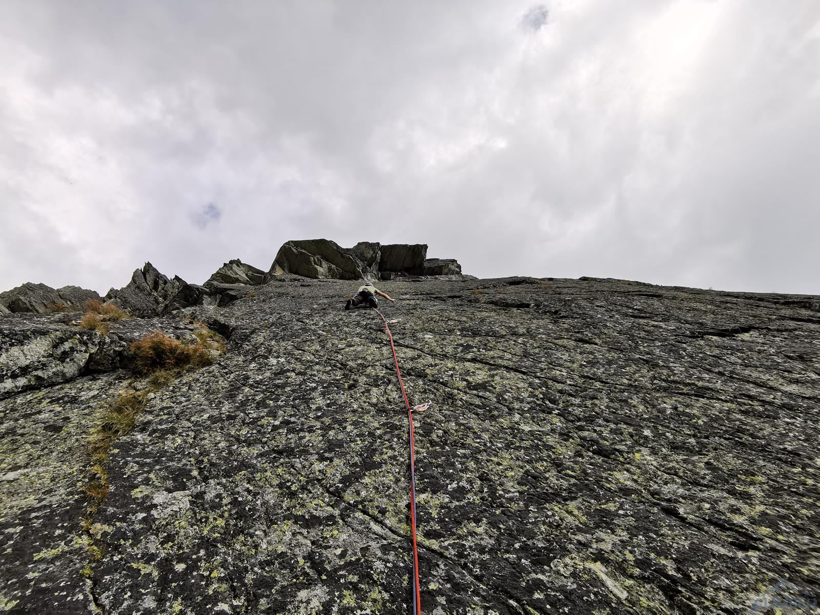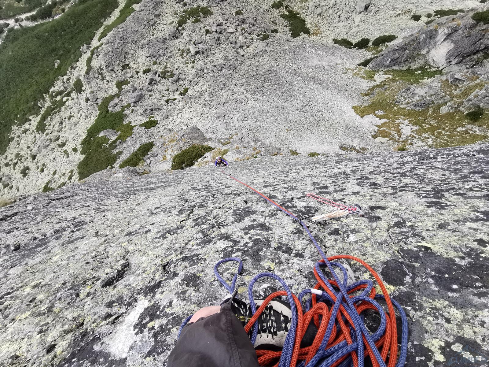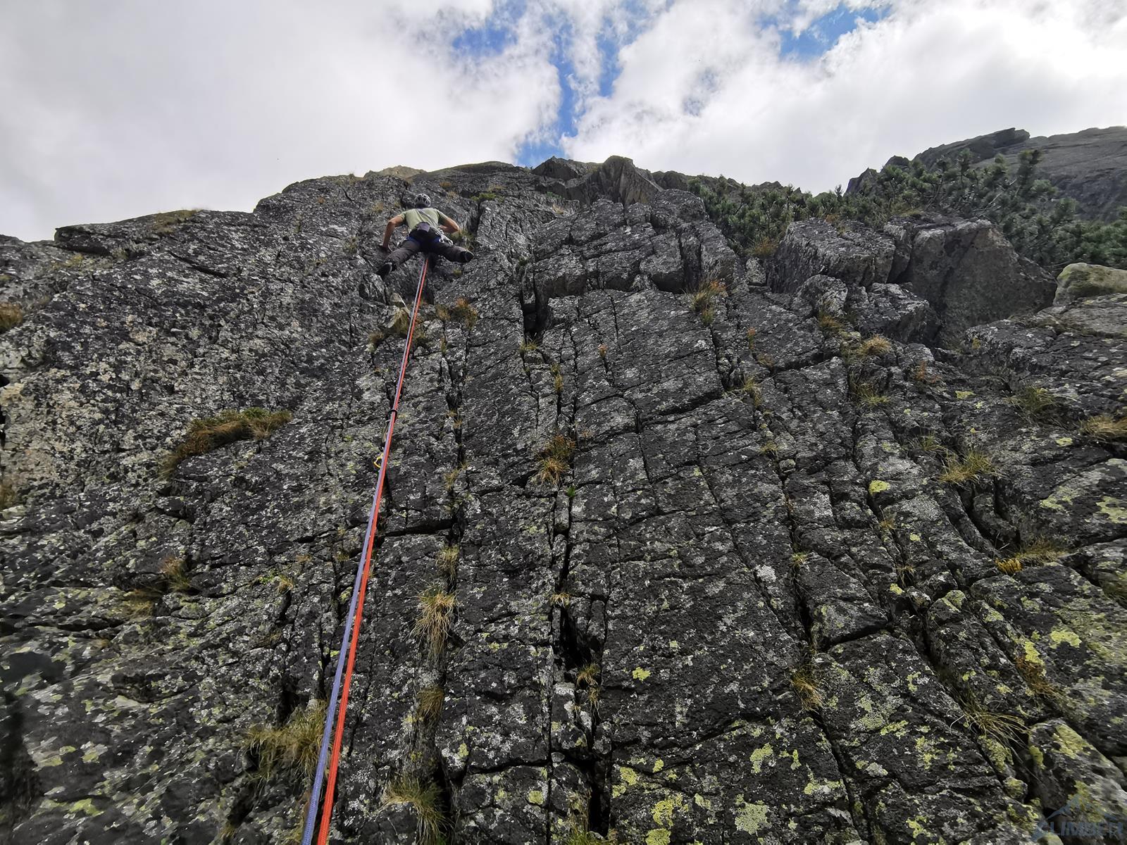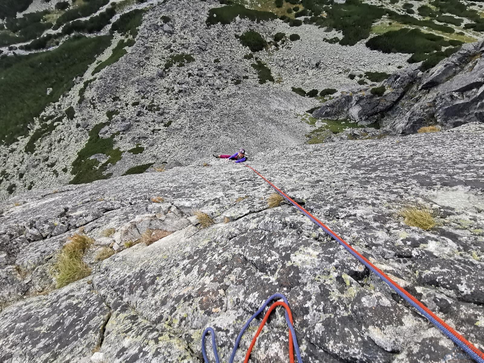 Parchy zrobione, oddaję więc prowadzenie Ani, która ma prowadzić trudności na naszej pierwszej dziś drodze. Płyta nad nami wygląda fajnie, niestety jest mocno porośnięta – buty aż trzeszczą 😊. Startujemy skośnie w lewo, co nie jest takie oczywiste – nie ma żadnego haka, te po prawej pochodzą bowiem ze wspominanej już drogi idącej obok, nowa linia wciska się więc trochę na siłę. Kilka ładnych choć niepewnych (przez porosty) ruchów za V+ doprowadza nas do trawiastej półeczki, z której kontynuujemy do góry ewidentną rysą. Po wyjściu w łatwy teren (ok. 30m) możemy skorzystać z ringa i zrobić stanowisko, lub podejść do kolejnego 20 metrów – skośnie w prawo łatwym terenem. Przed nami kluczowy wyciąg (VI+) – do tej pory na drodze nie było prawie nic, tutaj na krótkim trudniejszym odcinku mamy aż 5 spitów, co wydaje nam się mocno psuć górski charakter drogi. Ania pewnie przechodzi czujne ruchy w trawersie i wydostaje się w łatwiejszy teren, którym szybko dociera do końca drogi (stan na jednym z bloków). Drogi generalnie nie polecamy – sporo kruchego i brzydkiego terenu, najlepszy fragment płytą porośnięty, ładny ale krótki odcinek w trudnościach i po wszystkim. Schodzimy żlebem pomiędzy ścianami, dzięki czemu po 15 minutach stajemy pod drugą zaplanowaną na dziś drogą.