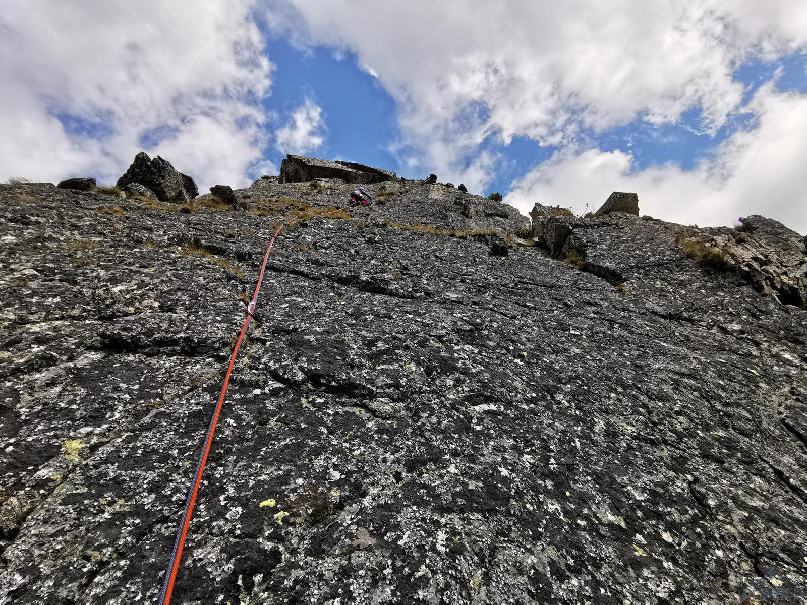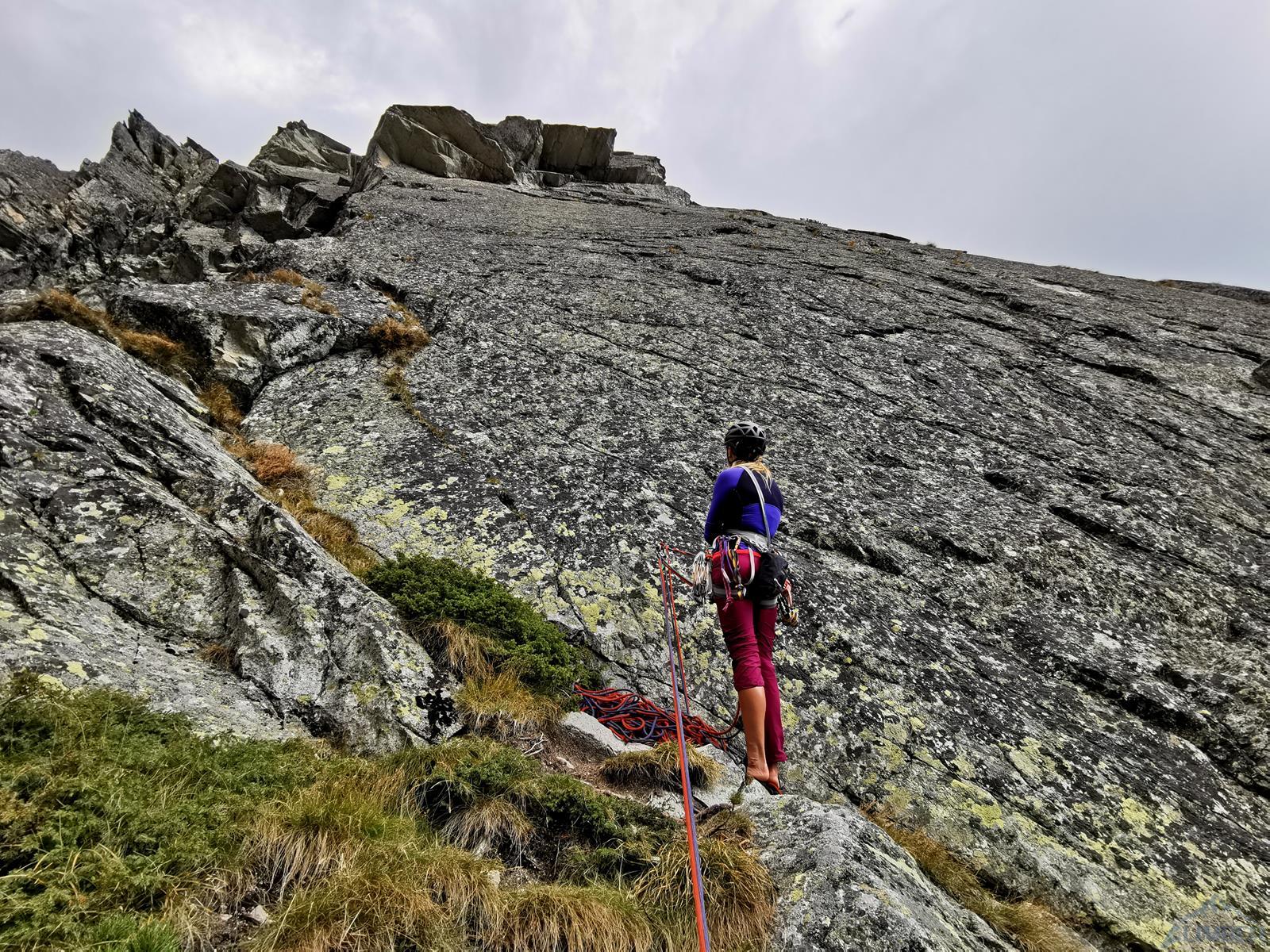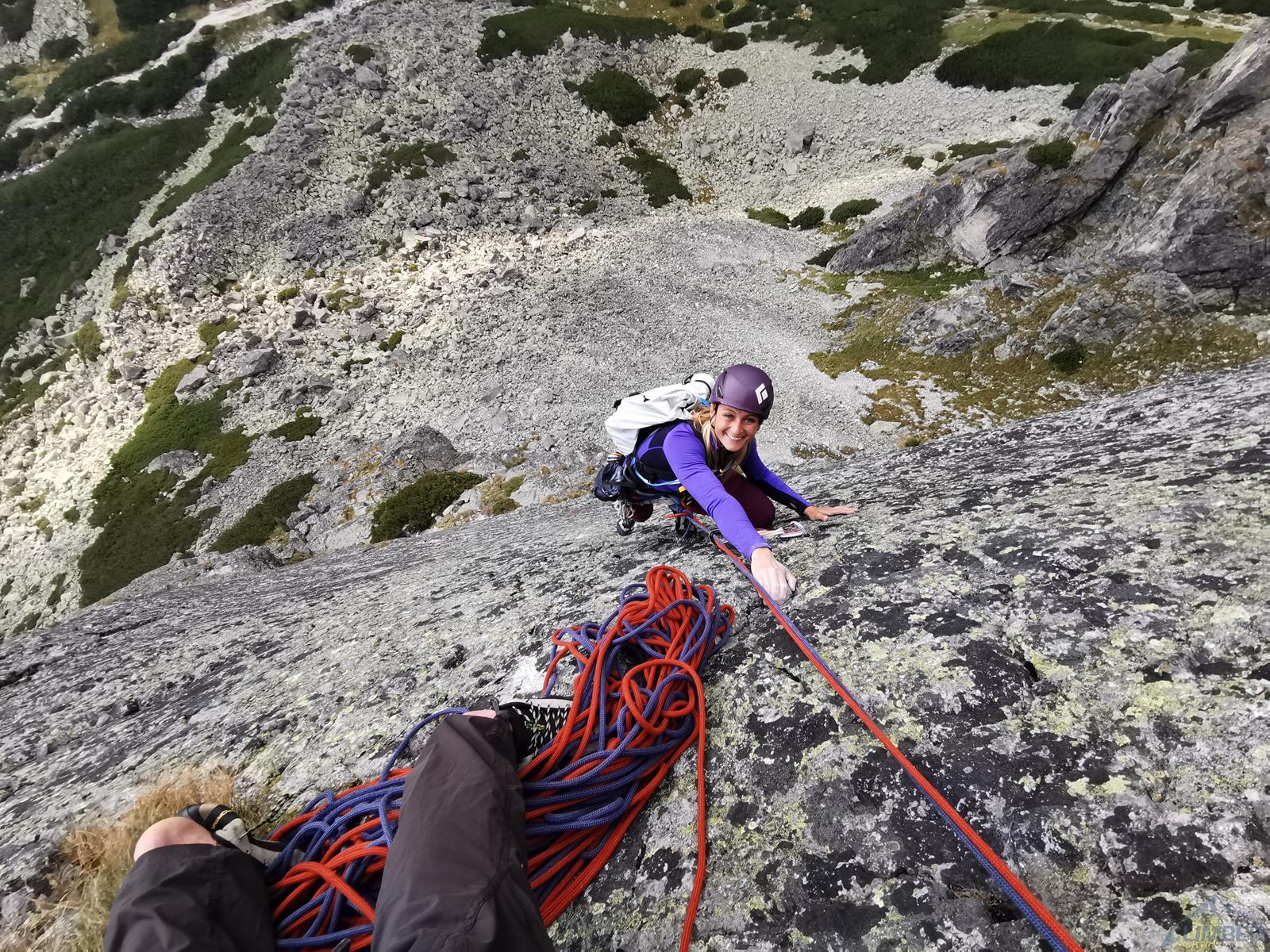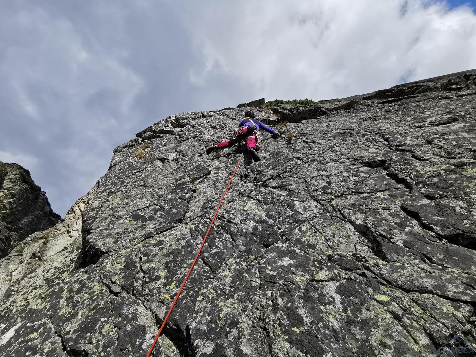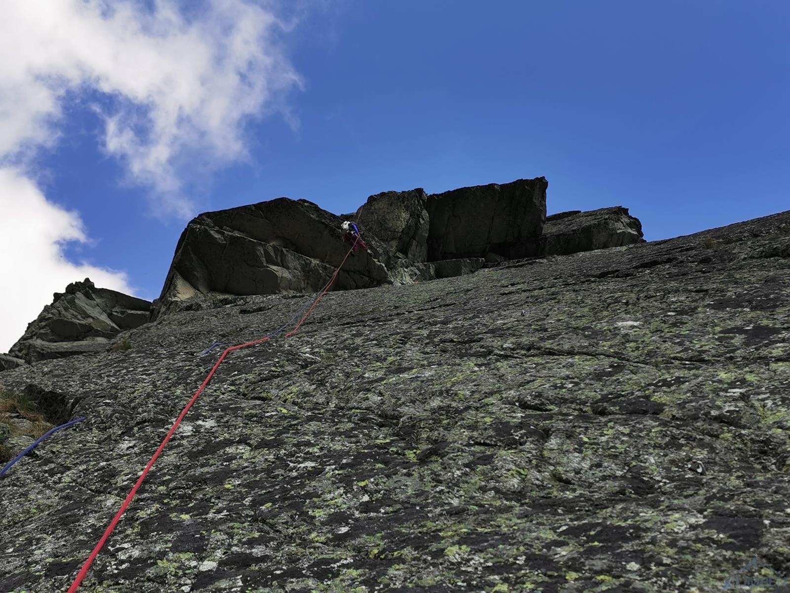 Parchy zrobione, oddaję więc prowadzenie Ani, która ma prowadzić trudności na naszej pierwszej dziś drodze. Płyta nad nami wygląda fajnie, niestety jest mocno porośnięta – buty aż trzeszczą 😊. Startujemy skośnie w lewo, co nie jest takie oczywiste – nie ma żadnego haka, te po prawej pochodzą bowiem ze wspominanej już drogi idącej obok, nowa linia wciska się więc trochę na siłę. Kilka ładnych choć niepewnych (przez porosty) ruchów za V+ doprowadza nas do trawiastej półeczki, z której kontynuujemy do góry ewidentną rysą. Po wyjściu w łatwy teren (ok. 30m) możemy skorzystać z ringa i zrobić stanowisko, lub podejść do kolejnego 20 metrów – skośnie w prawo łatwym terenem. Przed nami kluczowy wyciąg (VI+) – do tej pory na drodze nie było prawie nic, tutaj na krótkim trudniejszym odcinku mamy aż 5 spitów, co wydaje nam się mocno psuć górski charakter drogi. Ania pewnie przechodzi czujne ruchy w trawersie i wydostaje się w łatwiejszy teren, którym szybko dociera do końca drogi (stan na jednym z bloków). Drogi generalnie nie polecamy – sporo kruchego i brzydkiego terenu, najlepszy fragment płytą porośnięty, ładny ale krótki odcinek w trudnościach i po wszystkim. Schodzimy żlebem pomiędzy ścianami, dzięki czemu po 15 minutach stajemy pod drugą zaplanowaną na dziś drogą.
