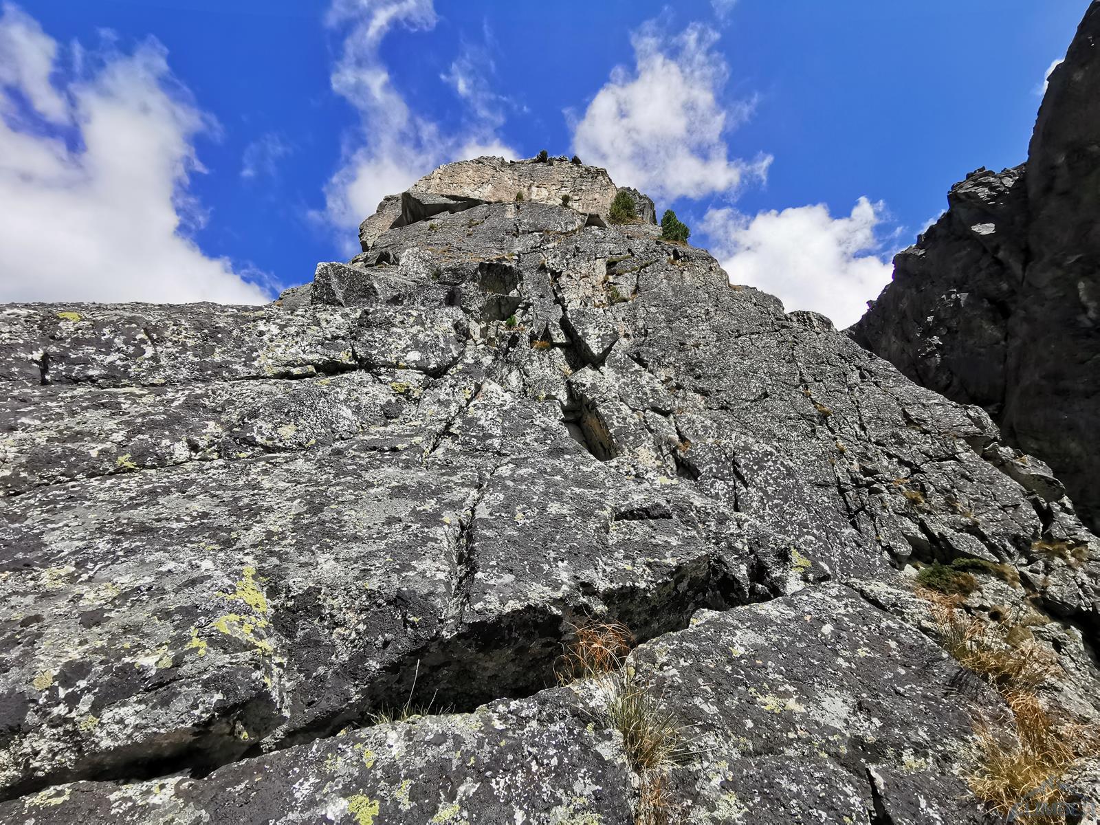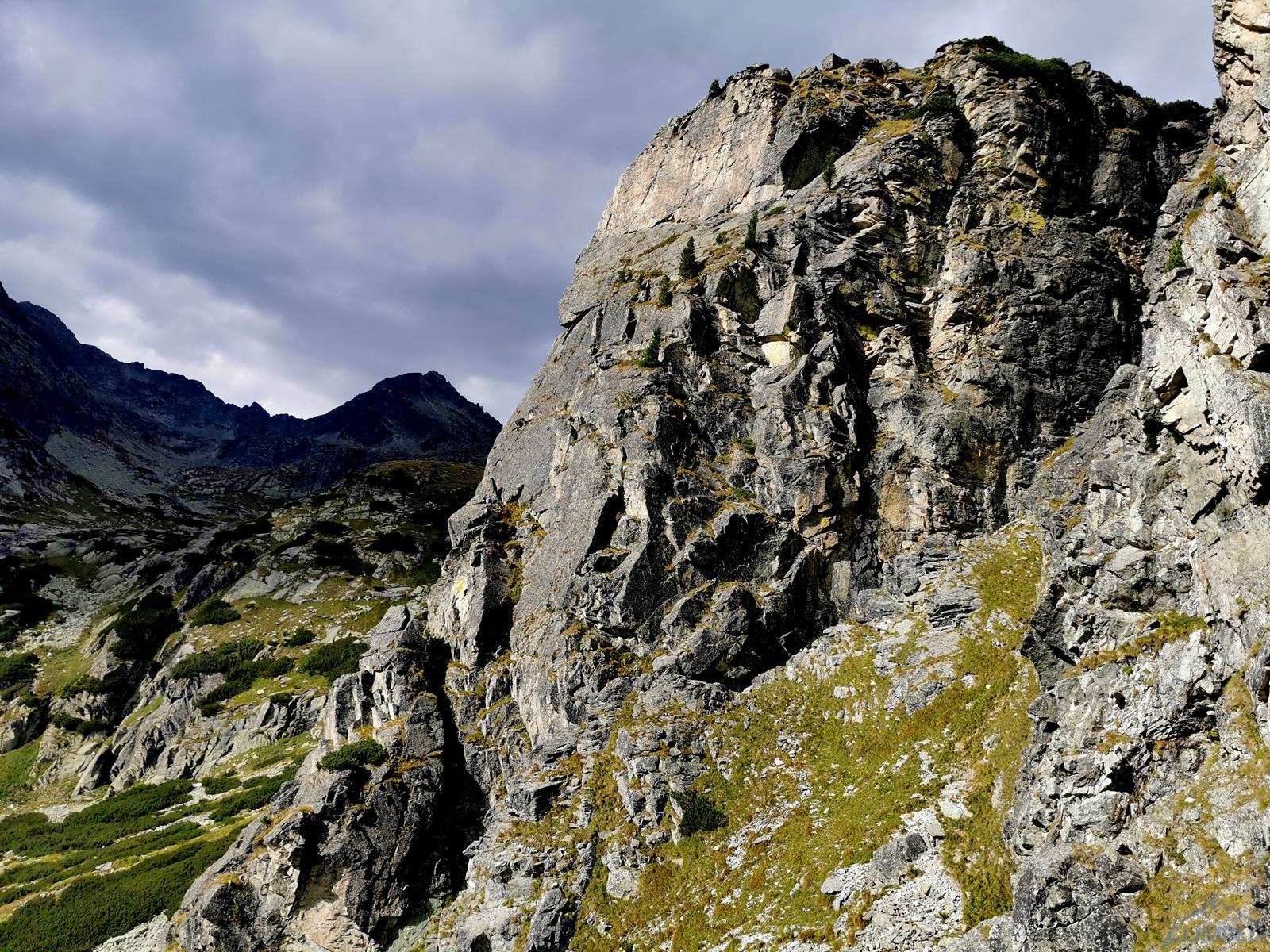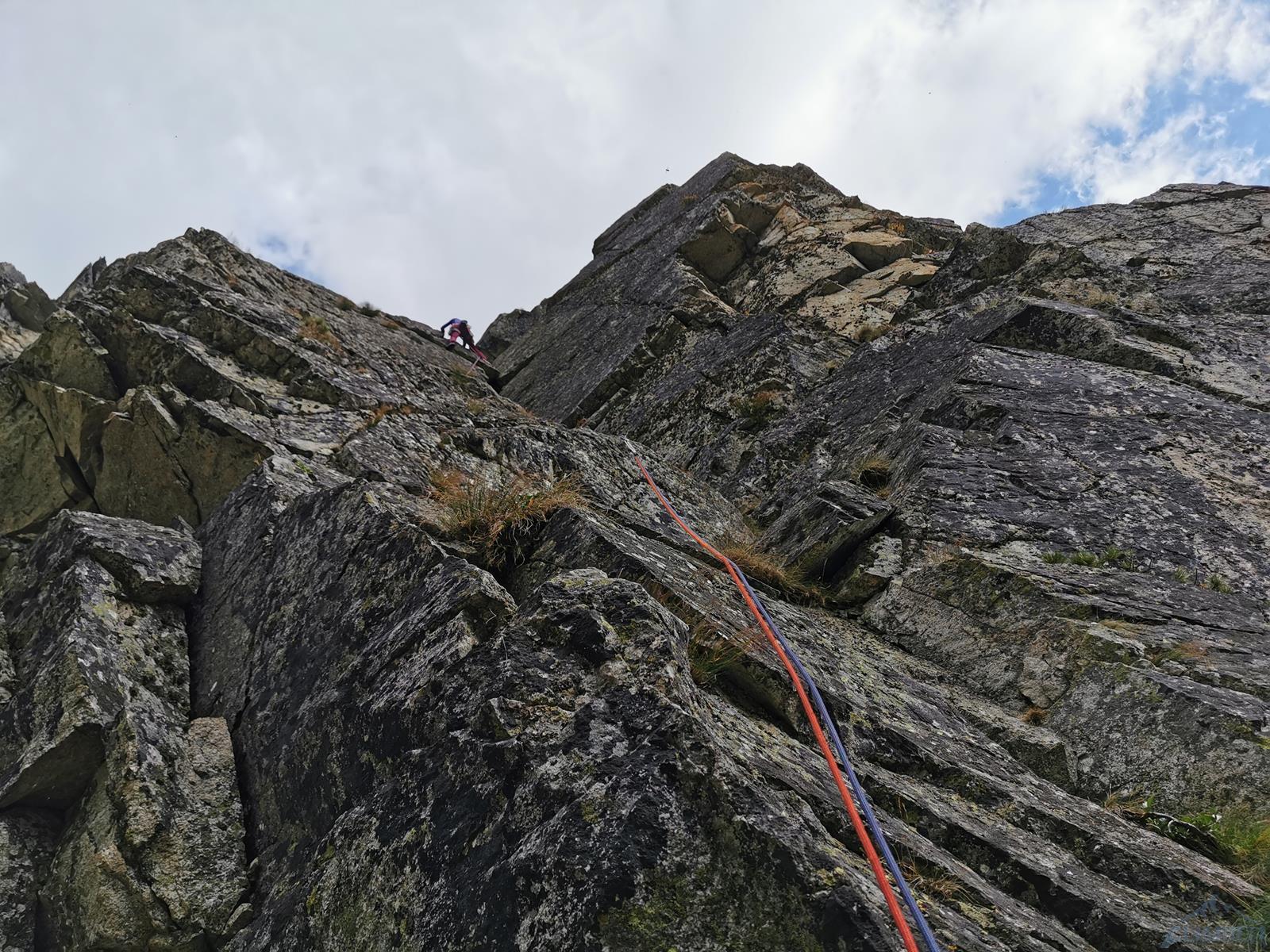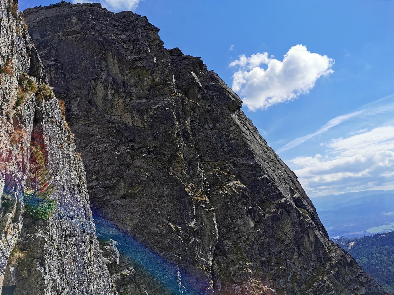 Parchy zrobione, oddaję więc prowadzenie Ani, która ma prowadzić trudności na naszej pierwszej dziś drodze. Płyta nad nami wygląda fajnie, niestety jest mocno porośnięta – buty aż trzeszczą 😊. Startujemy skośnie w lewo, co nie jest takie oczywiste – nie ma żadnego haka, te po prawej pochodzą bowiem ze wspominanej już drogi idącej obok, nowa linia wciska się więc trochę na siłę. Kilka ładnych choć niepewnych (przez porosty) ruchów za V+ doprowadza nas do trawiastej półeczki, z której kontynuujemy do góry ewidentną rysą. Po wyjściu w łatwy teren (ok. 30m) możemy skorzystać z ringa i zrobić stanowisko, lub podejść do kolejnego 20 metrów – skośnie w prawo łatwym terenem. Przed nami kluczowy wyciąg (VI+) – do tej pory na drodze nie było prawie nic, tutaj na krótkim trudniejszym odcinku mamy aż 5 spitów, co wydaje nam się mocno psuć górski charakter drogi. Ania pewnie przechodzi czujne ruchy w trawersie i wydostaje się w łatwiejszy teren, którym szybko dociera do końca drogi (stan na jednym z bloków). Drogi generalnie nie polecamy – sporo kruchego i brzydkiego terenu, najlepszy fragment płytą porośnięty, ładny ale krótki odcinek w trudnościach i po wszystkim. Schodzimy żlebem pomiędzy ścianami, dzięki czemu po 15 minutach stajemy pod drugą zaplanowaną na dziś drogą.