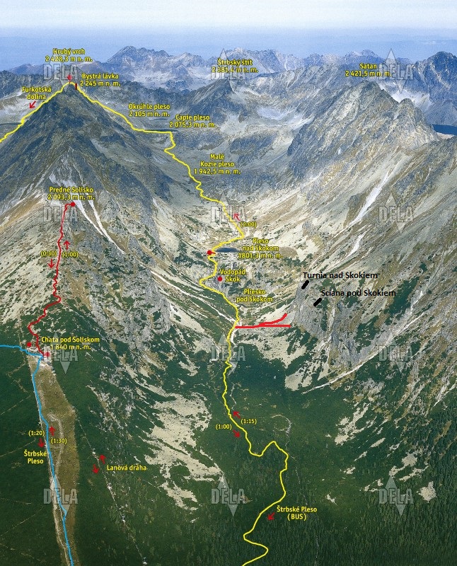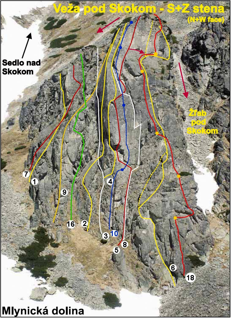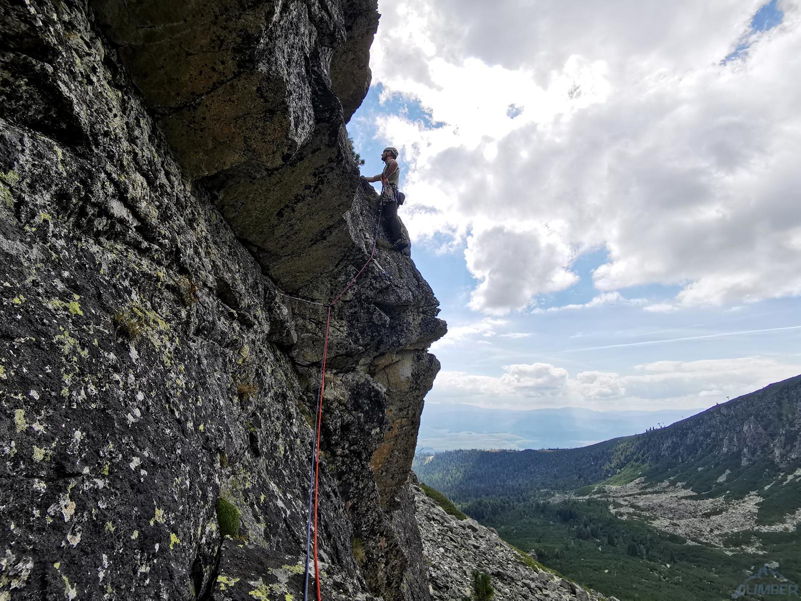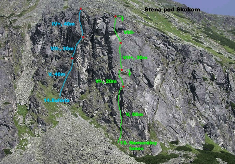 Linia w dolnej części nie wygląda zbyt zachęcająco, liczymy jednak na ładne wspinanie na ostatnich, kluczowych wyciągach. Na początek czeka nas wspinanie w parchatej, czwórkowej ściance – idziemy jak puszcza wybierając jak najmniej porośnięte i stabilne chwyty oraz stopnie, po 30 metrach docieramy do stanowiska (na każdym 1 ring). Na kolejnym odcinku czeka nas efektowny trawers i przewinięcie za okapy – wygląda trudniej niż jest w rzeczywistości (miejsce V+), później już łatwo do stanu na lewo od kosówek. Przebieg trzeciego wyciągu (V) jest trochę niejasny i trudności szuka się trochę na siłę – ja poszedłem zacięciem wprost, po czym filarkiem pod kruchą ściankę, którą pokonałem rysą po prawej stronie – zacięciem po lewej prowadzi droga Prostriedkom veže. Ważne by dojść do stanowiska (ringa) pod dużą płytą, którą prowadzi kolejny wyciąg.