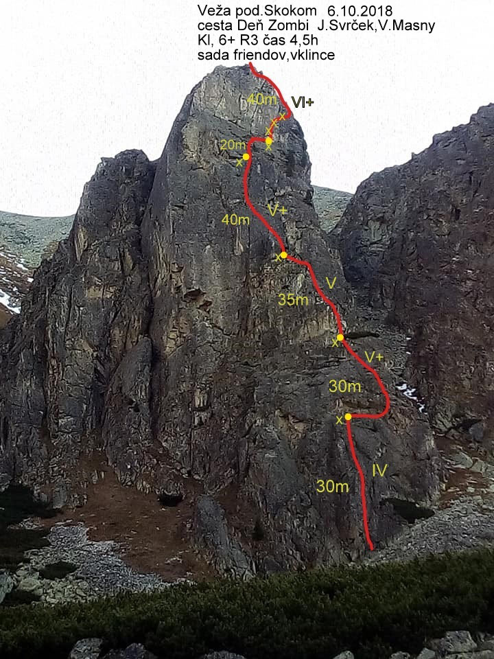 Ściany w Dolinie Młynickiej (zarówno w masywie Skrajnej Baszty jak i Solisk) idealnie nadają się na niepewną pogodę lub szybką akcję. Godzinne podejście i zachodnia wystawa Turni i Ściany pod Skokiem pozwalają dotrzeć pod ścianę wyspanym i oszczędzić siły, jeżeli w planach na kolejny dzień mamy jakiś odległy cel. Podczas naszej niedawnej wizyty w tym miejscu zamierzaliśmy przejść narzucającą się łańcuchówkę – Euforię (VI+) oraz Nemorálny tanec (VII+/VIII-). Niestety podczas zjazdu linią Tańca po zrobieniu pierwszej drogi okazało się, że kluczowe miejsca są mokre – wielka płyta spodobała nam się jednak tak bardzo, że postanowiliśmy szybko na nią wrócić. Na rozgrzewkę wybraliśmy tym razem w miarę nową (2018) drogę na Turni obok - Deň Zombi (VI+).