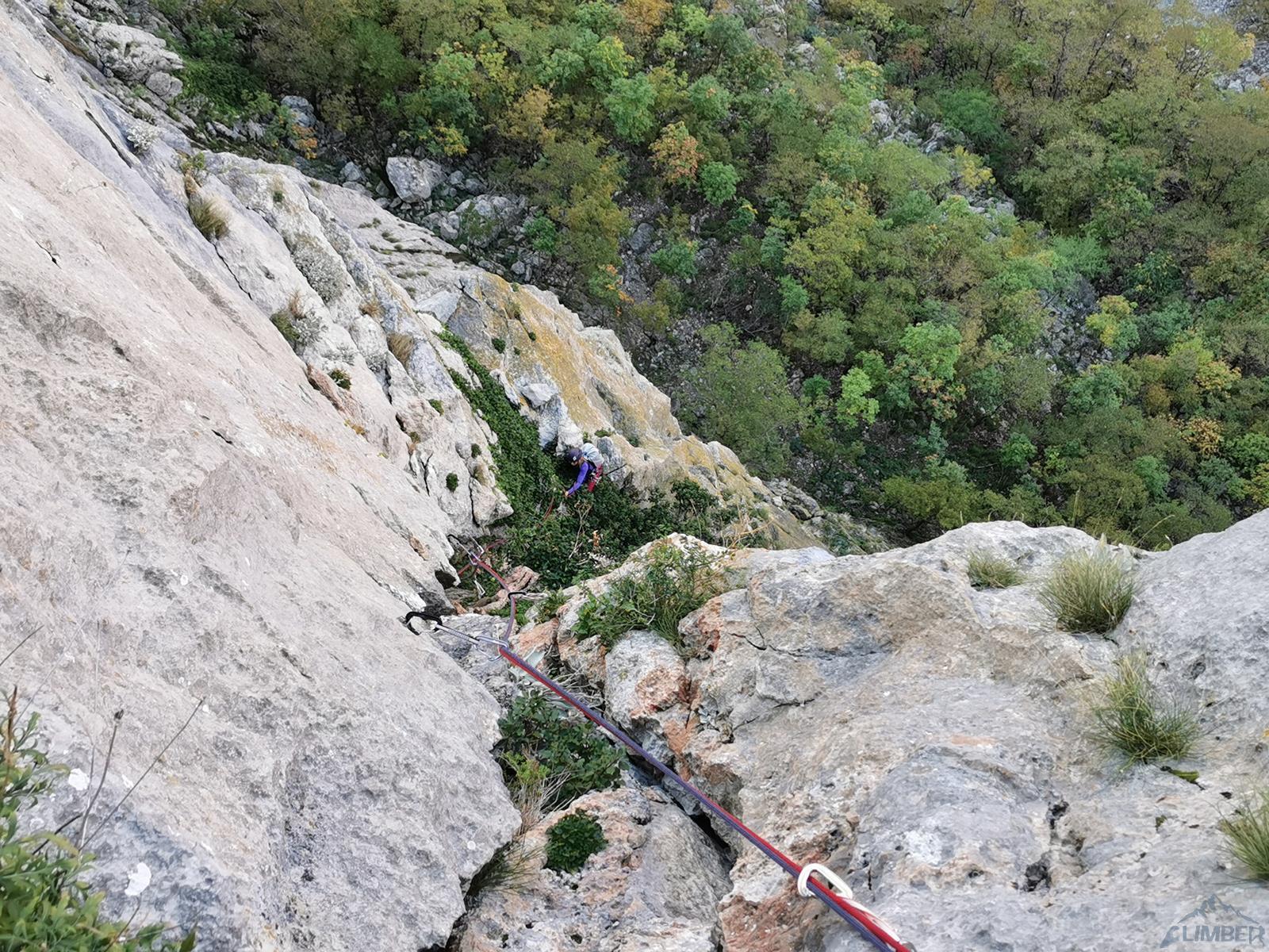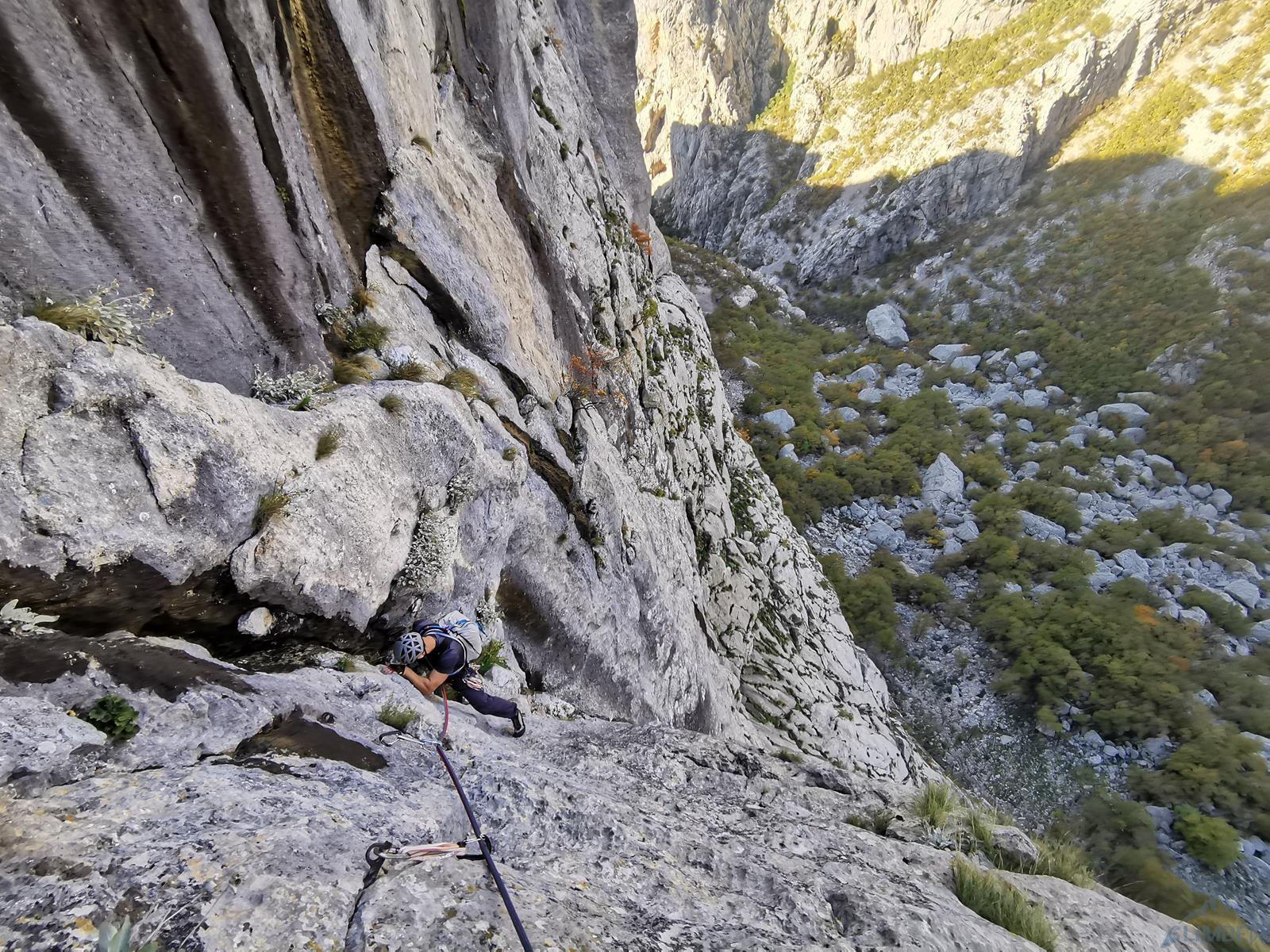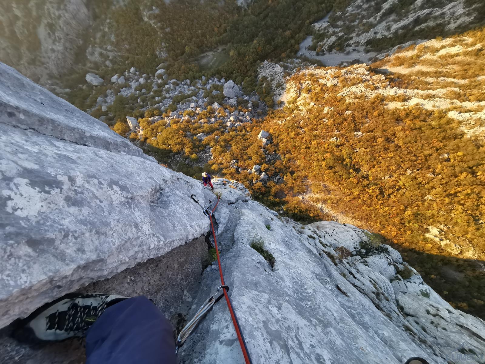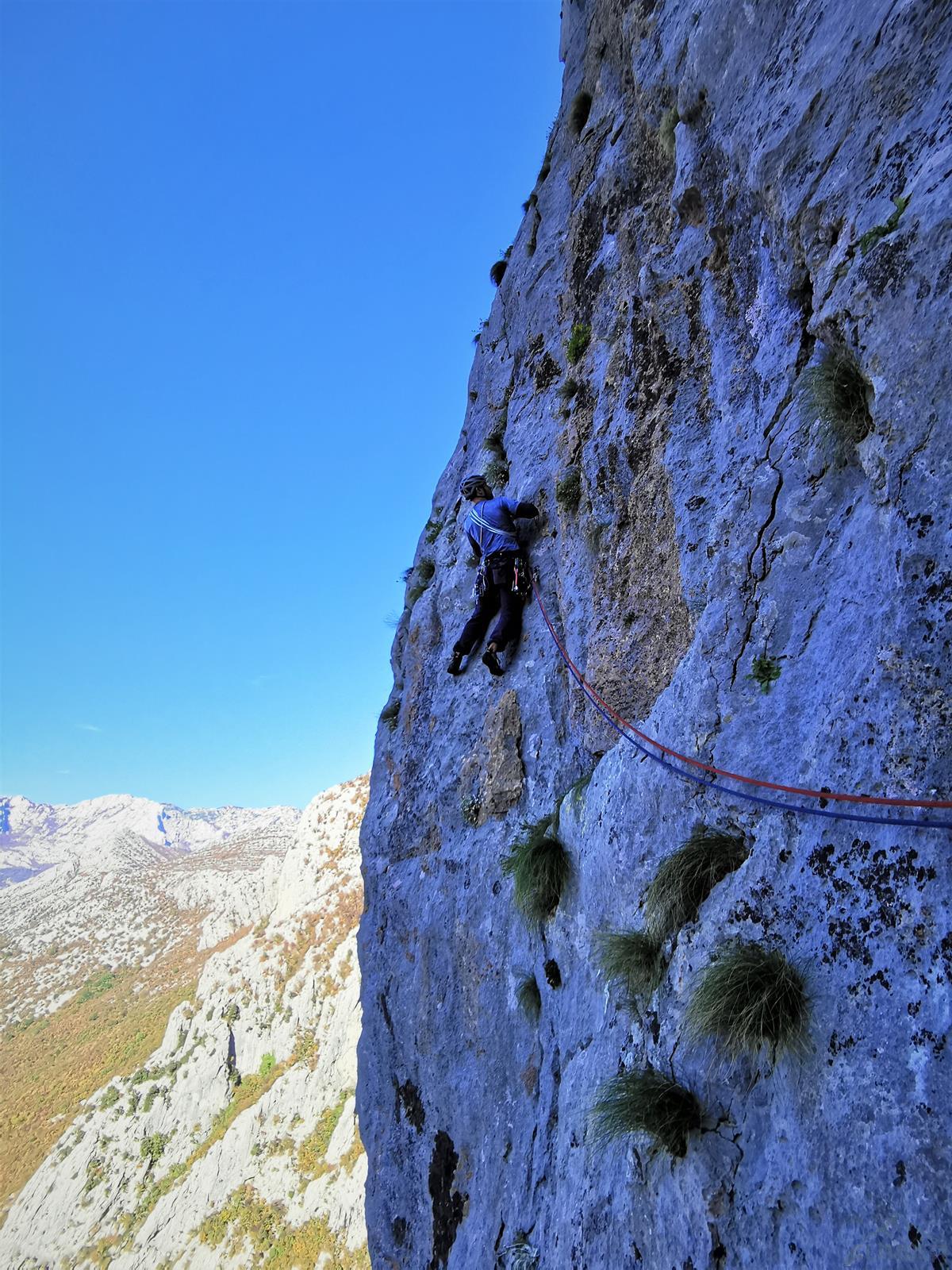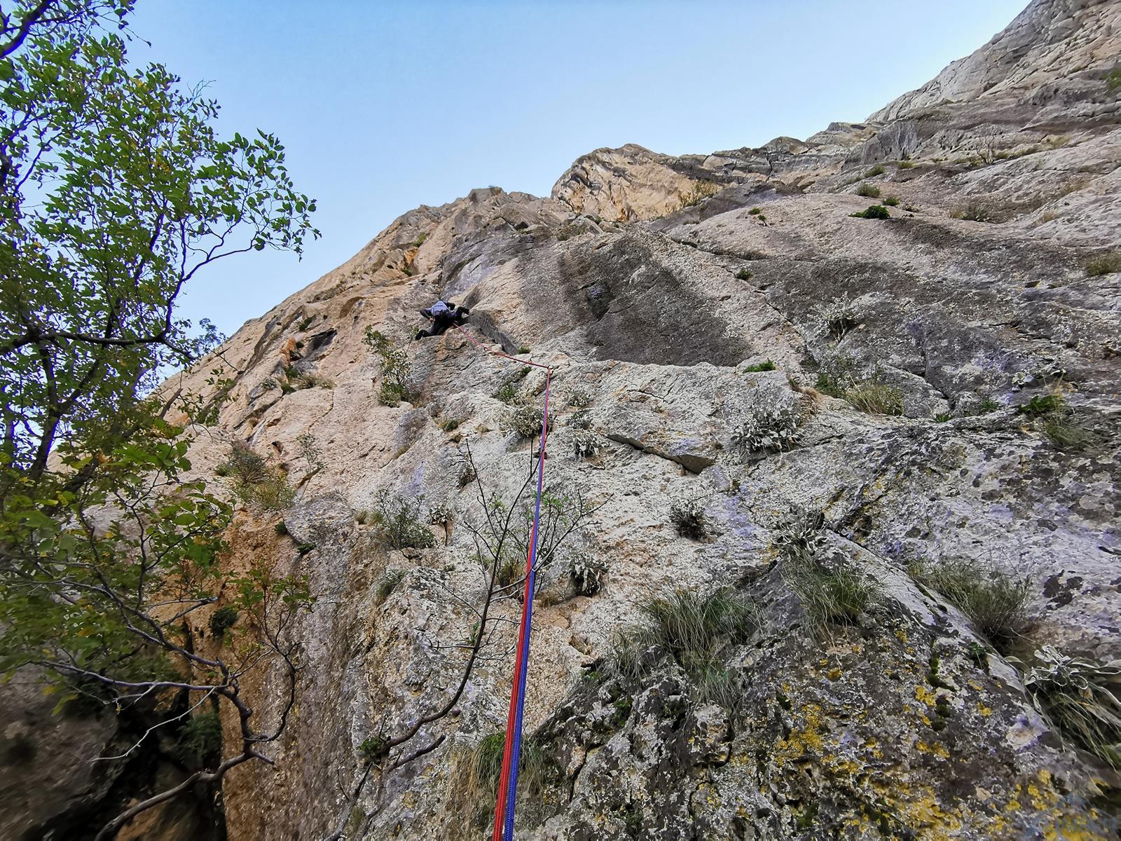 Połowa drugiego wyciąg jest bardzo nietypowa – pole kosodrzewiny w tej części ściany znacznie się rozrosło i komin którym idziemy oraz płyty nad nim są całe zarośnięte. Przed nami więc wcale nie łatwe (5a, w poprzedniej wersji topo 5c) wspinanie po kruchych gałązkach oraz szukanie spitów pomiędzy nimi. Na deser po wyjściu z pionowych zarośli czeka siłowa, przewieszona rysa – zakładałem, że ten wyciąg przebiegniemy i nie ostatni raz na tej drodze się przeliczyłem. Moja partnerka po „strasznym” wyciągu po raz kolejny sugeruje wycof i po raz kolejny daje się przekonać, że wyżej będzie lepiej 😊. Na pocieszenie początek trzeciego wyciągu jest bardzo ładny – estetyczne zacięcie wyprowadza nas pod kolejne, już trudniejsze (raczej 5c jak w starym topo). Wisienką na torcie jest słynny komin (znany nam już z drogi Velebitaški), którego górną połowę przechodzi się bez asekuracji – niby nic trudnego a zapada w pamięć.