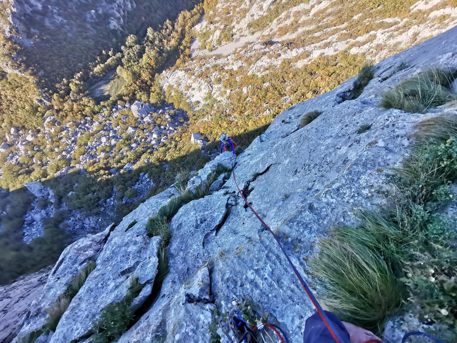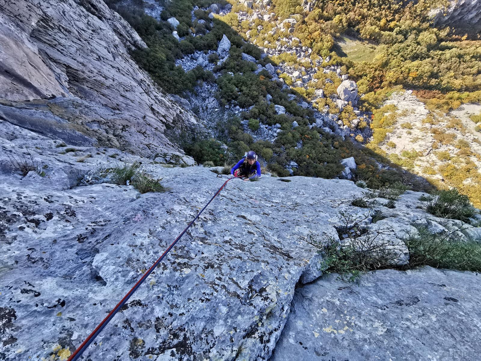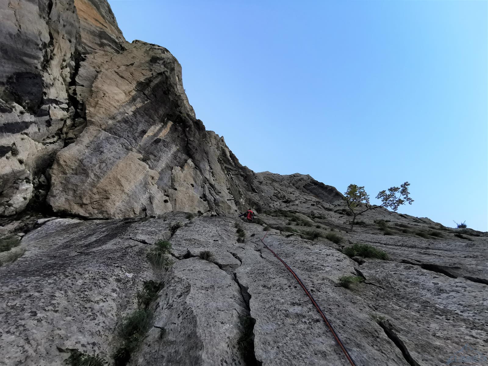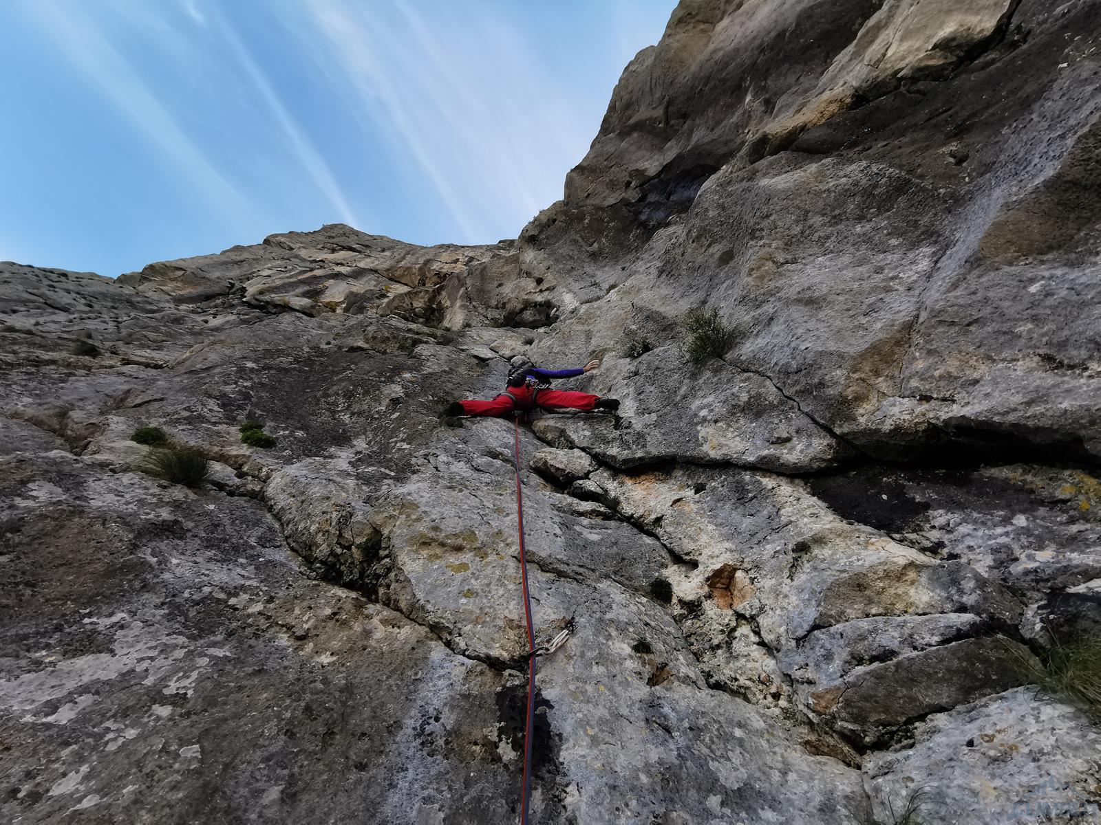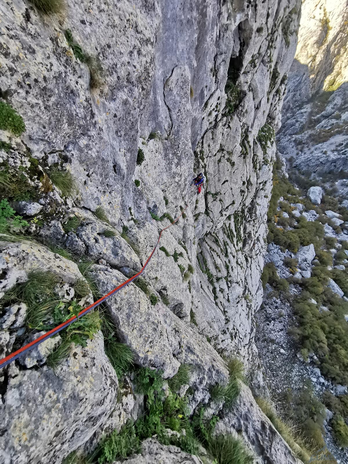 Połowa drugiego wyciąg jest bardzo nietypowa – pole kosodrzewiny w tej części ściany znacznie się rozrosło i komin którym idziemy oraz płyty nad nim są całe zarośnięte. Przed nami więc wcale nie łatwe (5a, w poprzedniej wersji topo 5c) wspinanie po kruchych gałązkach oraz szukanie spitów pomiędzy nimi. Na deser po wyjściu z pionowych zarośli czeka siłowa, przewieszona rysa – zakładałem, że ten wyciąg przebiegniemy i nie ostatni raz na tej drodze się przeliczyłem. Moja partnerka po „strasznym” wyciągu po raz kolejny sugeruje wycof i po raz kolejny daje się przekonać, że wyżej będzie lepiej 😊. Na pocieszenie początek trzeciego wyciągu jest bardzo ładny – estetyczne zacięcie wyprowadza nas pod kolejne, już trudniejsze (raczej 5c jak w starym topo). Wisienką na torcie jest słynny komin (znany nam już z drogi Velebitaški), którego górną połowę przechodzi się bez asekuracji – niby nic trudnego a zapada w pamięć.