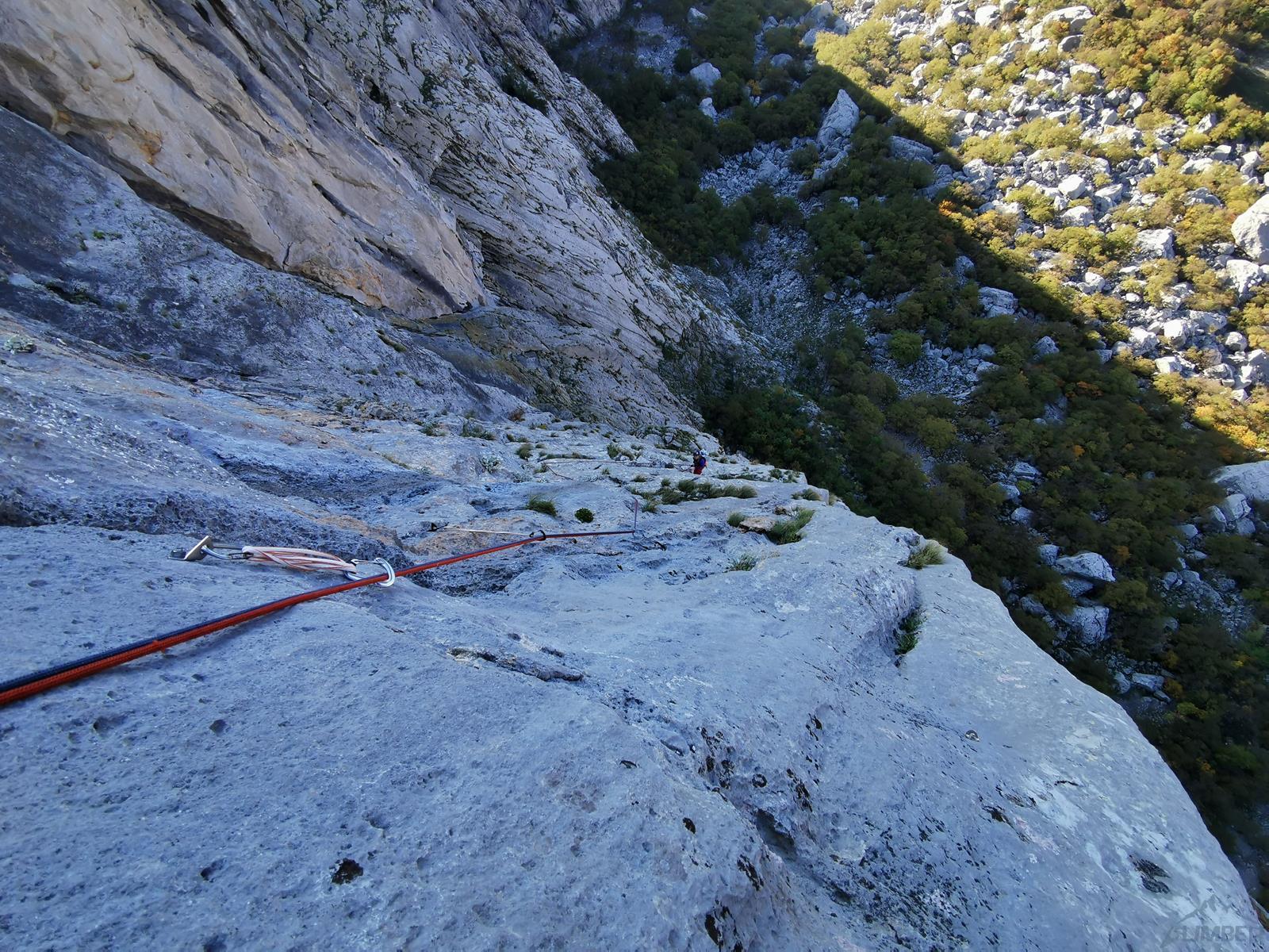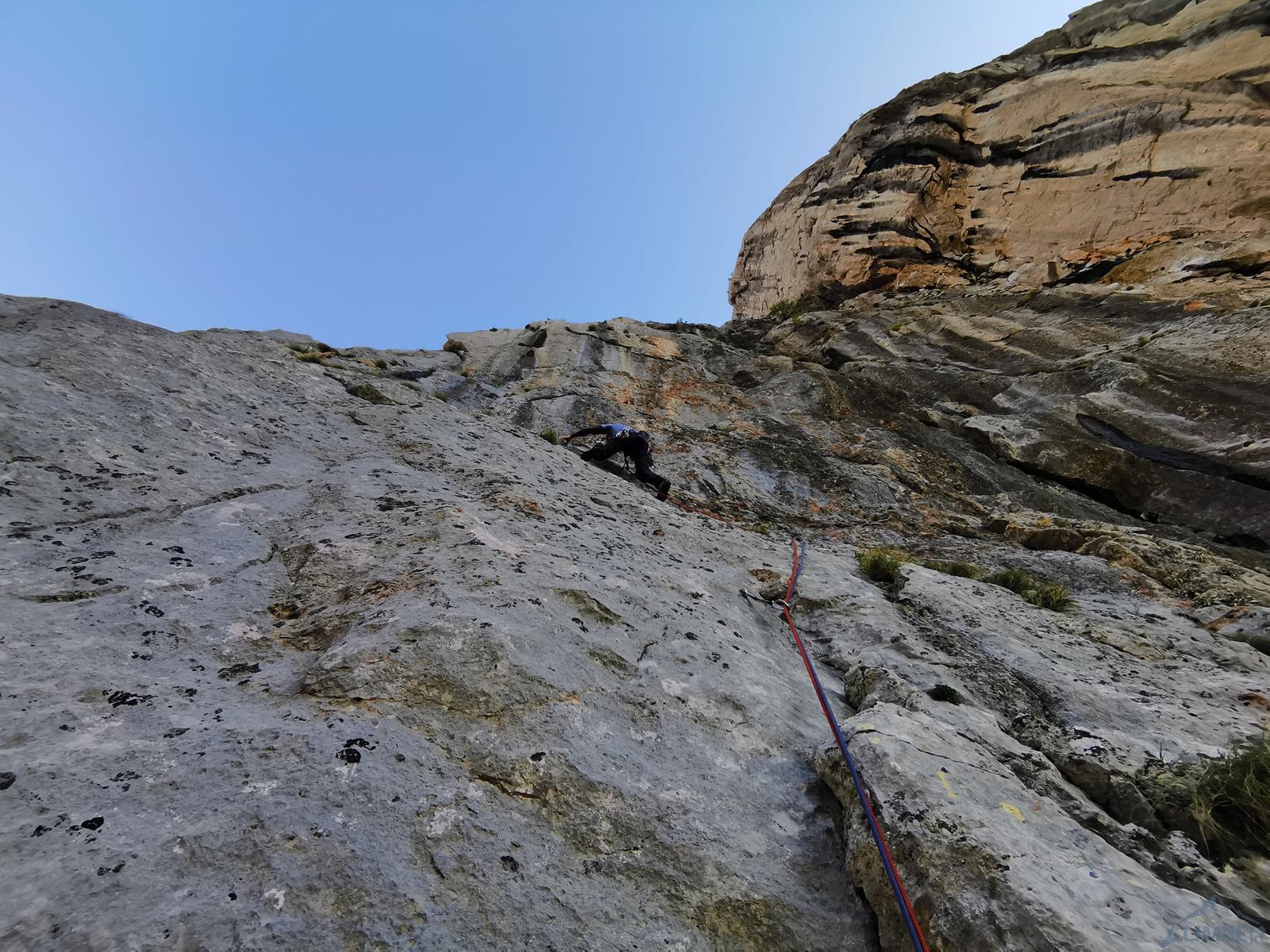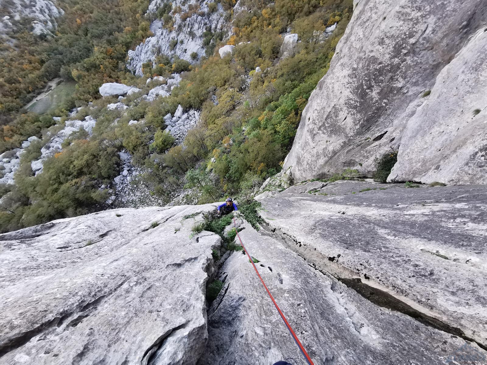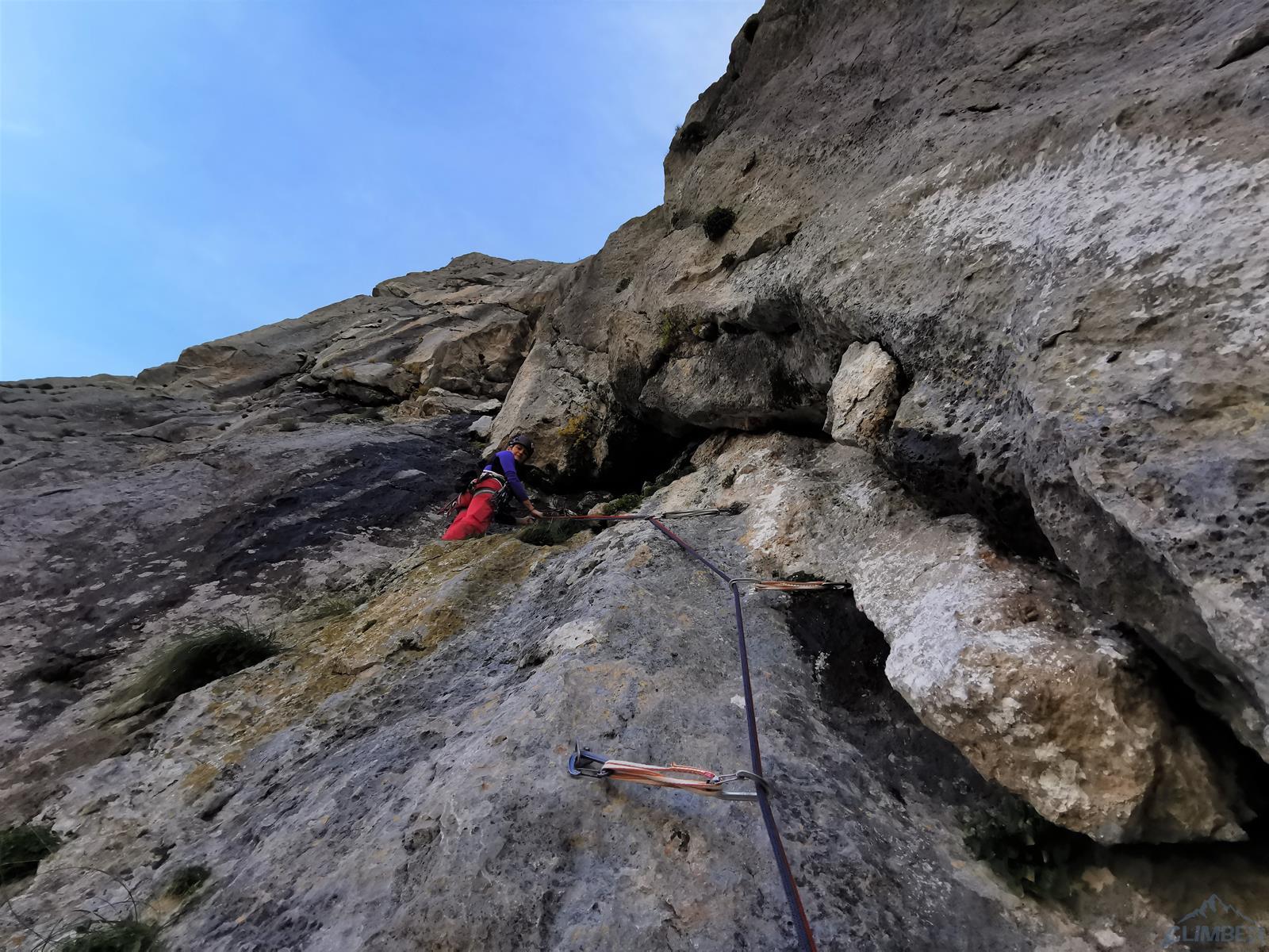 Połowa drugiego wyciąg jest bardzo nietypowa – pole kosodrzewiny w tej części ściany znacznie się rozrosło i komin którym idziemy oraz płyty nad nim są całe zarośnięte. Przed nami więc wcale nie łatwe (5a, w poprzedniej wersji topo 5c) wspinanie po kruchych gałązkach oraz szukanie spitów pomiędzy nimi. Na deser po wyjściu z pionowych zarośli czeka siłowa, przewieszona rysa – zakładałem, że ten wyciąg przebiegniemy i nie ostatni raz na tej drodze się przeliczyłem. Moja partnerka po „strasznym” wyciągu po raz kolejny sugeruje wycof i po raz kolejny daje się przekonać, że wyżej będzie lepiej 😊. Na pocieszenie początek trzeciego wyciągu jest bardzo ładny – estetyczne zacięcie wyprowadza nas pod kolejne, już trudniejsze (raczej 5c jak w starym topo). Wisienką na torcie jest słynny komin (znany nam już z drogi Velebitaški), którego górną połowę przechodzi się bez asekuracji – niby nic trudnego a zapada w pamięć.
