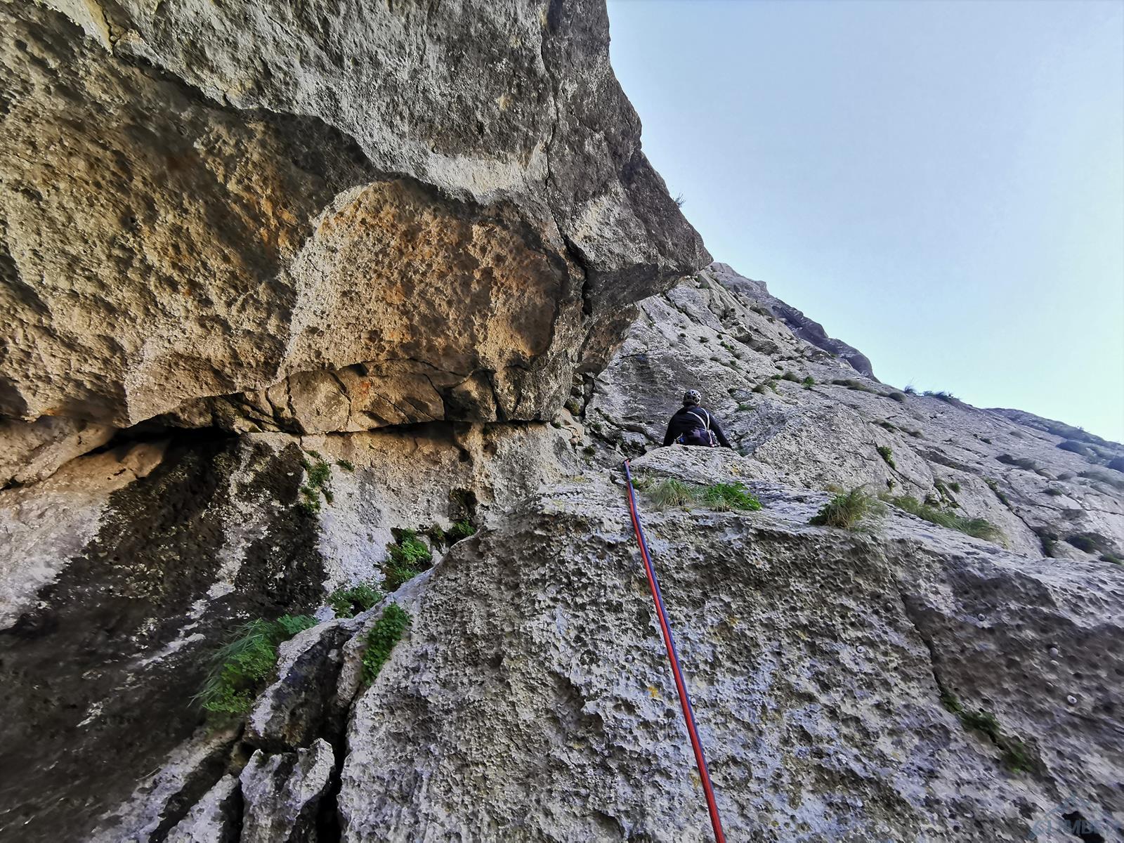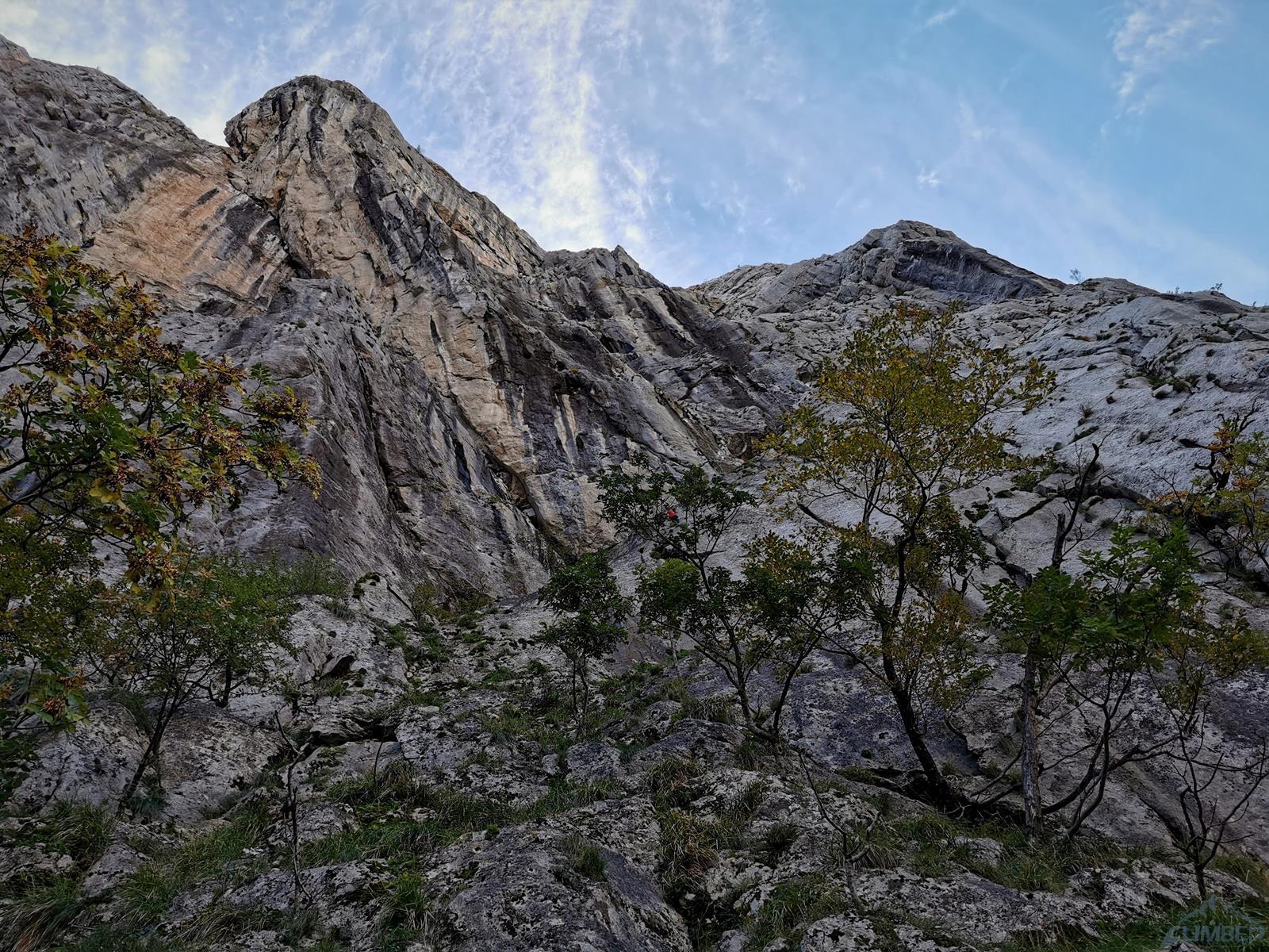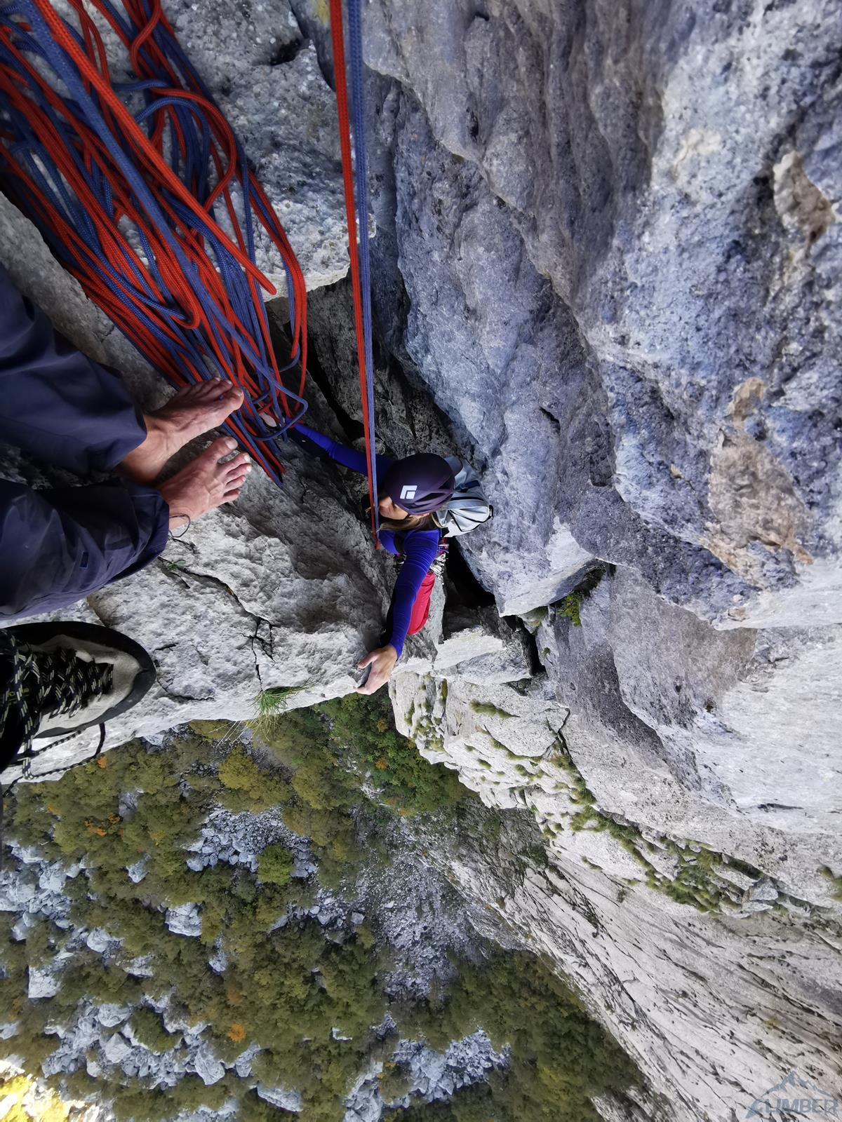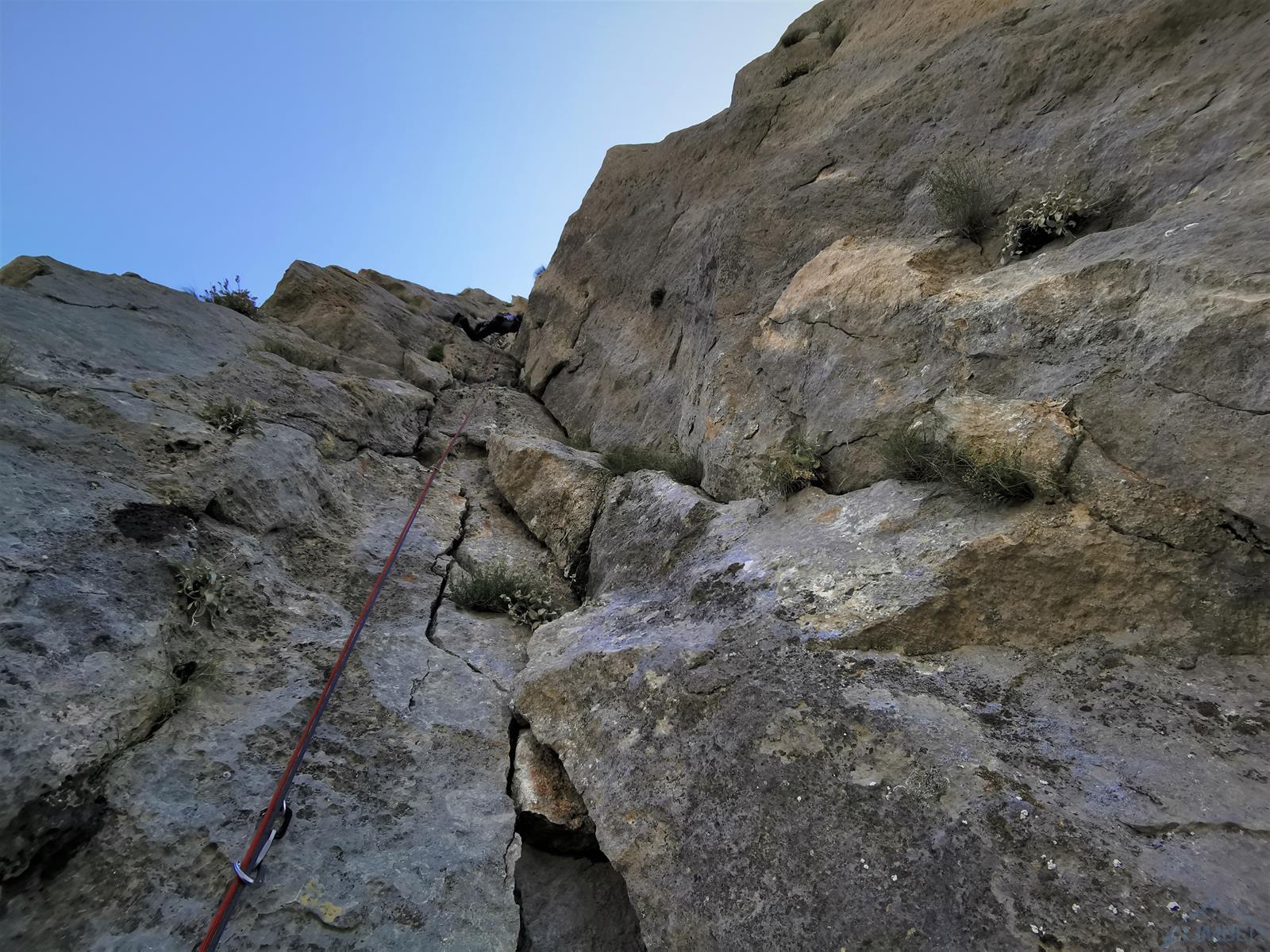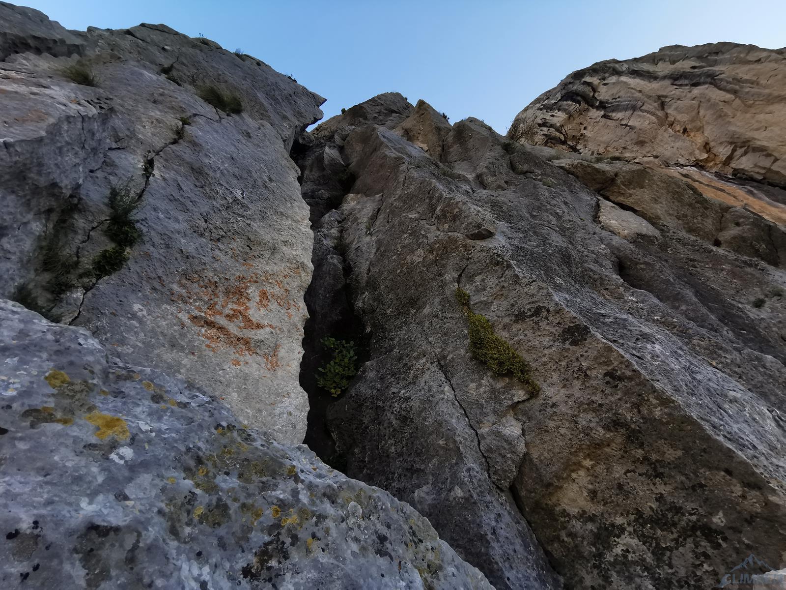 Połowa drugiego wyciąg jest bardzo nietypowa – pole kosodrzewiny w tej części ściany znacznie się rozrosło i komin którym idziemy oraz płyty nad nim są całe zarośnięte. Przed nami więc wcale nie łatwe (5a, w poprzedniej wersji topo 5c) wspinanie po kruchych gałązkach oraz szukanie spitów pomiędzy nimi. Na deser po wyjściu z pionowych zarośli czeka siłowa, przewieszona rysa – zakładałem, że ten wyciąg przebiegniemy i nie ostatni raz na tej drodze się przeliczyłem. Moja partnerka po „strasznym” wyciągu po raz kolejny sugeruje wycof i po raz kolejny daje się przekonać, że wyżej będzie lepiej 😊. Na pocieszenie początek trzeciego wyciągu jest bardzo ładny – estetyczne zacięcie wyprowadza nas pod kolejne, już trudniejsze (raczej 5c jak w starym topo). Wisienką na torcie jest słynny komin (znany nam już z drogi Velebitaški), którego górną połowę przechodzi się bez asekuracji – niby nic trudnego a zapada w pamięć.
