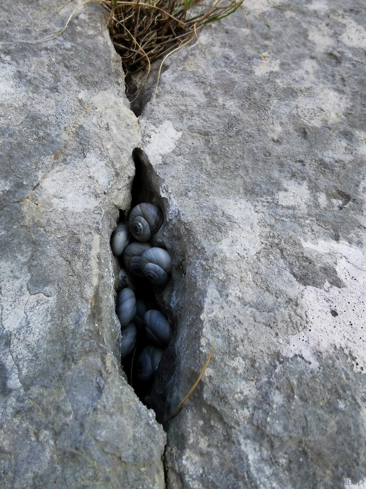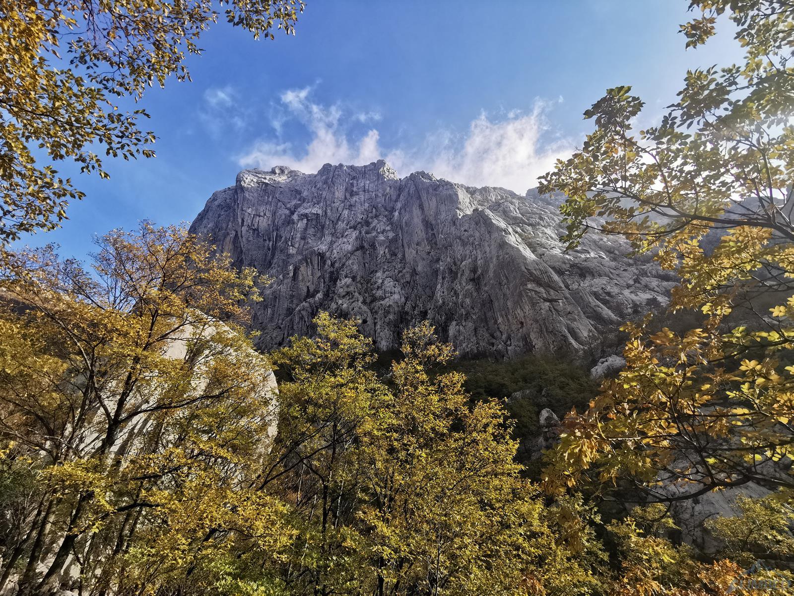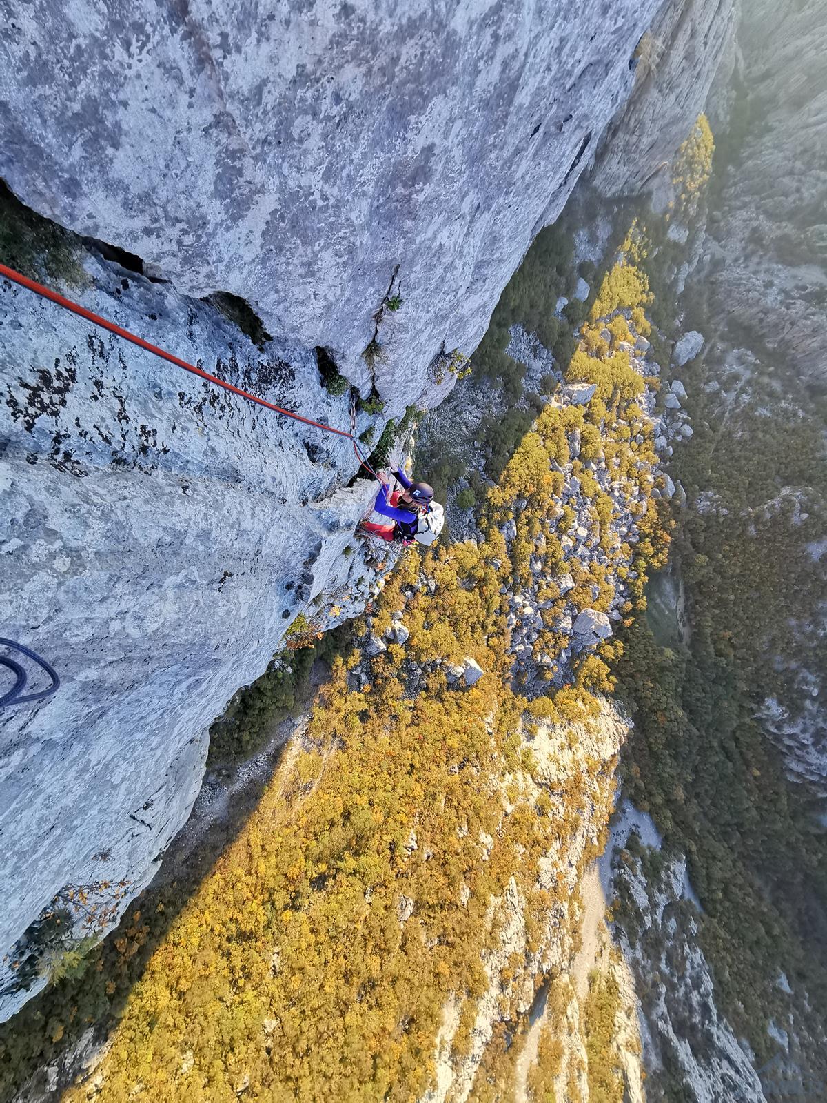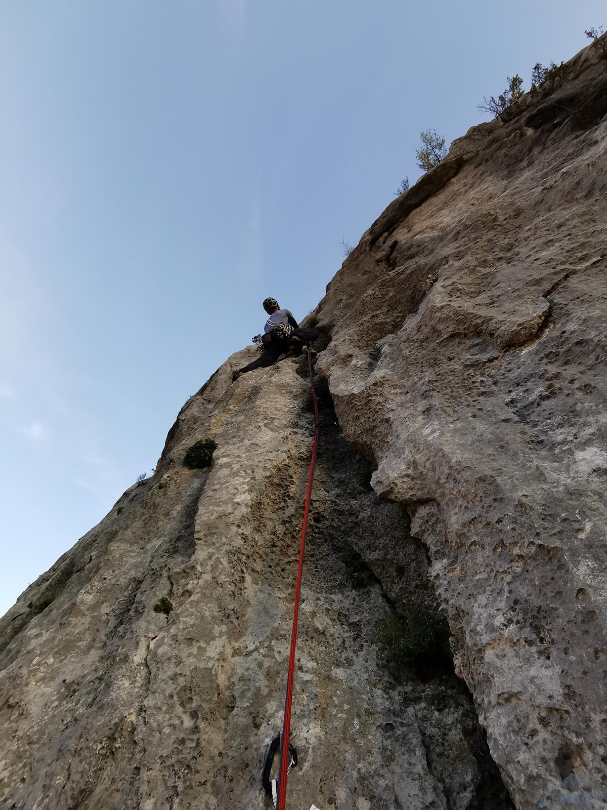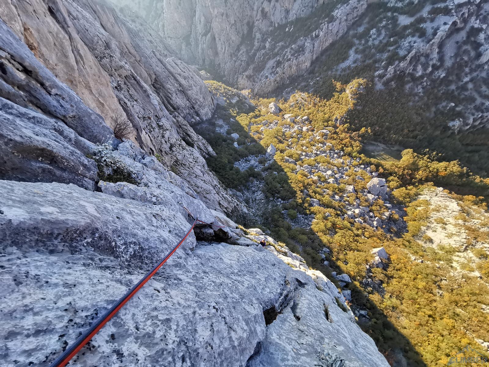 Połowa drugiego wyciąg jest bardzo nietypowa – pole kosodrzewiny w tej części ściany znacznie się rozrosło i komin którym idziemy oraz płyty nad nim są całe zarośnięte. Przed nami więc wcale nie łatwe (5a, w poprzedniej wersji topo 5c) wspinanie po kruchych gałązkach oraz szukanie spitów pomiędzy nimi. Na deser po wyjściu z pionowych zarośli czeka siłowa, przewieszona rysa – zakładałem, że ten wyciąg przebiegniemy i nie ostatni raz na tej drodze się przeliczyłem. Moja partnerka po „strasznym” wyciągu po raz kolejny sugeruje wycof i po raz kolejny daje się przekonać, że wyżej będzie lepiej 😊. Na pocieszenie początek trzeciego wyciągu jest bardzo ładny – estetyczne zacięcie wyprowadza nas pod kolejne, już trudniejsze (raczej 5c jak w starym topo). Wisienką na torcie jest słynny komin (znany nam już z drogi Velebitaški), którego górną połowę przechodzi się bez asekuracji – niby nic trudnego a zapada w pamięć.