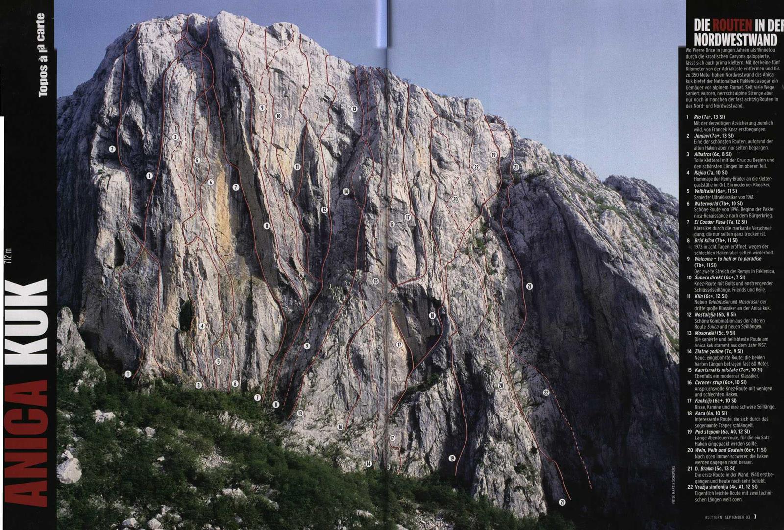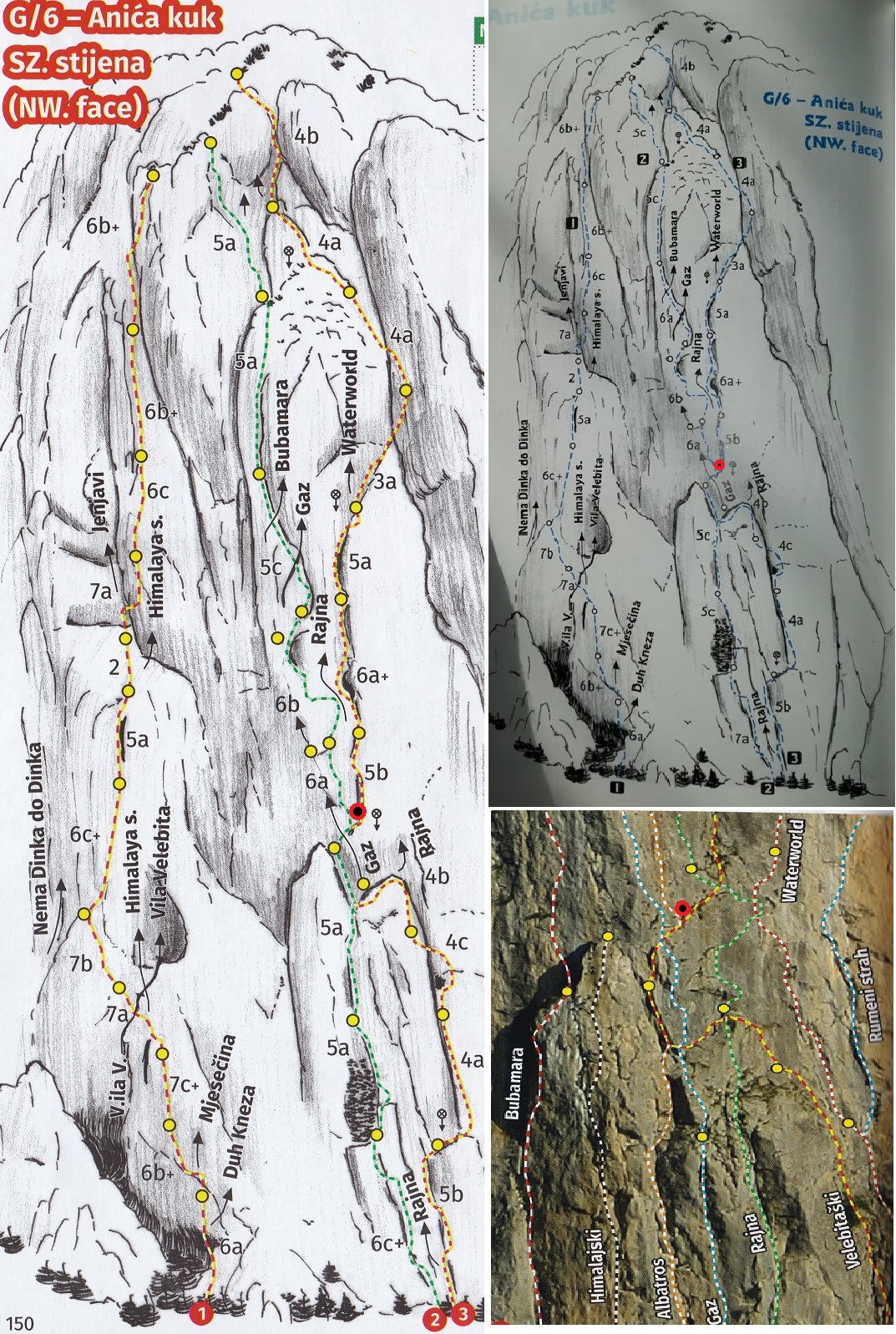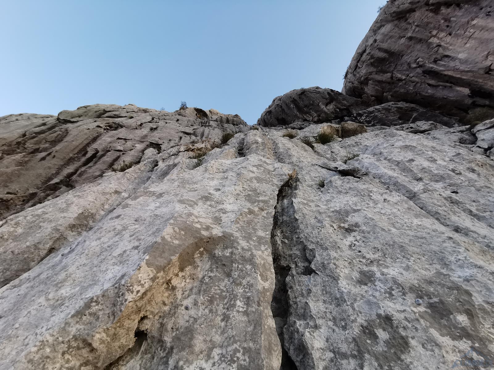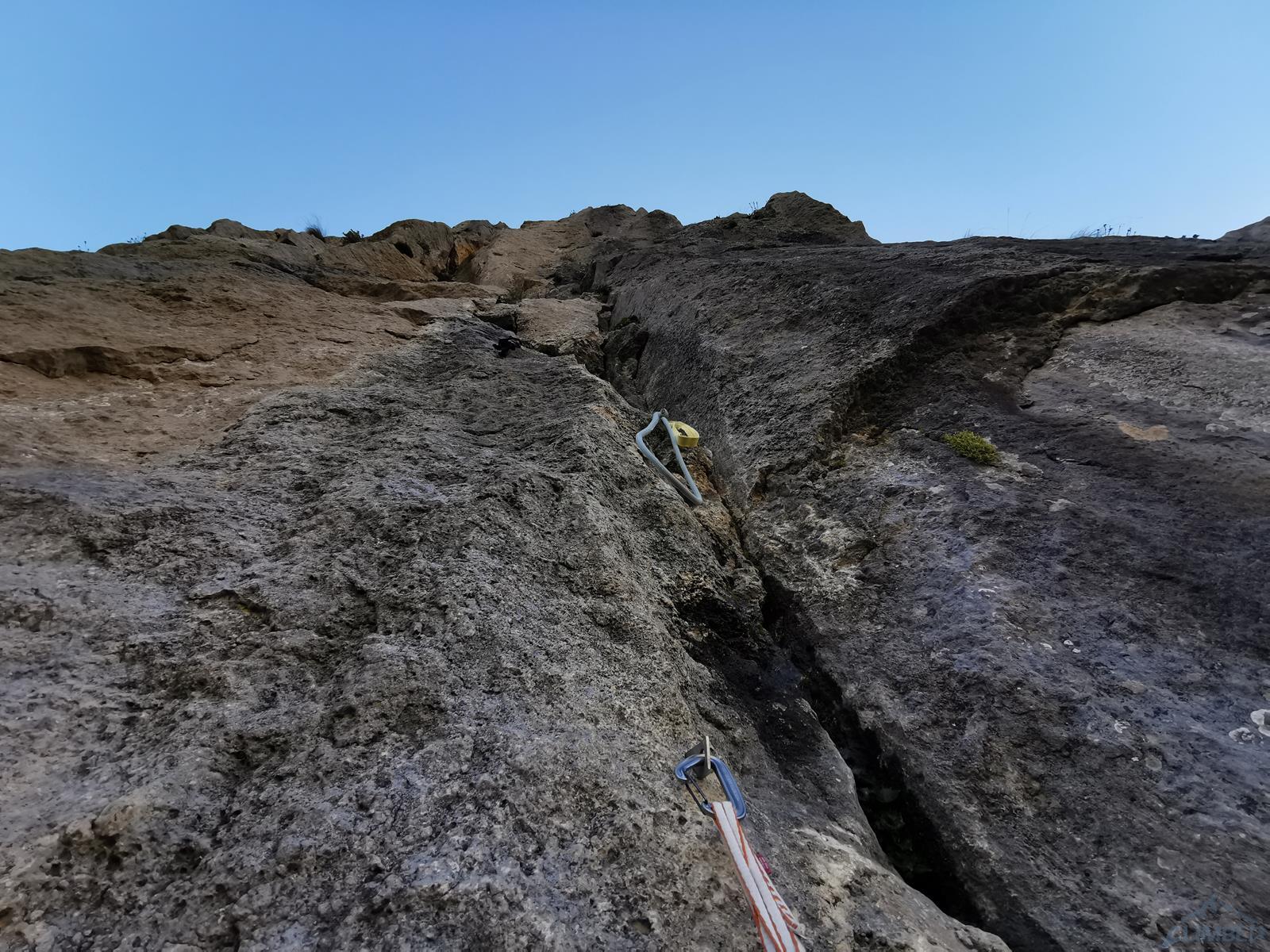 Na starcie kolejnego odcinka czeka nas krótki bulderek i przewijamy się za kant filara – uwaga bo tutaj można się zgubić z powodu niejasnego schematu i nadmiaru dróg w tej części ściany. Spity idące po przewinięciu do góry pochodzą z drogi Gaz, zgodnie z topo poszedłem więc dalej i dotarłem do stanowiska pośredniego, kilka metrów przed miejscem, gdzie Velebitaški odbija do góry. Stąd trawersem w lewo wystartowałem w płytę (6a), gdzie wszystko zaczęło się już zgadzać – metr na lewo odeszły spity z Gaza. Po tym jednym z nielicznych technicznych odcinków na drodze czeka nas wyciąg za 6b – startujemy łatwo do góry i trawersujemy bardzo mocno w lewo – aż do przewieszonego zacięcia z łukowatą rysą. Po kilku solidnych ruchach dilfrem but wyjeżdża mi z tarciowego stopnia i wracam w dół by już skutecznie powtórzyć sekwencję.