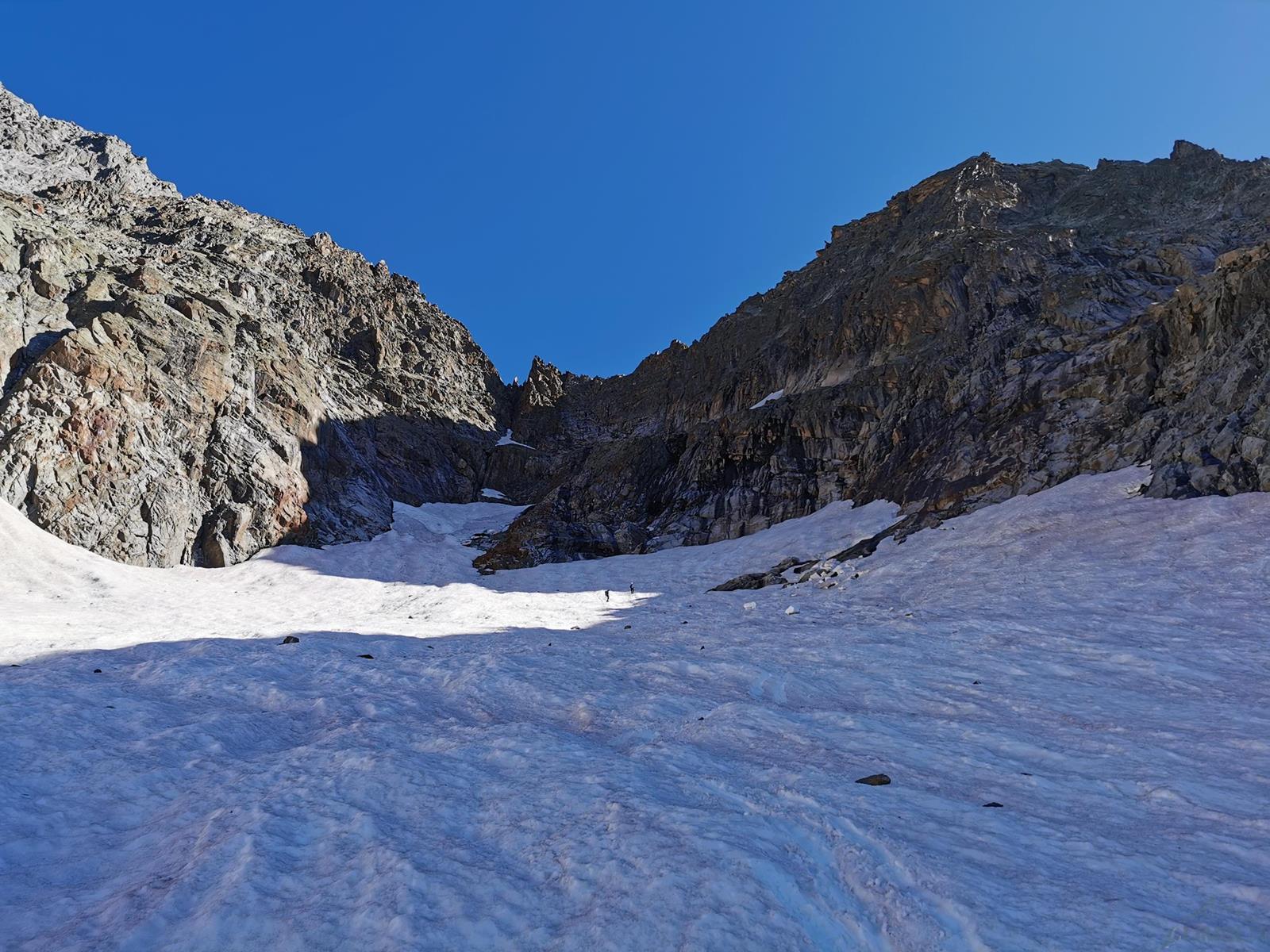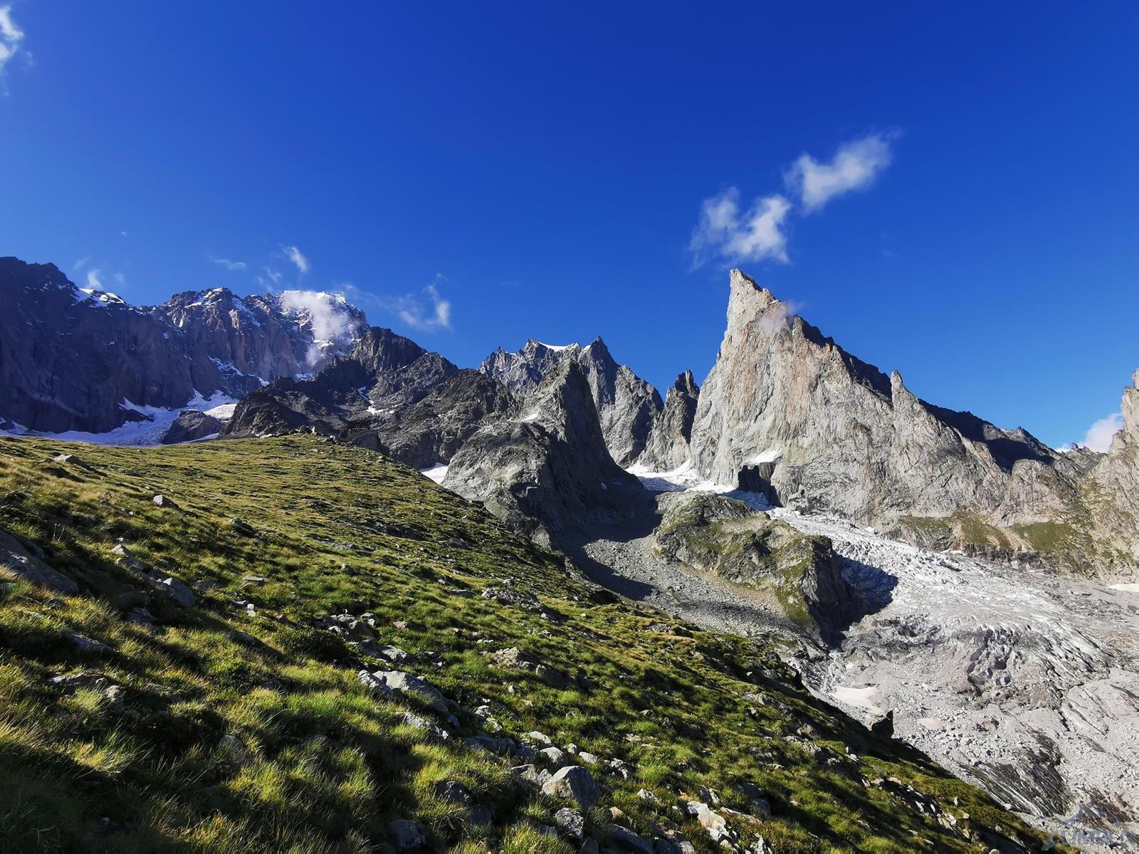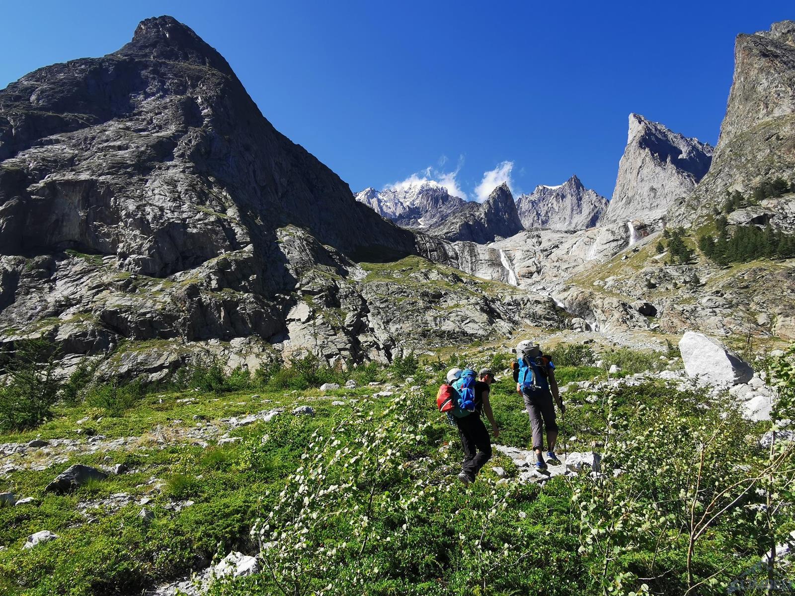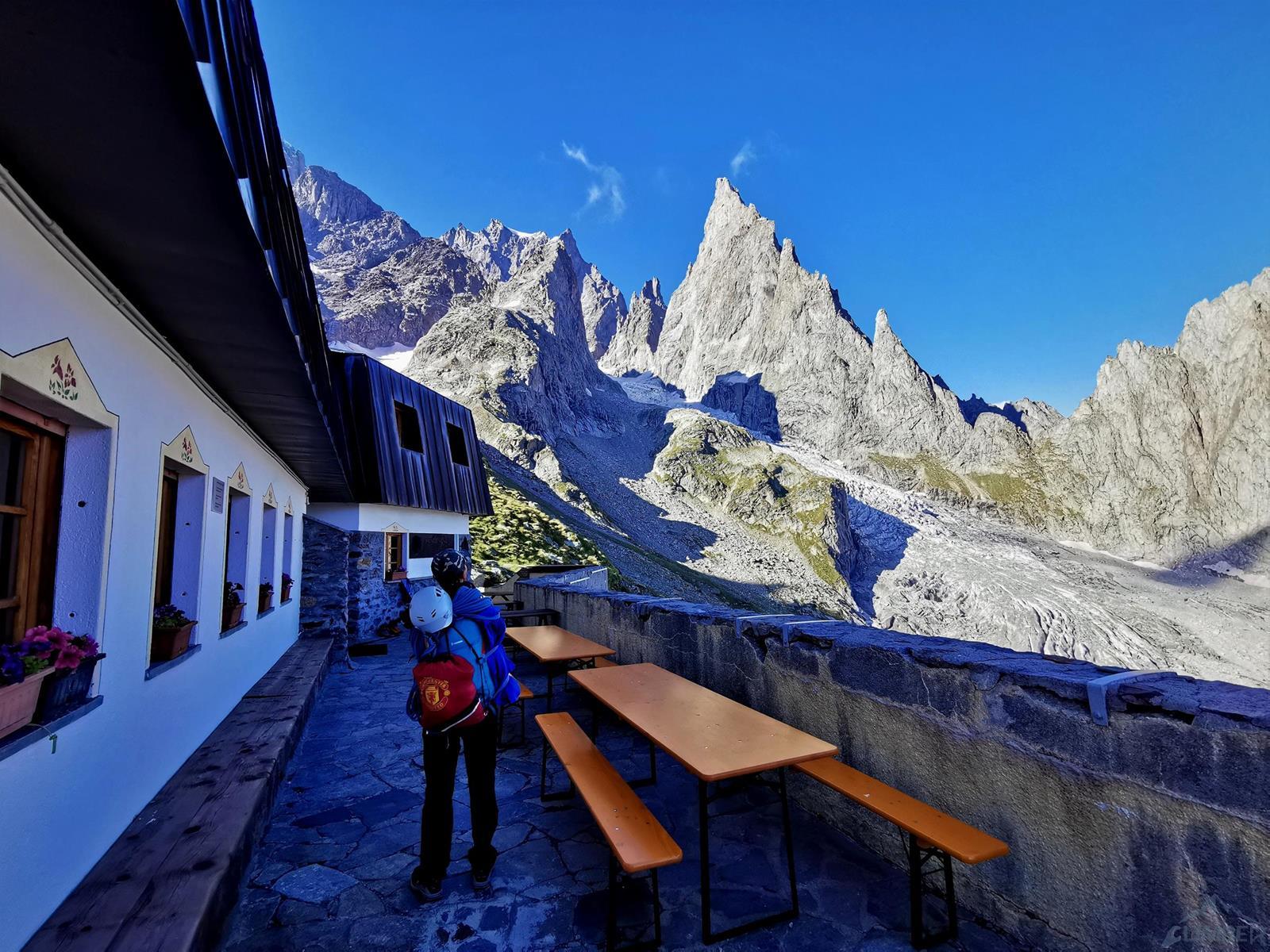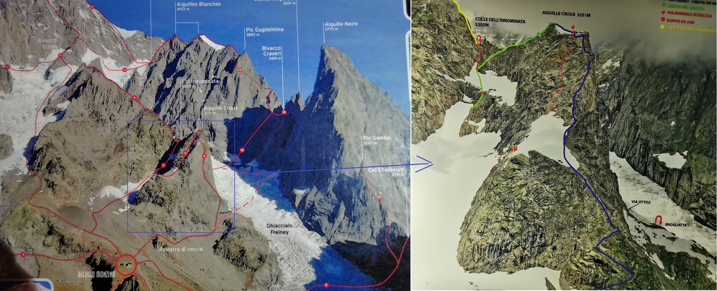 Trasa z parkingu w Val Veny (ok. 1 600 m.) do Monzino (2 560 m.) zajmuje nam niecałe dwie godziny – z lasu wychodzimy na zielone łąki poprzecinane potokami, po czym pokonujemy dwie krótkie ferraty. Podejście urozmaicają kapitalne widoki – nie tylko na „naszą” ścianę, ale również południowe filary Mont Blanc, Aiguille Blanche czy Punta Guglierminę. Po dotarciu do schroniska koledzy ruszają sprawdzić czy uda się dostać na lodowiec przy Aiguille Croux i dotrzeć pod ścianę Noire trasą krótszą (ok. 2 godzin) czy też czeka nas żmudna, 4-godzinna opcja obejmująca 600-metrowe podejście i wspinanie na Col de l'Innominata, zjazdy oraz przetrawersowanie lodowca.
