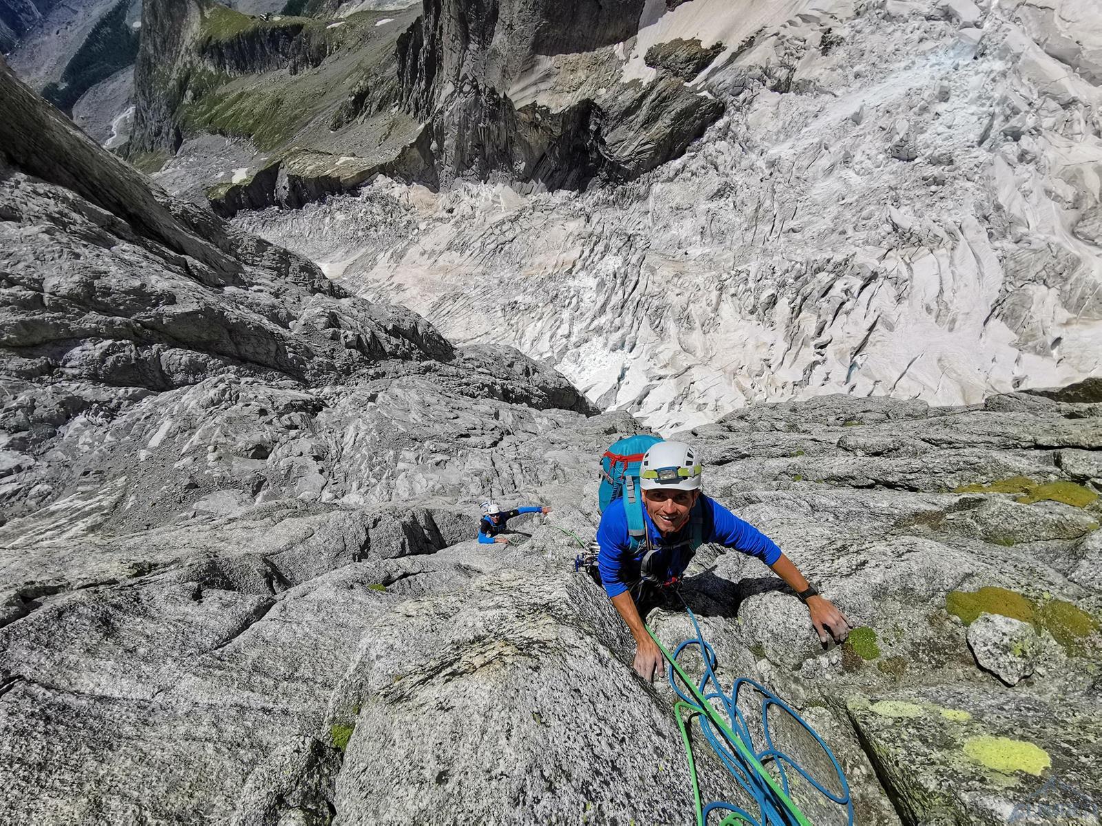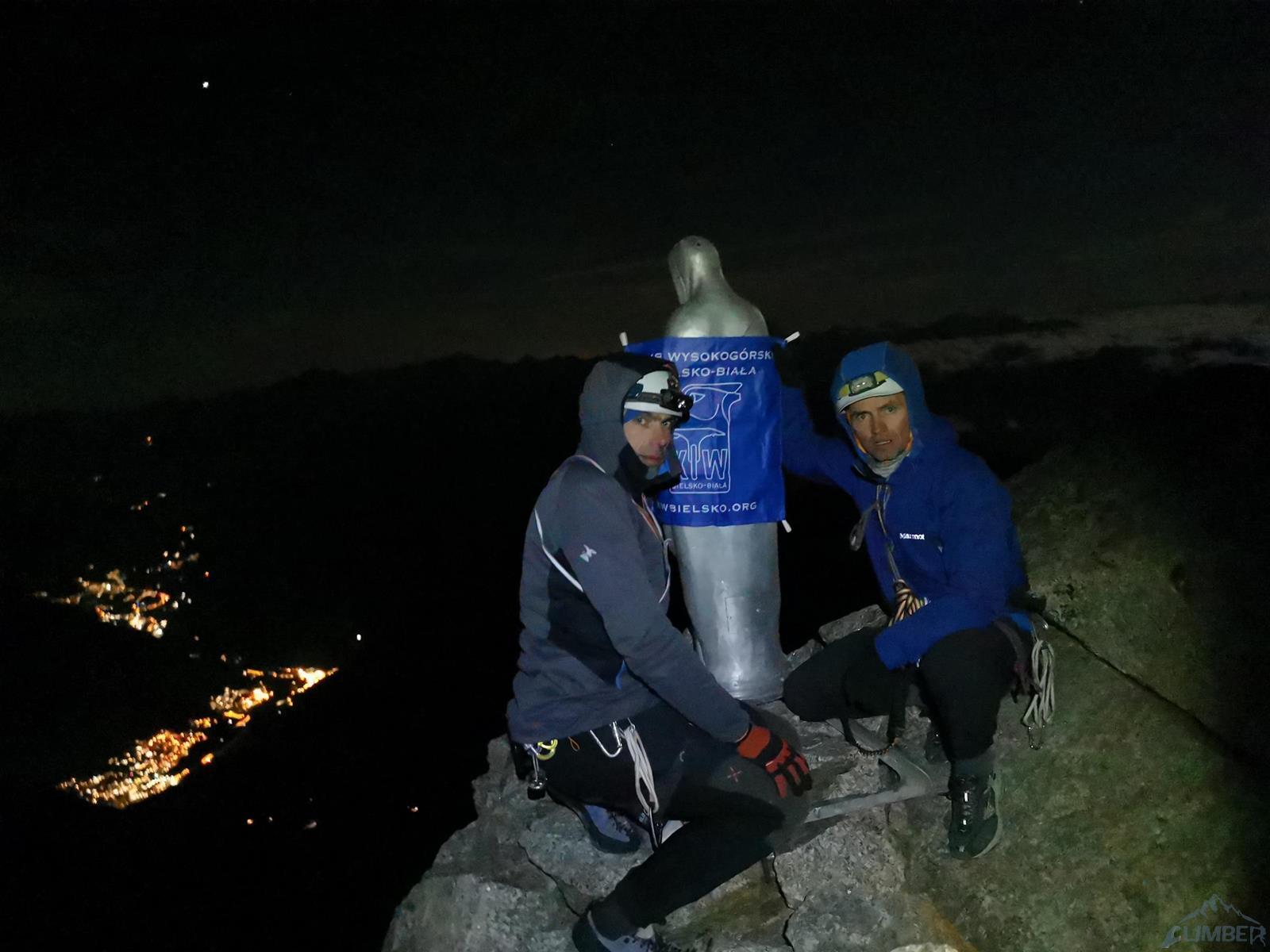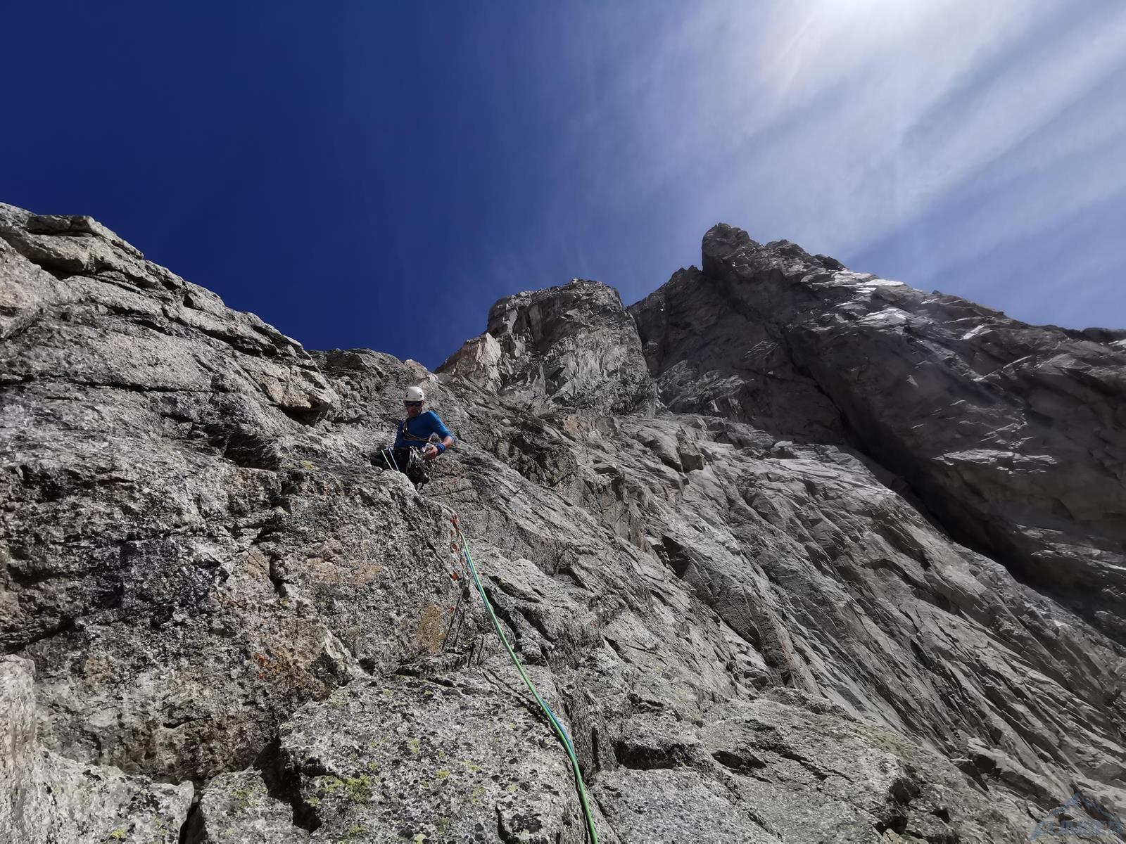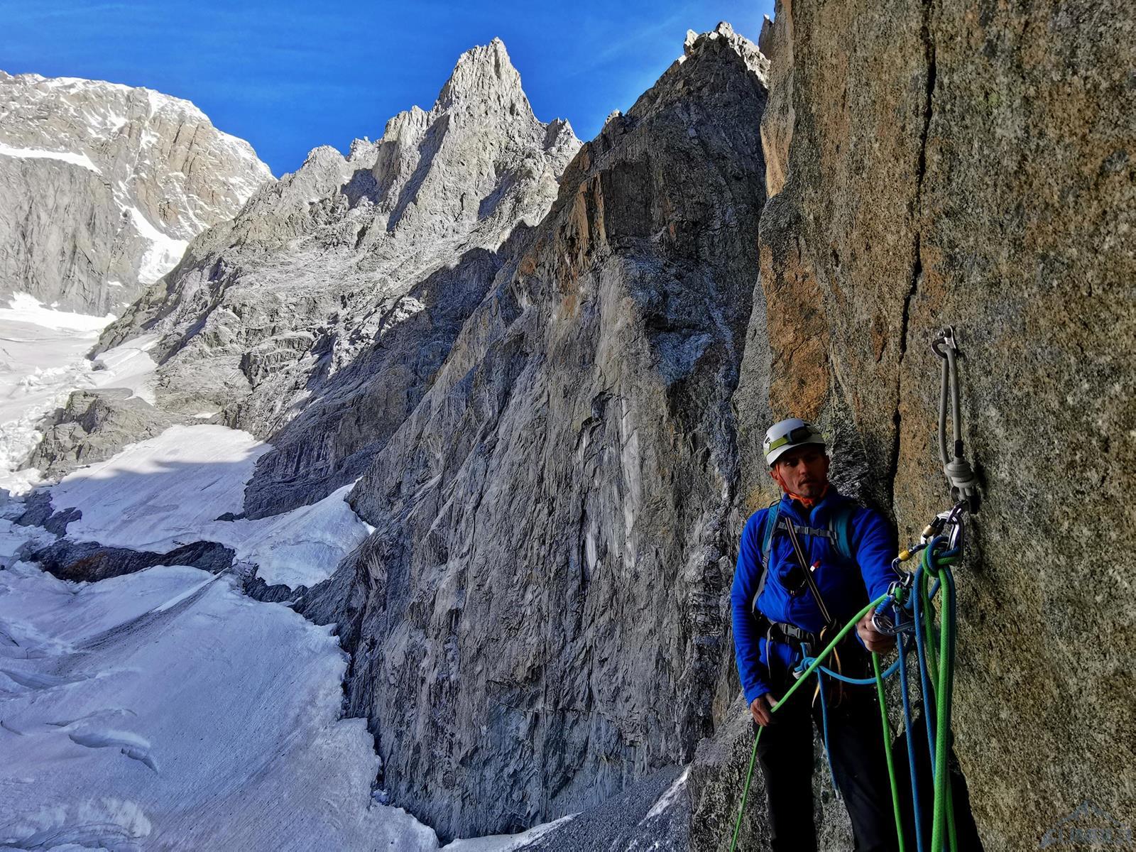 Kolejny wyciąg zaczyna się trawersem w prawo, idziemy kominem do góry i po kilku metrach mijamy stan, po czym kierujemy się w lewo i robimy własny stan w dogodnym miejscu – jest kilka możliwości. Zmieniam zmęczonego Romka na prowadzeniu – przed nami około 100 metrów do grani, teren daje dużo możliwości, a zbliżający się zmrok nie ułatwia orientacji. Pierwszy odcinek przechodzimy systemem płyt i rys (V+) kierując się delikatnie w lewo w kierunku widocznych zacięć wyjściowych. Kolejny fragment zaczyna się dość przyjemnie (ok. V), wyżej robi się dziwnie trudno – kolejne zacięcia zaczynają stawać dęba i choć trafiają się czasem jakieś pojedyncze haki, najłatwiejsza opcja (miało być IV+) na pewno to nie jest 😊. Ostatni wyciąg prowadzę już po ciemku i 10 metrów pod granią ogarniają mnie wątpliwości czy wybranym wariantem do niej dotrę – finalnie jednak udaje się, namierzam stanowisko i kilka minut później dołącza do mnie reszta zespołu. Zrzucamy sprzęt, ubieramy ciepłe ciuchy i dopełniamy formalności – podchodzimy kilkadziesiąt metrów wzdłuż grani (II) na szczyt Aiguille Noire de Peuterey (3 773 m.), robimy pamiątkową fotę z podziurawioną przez pioruny Maryjką i wracamy do stanowiska by rozpocząć zjazdy.