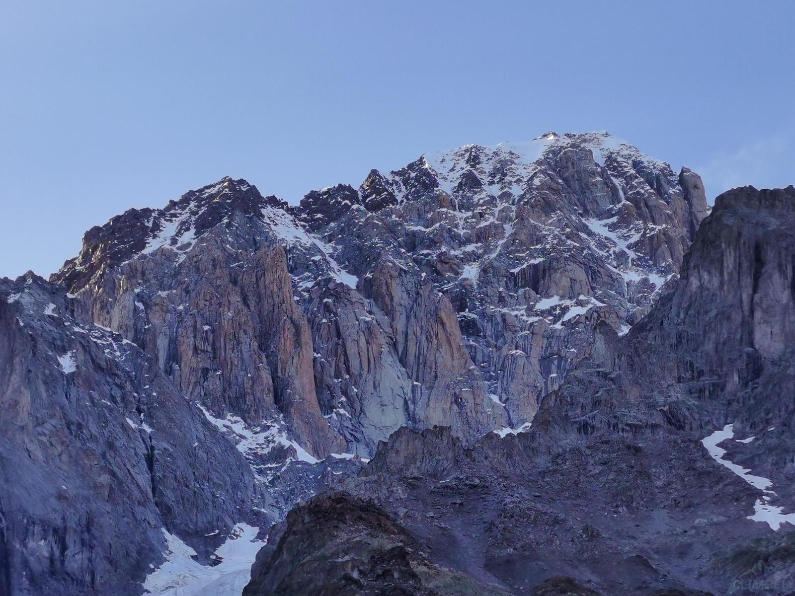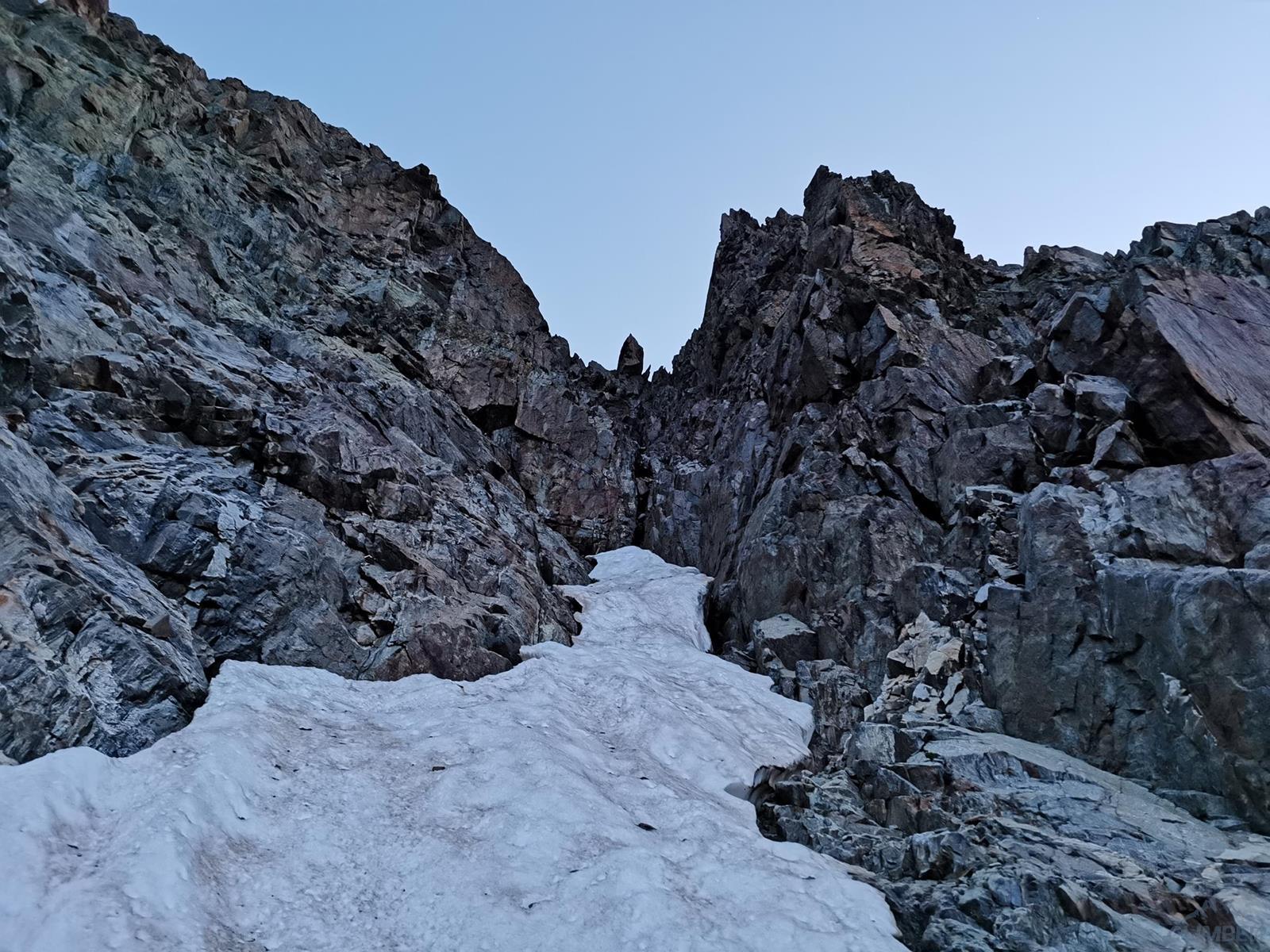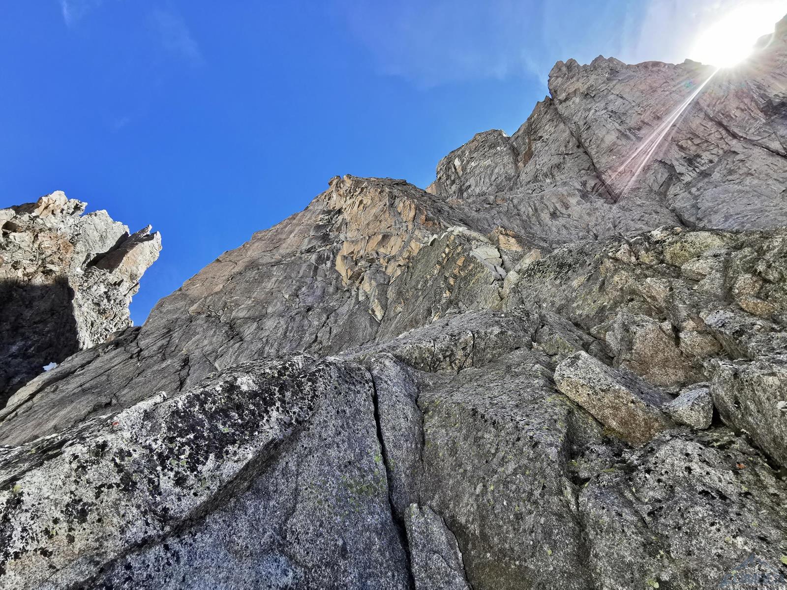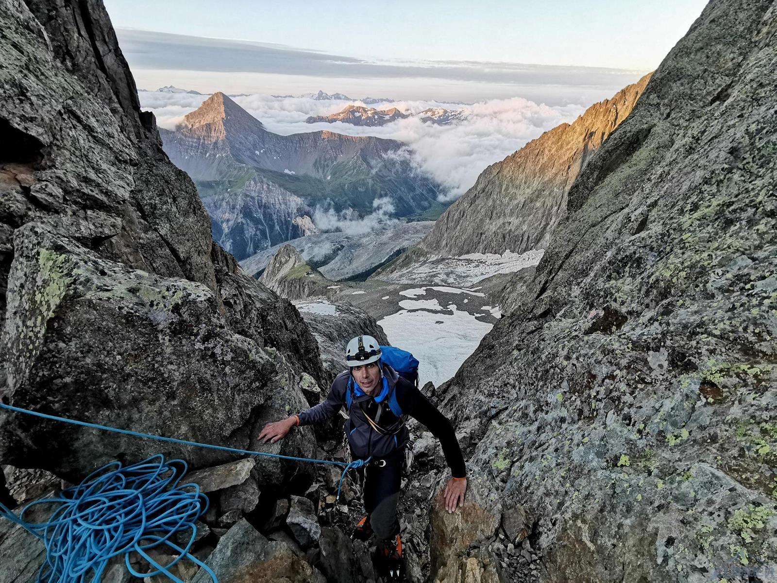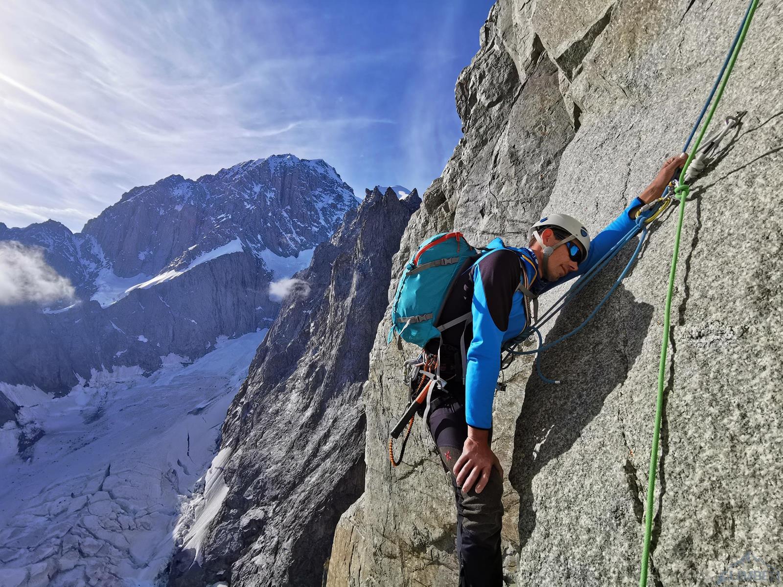 Kolejny wyciąg zaczyna się trawersem w prawo, idziemy kominem do góry i po kilku metrach mijamy stan, po czym kierujemy się w lewo i robimy własny stan w dogodnym miejscu – jest kilka możliwości. Zmieniam zmęczonego Romka na prowadzeniu – przed nami około 100 metrów do grani, teren daje dużo możliwości, a zbliżający się zmrok nie ułatwia orientacji. Pierwszy odcinek przechodzimy systemem płyt i rys (V+) kierując się delikatnie w lewo w kierunku widocznych zacięć wyjściowych. Kolejny fragment zaczyna się dość przyjemnie (ok. V), wyżej robi się dziwnie trudno – kolejne zacięcia zaczynają stawać dęba i choć trafiają się czasem jakieś pojedyncze haki, najłatwiejsza opcja (miało być IV+) na pewno to nie jest 😊. Ostatni wyciąg prowadzę już po ciemku i 10 metrów pod granią ogarniają mnie wątpliwości czy wybranym wariantem do niej dotrę – finalnie jednak udaje się, namierzam stanowisko i kilka minut później dołącza do mnie reszta zespołu. Zrzucamy sprzęt, ubieramy ciepłe ciuchy i dopełniamy formalności – podchodzimy kilkadziesiąt metrów wzdłuż grani (II) na szczyt Aiguille Noire de Peuterey (3 773 m.), robimy pamiątkową fotę z podziurawioną przez pioruny Maryjką i wracamy do stanowiska by rozpocząć zjazdy.
