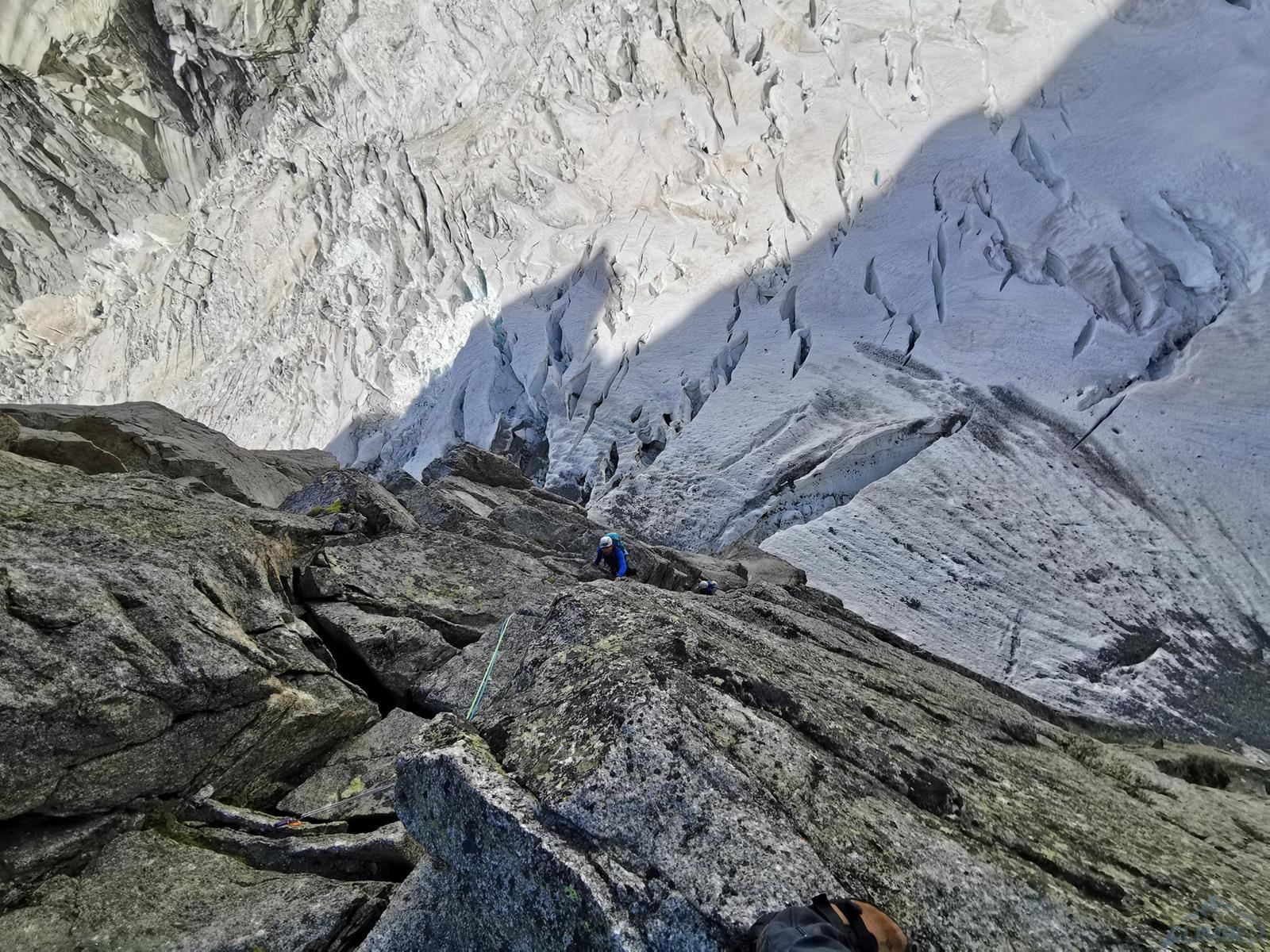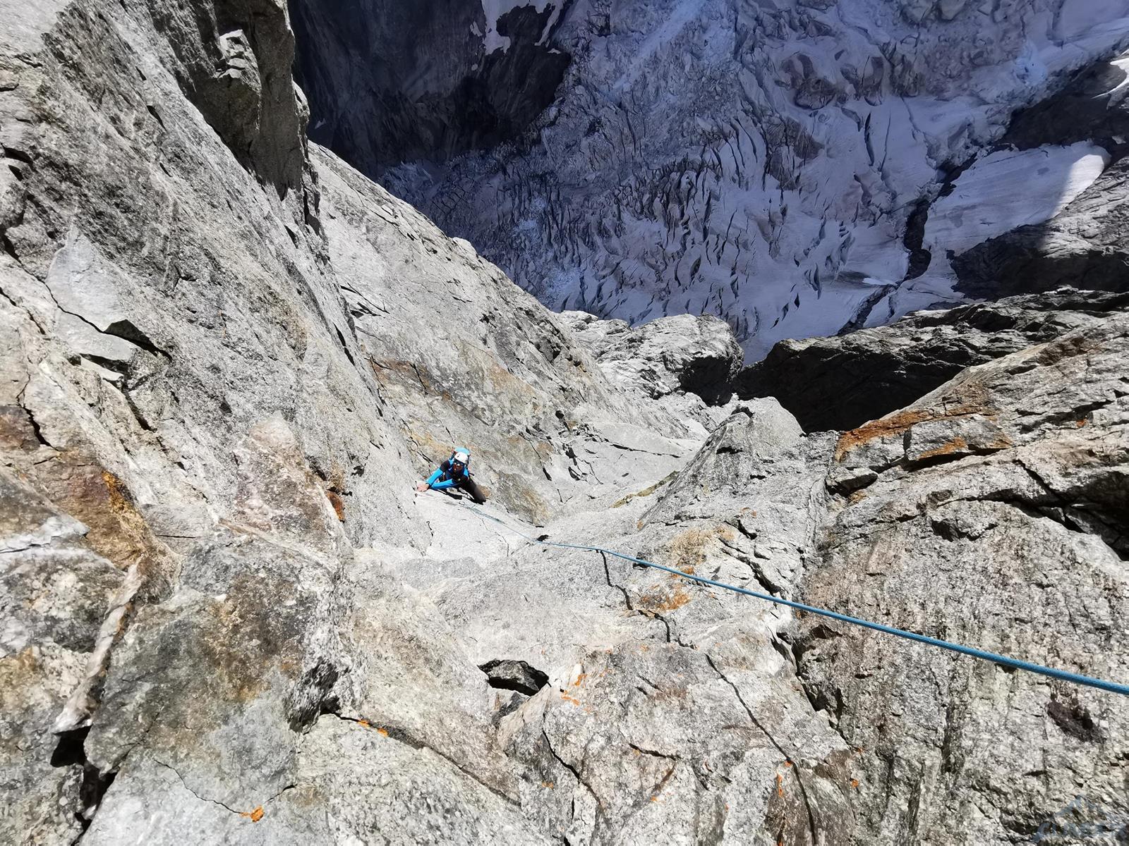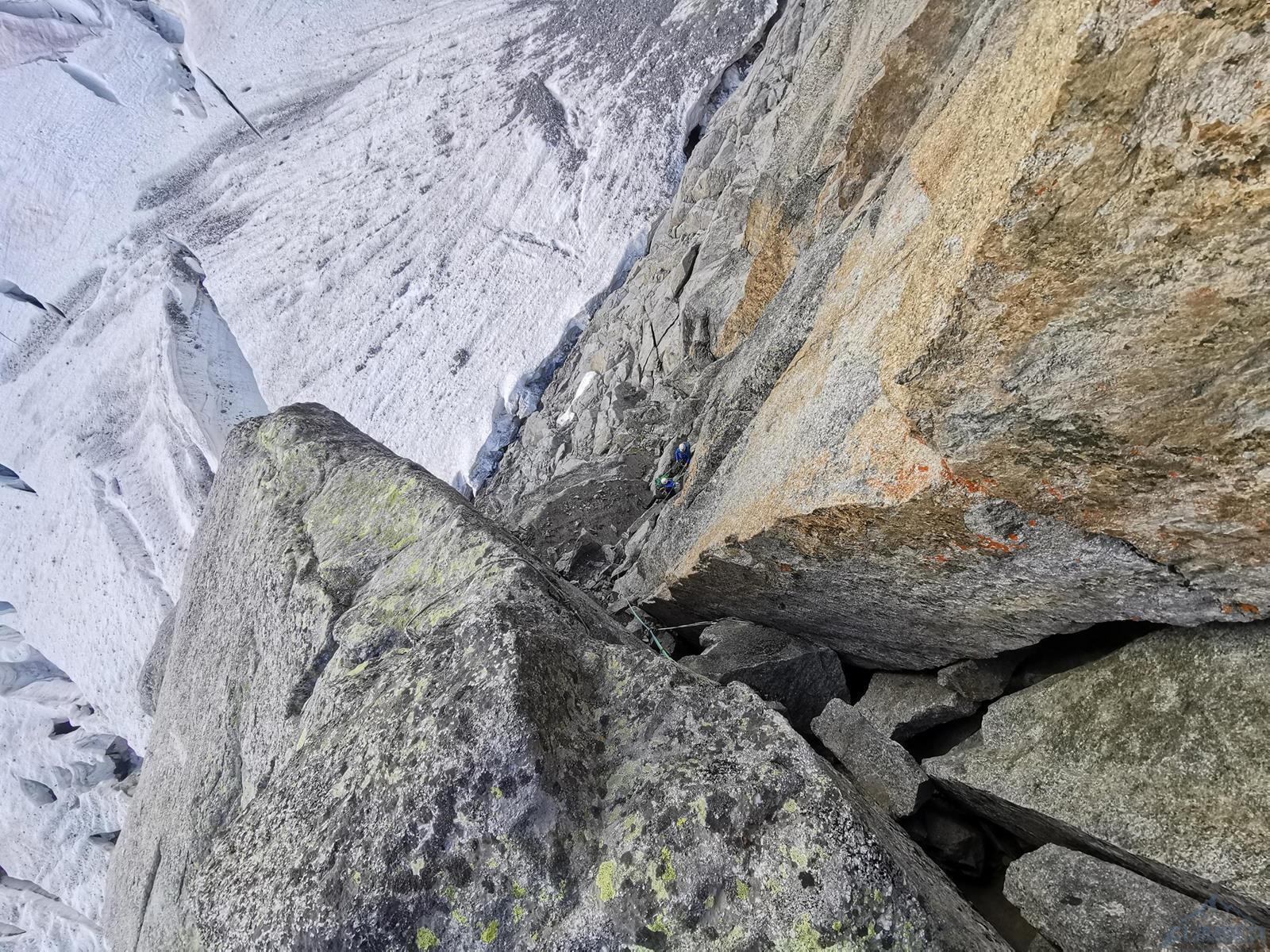 Startujemy o 5 rano i kierujemy się do góry wyraźną ścieżką, prowadzącą również do biwaku Eccles pod południowymi ścianami Mont Blanc. Ze ścieżki odbijamy w kierunku małego lodowca Châtelet i nim kontynuujemy aż do najwyższej, położonej w górnym lewym rogu zatoki. Pierwszy próg skalny pokonujemy w zależności od warunków albo skałami po prawej (poręczówka w górnej części) albo wprost skalnymi depresjami, z których wychodzimy do stanowiska po prawej stronie. My wybieramy drugą opcję – wychodzi jeden 60-metrowy wyciąg z trudnościami ok. IV/M4. Przechodzimy krótkie pole lodowe i wchodzimy do kruchego skalnego żlebu, który pokonujemy na lotnej (ok. 100 metrów trójkowego wspinania) by dotrzeć do przełęczy - Col de l'Innominata (3 205 m). Stąd warto przyjrzeć się układowi szczelin na lodowcu, który musimy przetrawersować by dostać się pod zachodnią ścianę Aiguille Noire. Zjeżdżamy z gotowych stanowisk (na 2-3 razy) i szukamy przejścia przez lodowy labirynt – w naszym przypadku podeszliśmy do góry około 100 metrów i systemem korytarzy oraz mostków przedostaliśmy się na drugą stronę. Znakowanie naszej trasy okazało się niepotrzebne – najpierw w ciągu dnia pod wpływem ciepła zapadały się mostki oraz waliły się seraki, później w ciągu nocy pod wpływem zastygania lodu odpadały duże bloki 😊. Jakkolwiek przejście w jedną i drugą stronę tuż po świcie okazało się opcją najbezpieczniejszą.