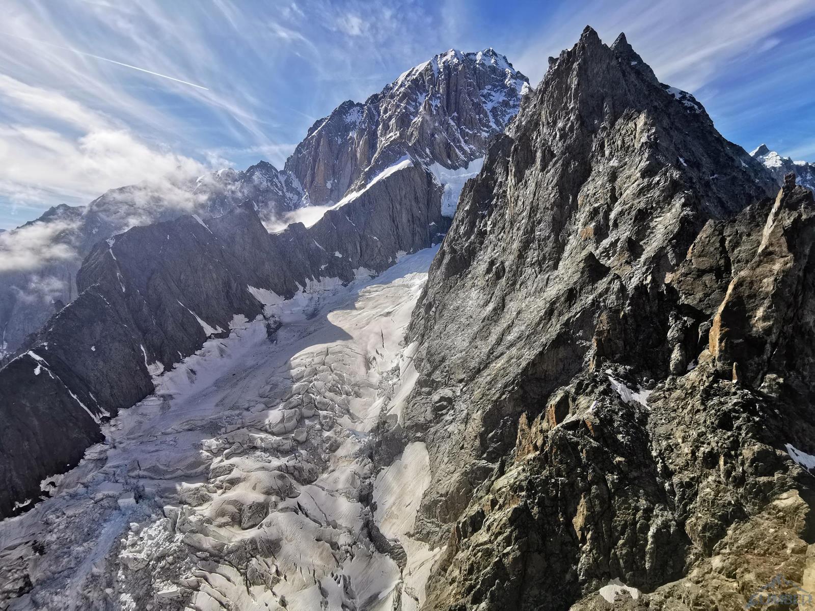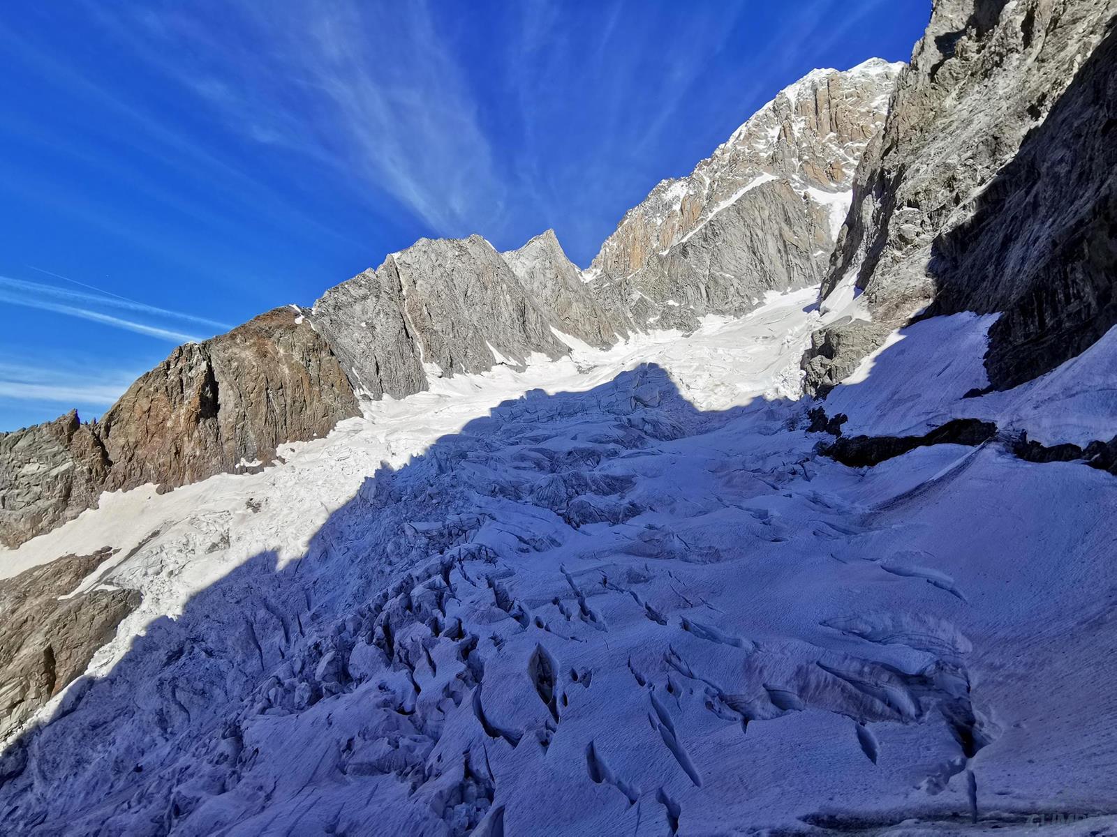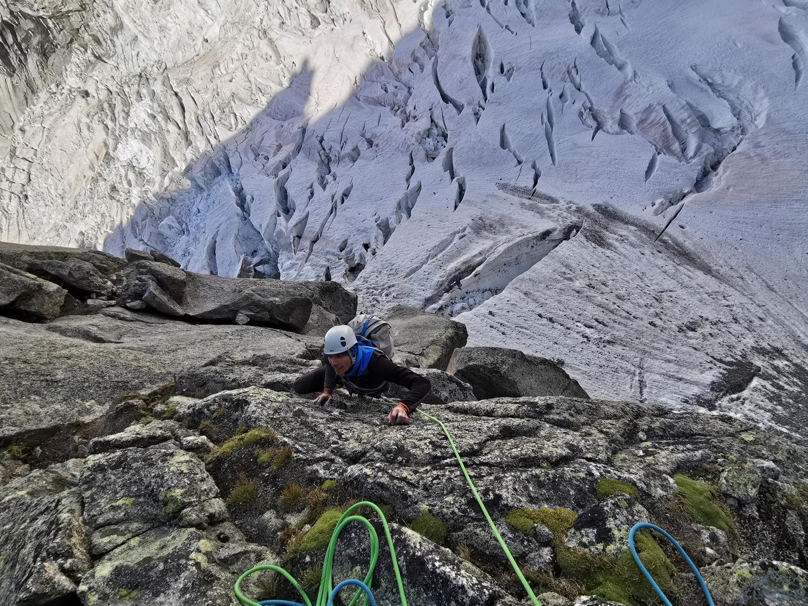 Startujemy o 5 rano i kierujemy się do góry wyraźną ścieżką, prowadzącą również do biwaku Eccles pod południowymi ścianami Mont Blanc. Ze ścieżki odbijamy w kierunku małego lodowca Châtelet i nim kontynuujemy aż do najwyższej, położonej w górnym lewym rogu zatoki. Pierwszy próg skalny pokonujemy w zależności od warunków albo skałami po prawej (poręczówka w górnej części) albo wprost skalnymi depresjami, z których wychodzimy do stanowiska po prawej stronie. My wybieramy drugą opcję – wychodzi jeden 60-metrowy wyciąg z trudnościami ok. IV/M4. Przechodzimy krótkie pole lodowe i wchodzimy do kruchego skalnego żlebu, który pokonujemy na lotnej (ok. 100 metrów trójkowego wspinania) by dotrzeć do przełęczy - Col de l'Innominata (3 205 m). Stąd warto przyjrzeć się układowi szczelin na lodowcu, który musimy przetrawersować by dostać się pod zachodnią ścianę Aiguille Noire. Zjeżdżamy z gotowych stanowisk (na 2-3 razy) i szukamy przejścia przez lodowy labirynt – w naszym przypadku podeszliśmy do góry około 100 metrów i systemem korytarzy oraz mostków przedostaliśmy się na drugą stronę. Znakowanie naszej trasy okazało się niepotrzebne – najpierw w ciągu dnia pod wpływem ciepła zapadały się mostki oraz waliły się seraki, później w ciągu nocy pod wpływem zastygania lodu odpadały duże bloki 😊. Jakkolwiek przejście w jedną i drugą stronę tuż po świcie okazało się opcją najbezpieczniejszą.