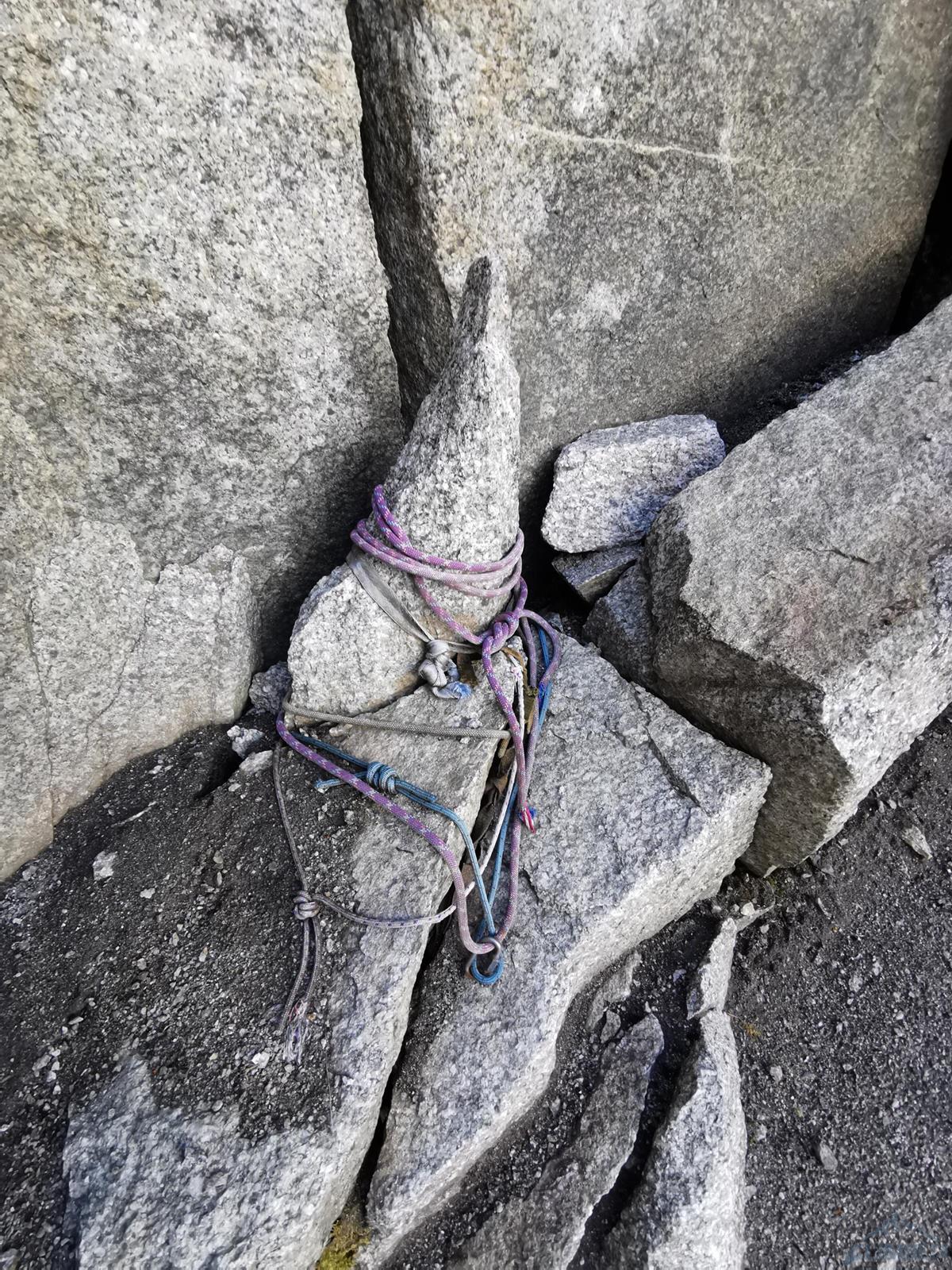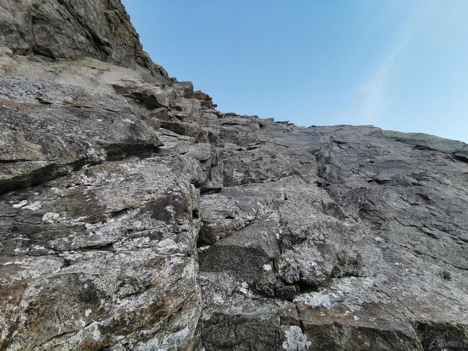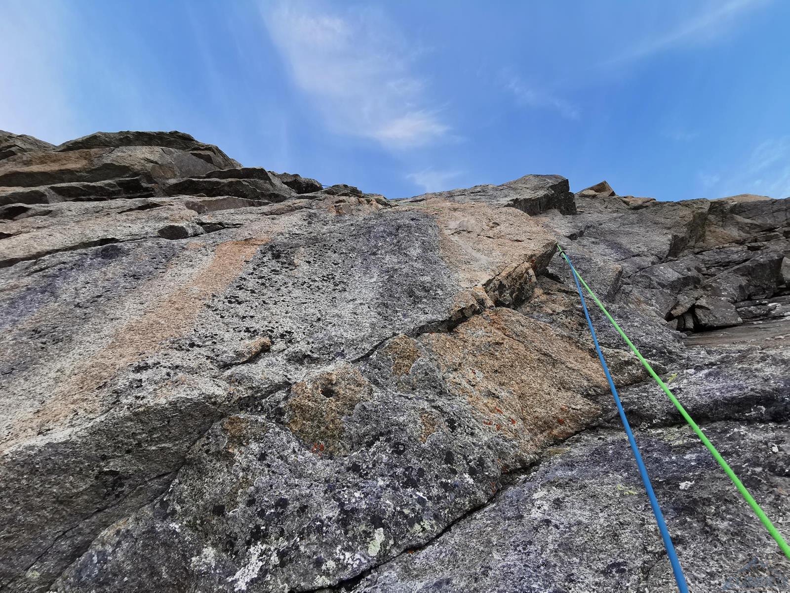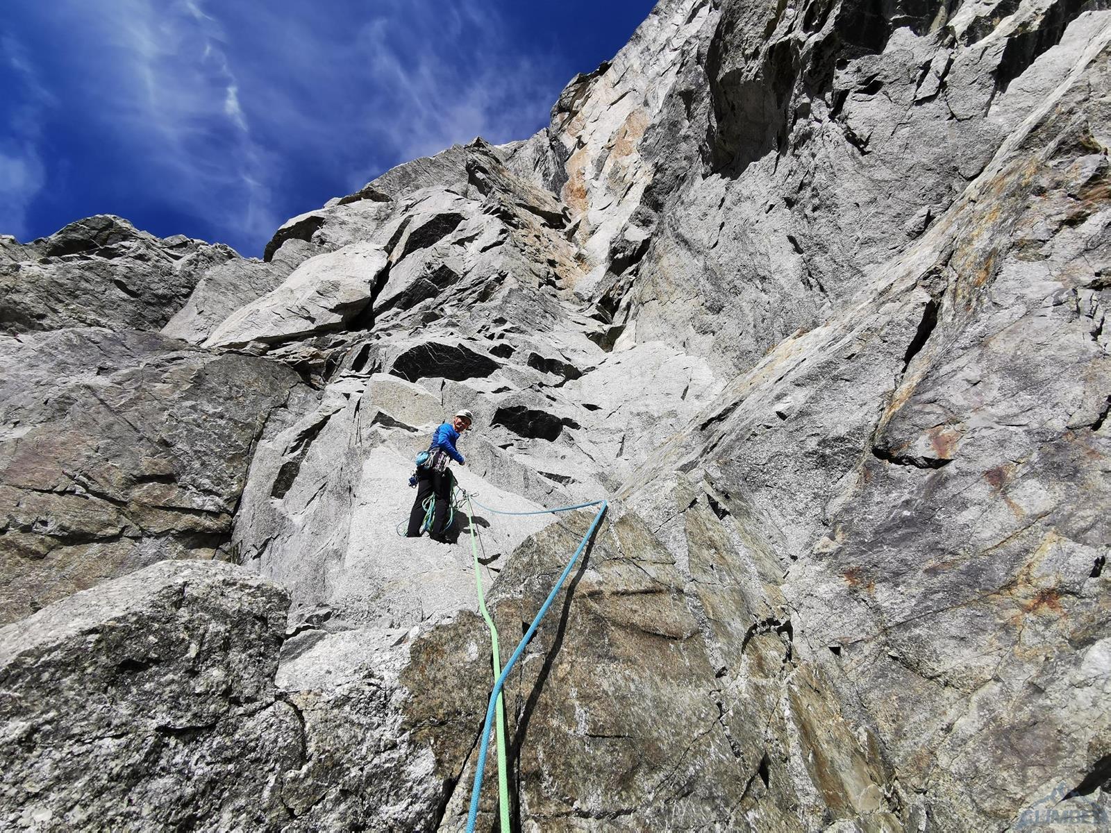 Pod ścianą meldujemy się po 9 rano i namierzamy charakterystyczny komin z zaklinowanymi blokami (drugi wyciąg) – droga startuje wymytymi skałami na lewo pod nim. Umawiamy się, że cała dolna część ściany przypadnie w prowadzeniu mi - potrzeba poruszać się jak najszybciej w miejscami niezbyt ewidentnym terenie, co skutkuje delikatnymi zejściami z linii drogi i napotykaniem innych trudności niż oryginalnie. Najczęściej jednak podążając śladami autorów drogi szukamy intuicyjnie jak najłatwiejszej linii przejścia w jak najbardziej litym terenie, nie przejmując się drobnymi wariantami – najważniejsze jest namierzenie kolejnego stanowiska. Ogromnym ułatwieniem jest bowiem to, że każdy stan wygląda tak samo – składa się z dwóch spitów z koluchem, połączonych białą liną. Daje to dodatkowo możliwość powrotu pod ścianą linią drogi oraz wycofu w razie problemów lub zbyt wolnego tempa wspinaczki. Co do sprzętu - w zupełności wystarczy standardowy, bez dublowania (ewentualnie dodatkowe małe rozmiary na wyciąg hakowy). Młotek używaliśmy tylko do dobijania starych haków, obeszłoby się bez niego.