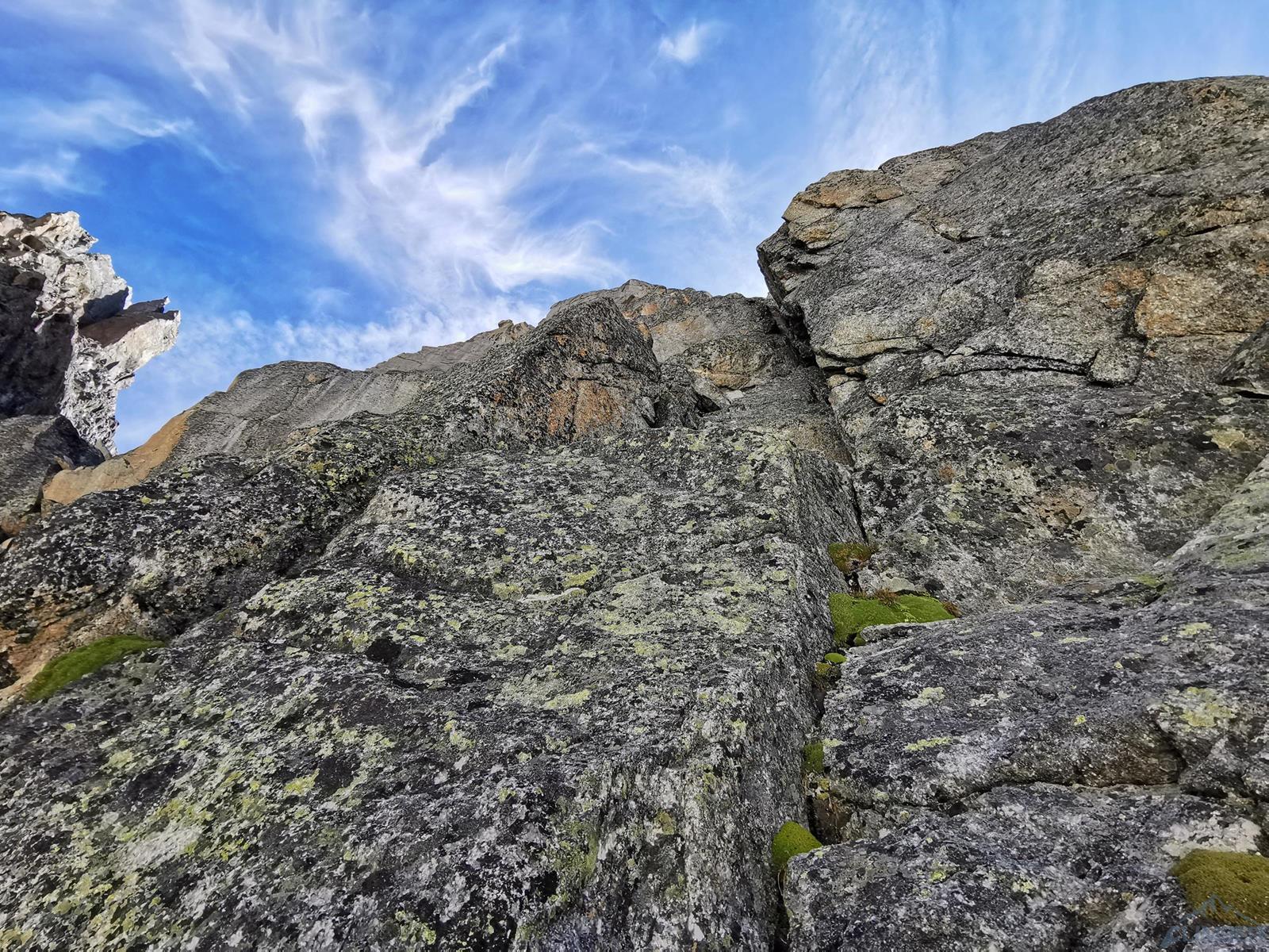 Pierwsze 15-20 metrów to łatwe (III) dojście do stanowiska „zerowego”, jeżeli wracamy pod ścianę zjazdami - można zostawić tam zbędne rzeczy oraz buty z rakami i czekany. Drugi wyciąg (ok. 40m.) ma kilka wariantów, generalnie kierujemy się płytami w kierunku dużego tarasu pod wspomnianym na wstępie kominem, najłatwiej (V) dostać się na niego z lewej strony. W kominie czeka nas ciekawe wspinanie (solidne V), po jego przejściu pokonujemy jeszcze jedną ściankę – robię to wariantem po lewej z piękną rysą za ok. VI (łatwiej ale brzydko jest po prawej) i płytami skośnie w lewo docieramy do stanu. Stąd wspinamy się systemem kominów i zacięć (V+) do stanu na półce po lewej. Przechodzimy płytkę nad stanem (V) i mocno trawersujemy w prawo pod pochylonym głazem, po wyjściu w łatwy teren w pierwszym dogodnym miejscu skręcamy ostro do góry na ścianę filara – celujemy w widoczne stanowisko. Dwa kolejne wyciągi (po 50 metrów) prowadzą łatwymi zacięciami i rysami, staramy się szukać litego terenu o trudnościach do IV, który doprowadzi nas do sporego wypłaszczenia pod stromą ścianą. Wyciąg siódmy jest bardzo ładny – zaczynamy od trawersu 5 metrów w prawo od stanowiska i wchodzimy w przewieszoną rysę (V+), z której kolejnymi pęknięciami kontynuujemy do stanowiska (ok. 50 metrów).
