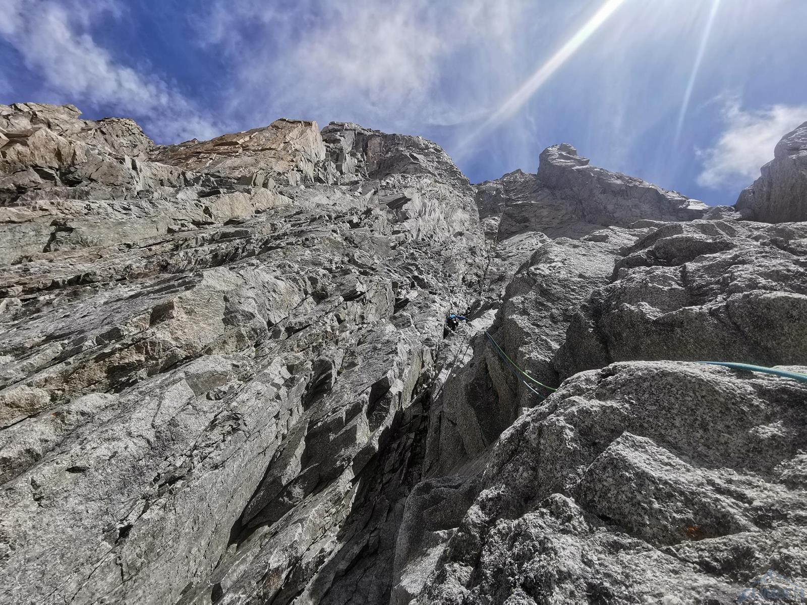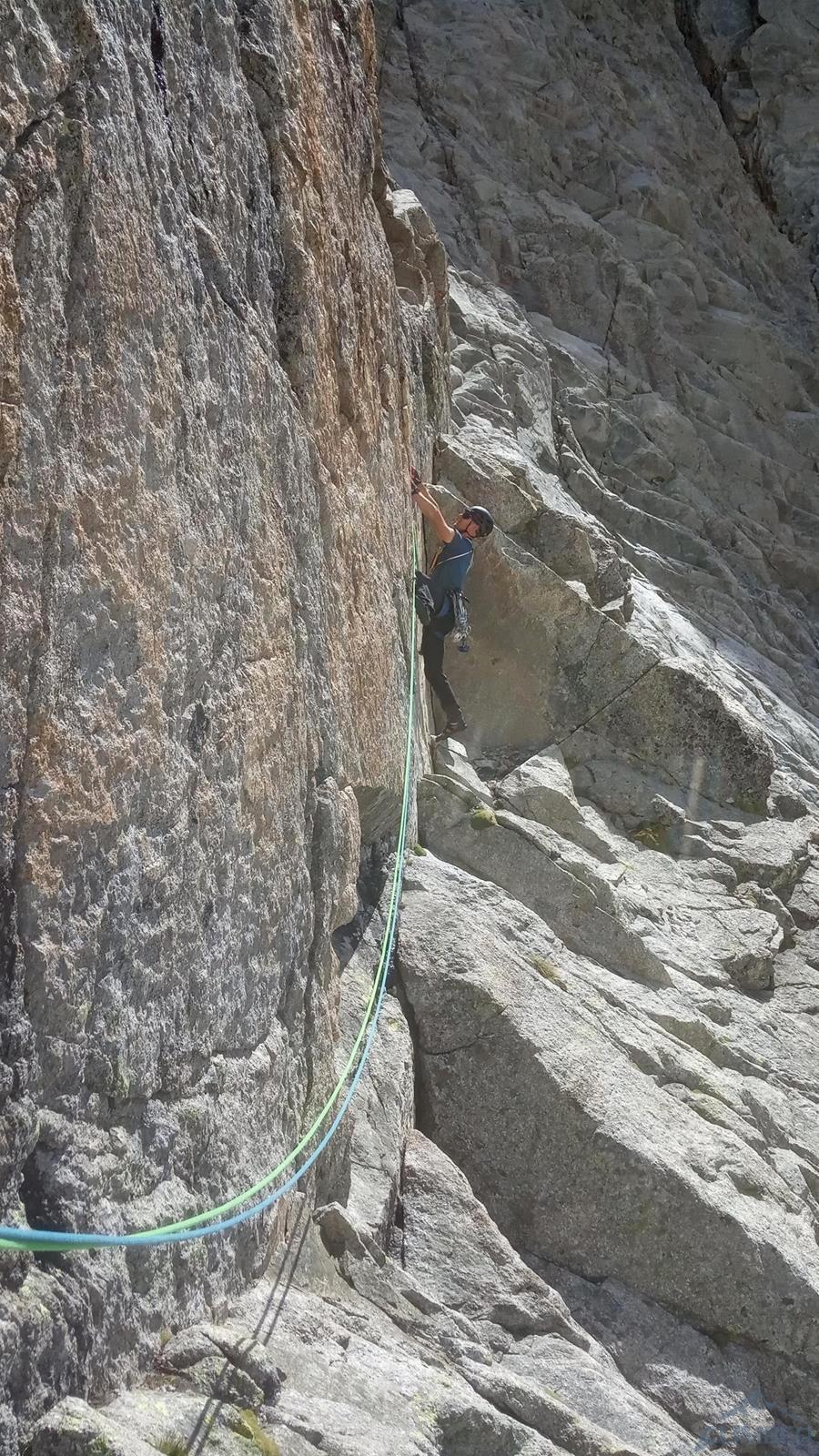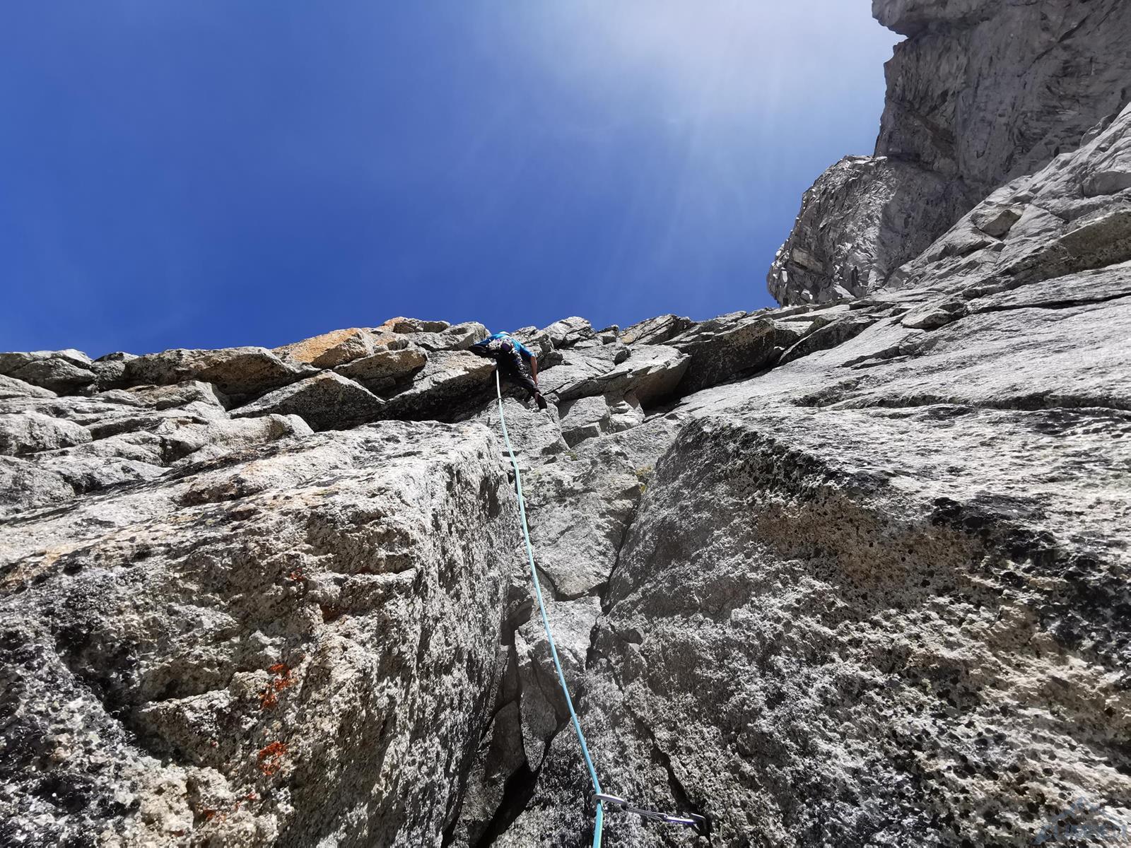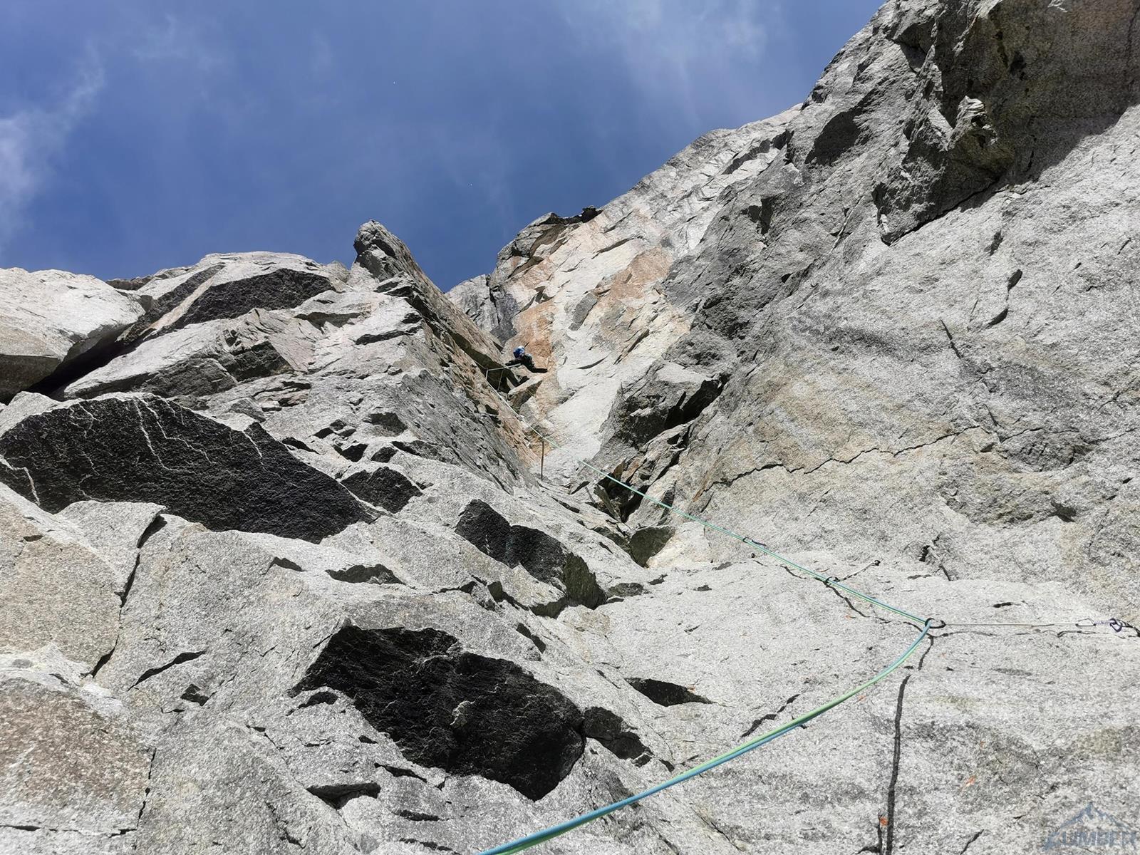 Prowadzenie przejmuje Szymon – startujemy kominem i przechodzimy w lewo między przewieszkami na połogi taras, nad którym czeka nas dość wymagająca (mocne jak na V+) ścianka. Kolejne wyciągi (9-11) to około 150 metrów łatwego terenu (III-IV), dla zyskania czasu pokonujemy go na lotnej. Wspinamy się najpierw świetnie urzeźbionymi płytami wzdłuż kantu filara, po wyjściu na jego spiętrzenie (nad czerwoną ścianką) skręcamy w prawo i dochodzimy do charakterystycznego siodełka. Stąd wspinamy się wzdłuż wyraźnego kanału, który przekraczamy w dogodnym miejscu i wypatrujemy stanowiska na półce. Ze stanu wspinamy się kawałek do góry i robimy trawers w lewo – według włoskiego opisu którym dysponujemy idziemy daleko i łukiem omijamy trudny teren. My zatrzymaliśmy się pod przewieszonym zacięciem z hakiem (wg starego topo V+ A0) i zaatakowaliśmy ten wariant – na pierwszego od tego momentu idzie Romek.