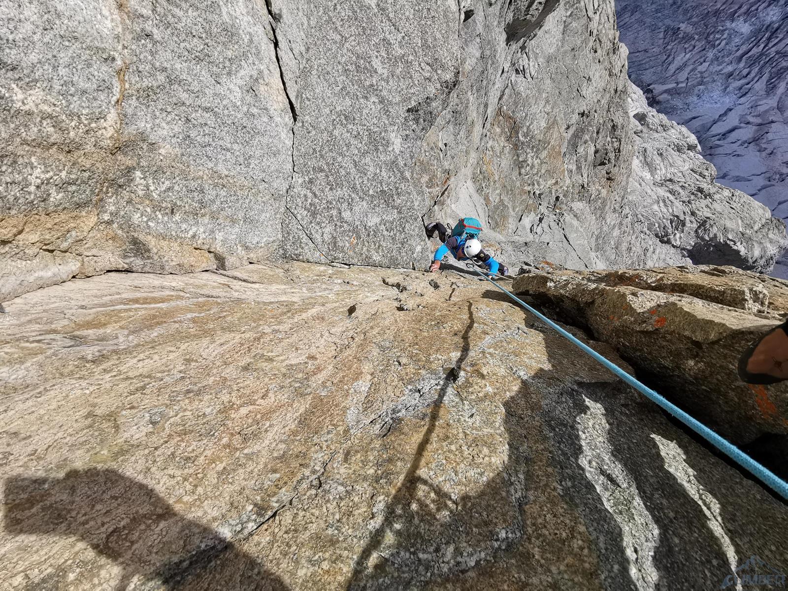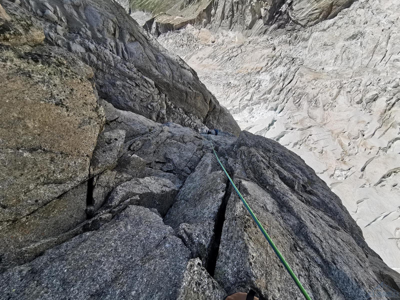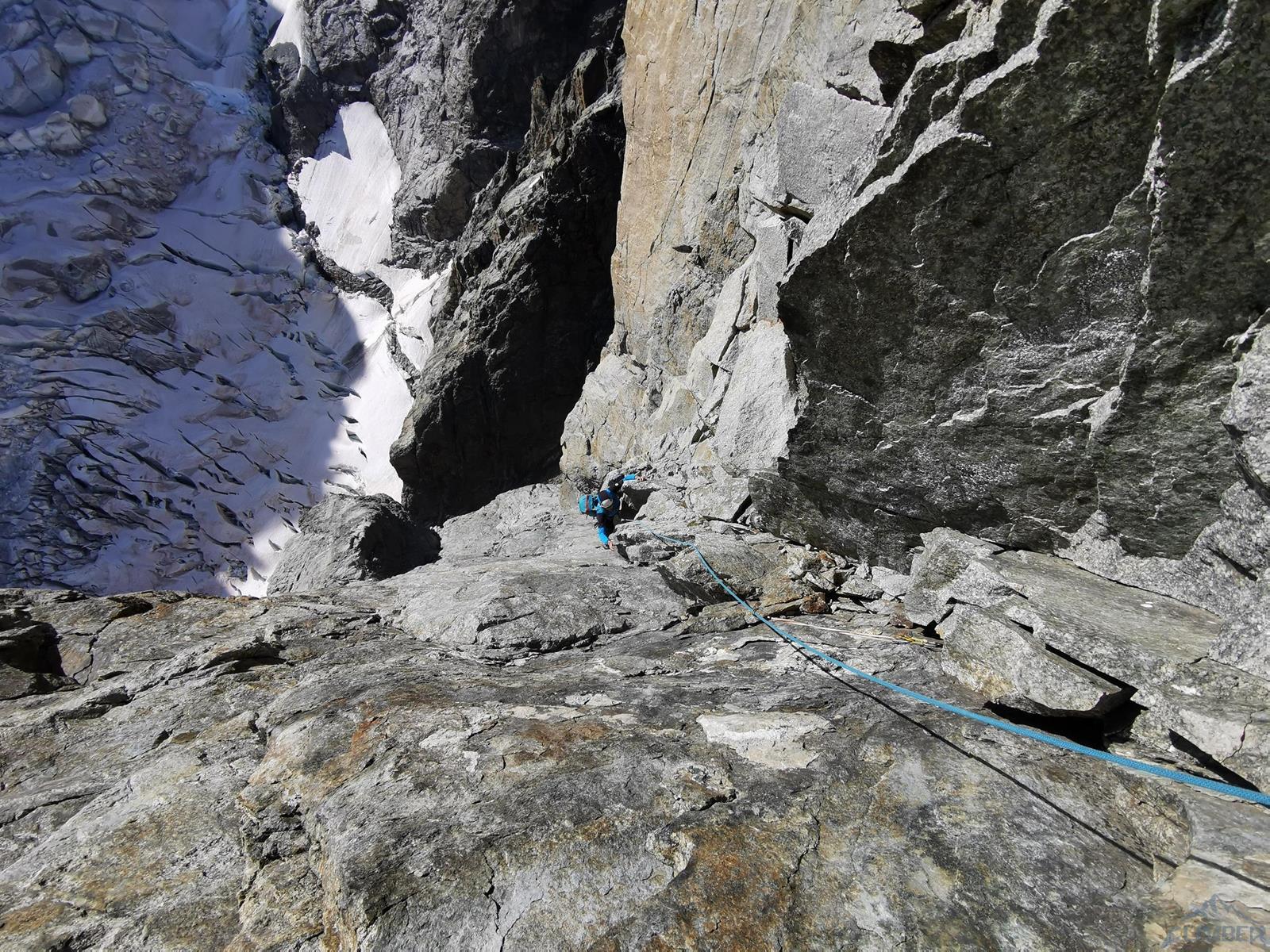 Prowadzenie przejmuje Szymon – startujemy kominem i przechodzimy w lewo między przewieszkami na połogi taras, nad którym czeka nas dość wymagająca (mocne jak na V+) ścianka. Kolejne wyciągi (9-11) to około 150 metrów łatwego terenu (III-IV), dla zyskania czasu pokonujemy go na lotnej. Wspinamy się najpierw świetnie urzeźbionymi płytami wzdłuż kantu filara, po wyjściu na jego spiętrzenie (nad czerwoną ścianką) skręcamy w prawo i dochodzimy do charakterystycznego siodełka. Stąd wspinamy się wzdłuż wyraźnego kanału, który przekraczamy w dogodnym miejscu i wypatrujemy stanowiska na półce. Ze stanu wspinamy się kawałek do góry i robimy trawers w lewo – według włoskiego opisu którym dysponujemy idziemy daleko i łukiem omijamy trudny teren. My zatrzymaliśmy się pod przewieszonym zacięciem z hakiem (wg starego topo V+ A0) i zaatakowaliśmy ten wariant – na pierwszego od tego momentu idzie Romek.