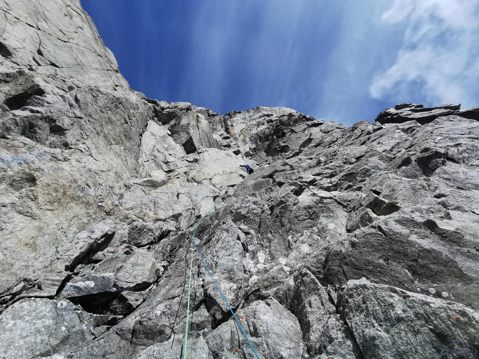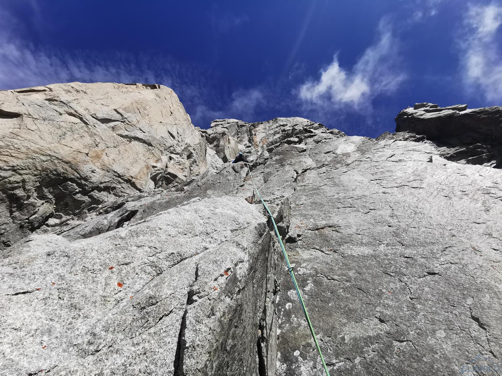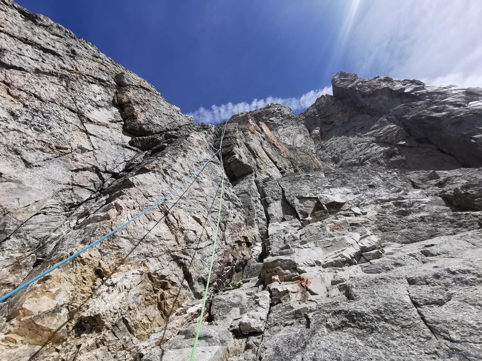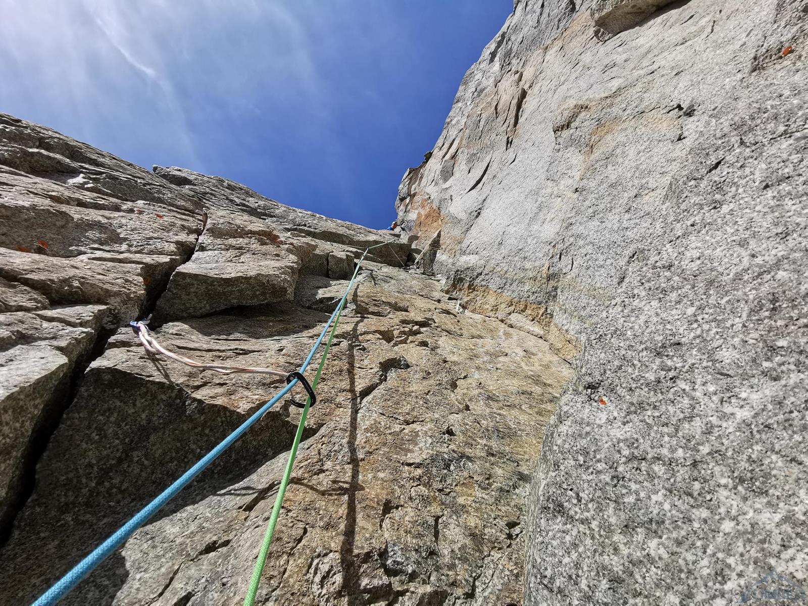 Prowadzenie przejmuje Szymon – startujemy kominem i przechodzimy w lewo między przewieszkami na połogi taras, nad którym czeka nas dość wymagająca (mocne jak na V+) ścianka. Kolejne wyciągi (9-11) to około 150 metrów łatwego terenu (III-IV), dla zyskania czasu pokonujemy go na lotnej. Wspinamy się najpierw świetnie urzeźbionymi płytami wzdłuż kantu filara, po wyjściu na jego spiętrzenie (nad czerwoną ścianką) skręcamy w prawo i dochodzimy do charakterystycznego siodełka. Stąd wspinamy się wzdłuż wyraźnego kanału, który przekraczamy w dogodnym miejscu i wypatrujemy stanowiska na półce. Ze stanu wspinamy się kawałek do góry i robimy trawers w lewo – według włoskiego opisu którym dysponujemy idziemy daleko i łukiem omijamy trudny teren. My zatrzymaliśmy się pod przewieszonym zacięciem z hakiem (wg starego topo V+ A0) i zaatakowaliśmy ten wariant – na pierwszego od tego momentu idzie Romek.