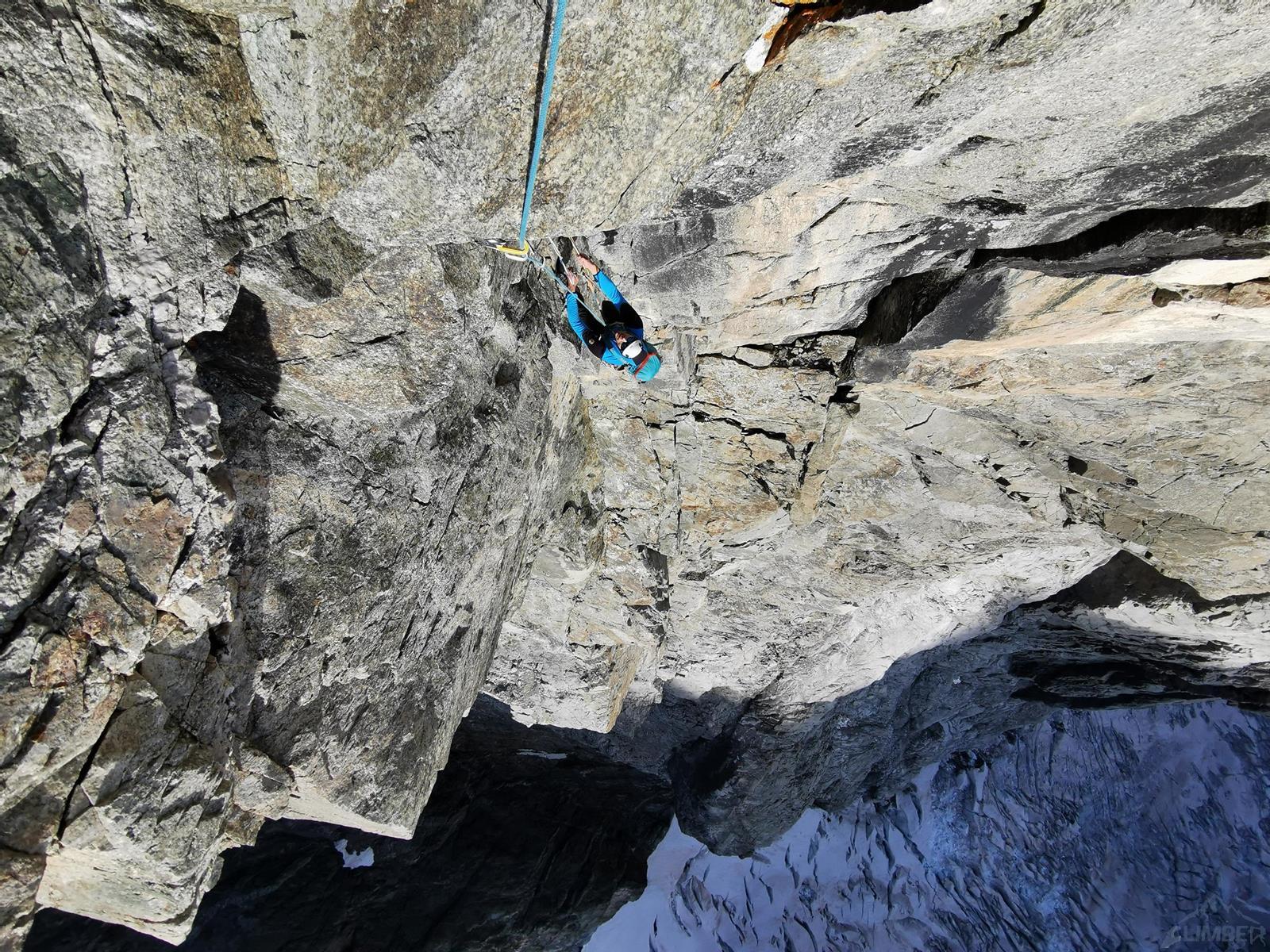 Po przejściu zacięcia (wg nas klasycznie co najmniej VI+) wspinamy się skośnie w lewo płytami z rysami, kierując się w stronę wielkiego komino-zacięcia ograniczonego z lewej strony wielką żółtą ścianą. Kolejny wyciąg doprowadzi nas do tego komina – podążamy nim aż do stanowiska pod stającymi dęba płytami i pięknym żółtym zacięciem po lewej stronie. Przed nami wyciąg 17-ty, klasycznie najtrudniejszy na drodze ale i chyba najładniejszy – zaczynamy odstrzeloną płytą na dilfra (ok. VI), po czym do wyboru mamy wariant rysą po lewej (6b) lub zacięciem z hakami po prawej (VI+ A0). Wybieramy opcję bardziej ambitną – Romek bez problemu przechodzi zarówno rysę jak i wyjście z przewieszenia, wspólne dla obu wariantów. Podążamy jego śladem, jest siłowo ale chwyty i stopnie są bardzo dobre, asekuracja również. Za nami wyciąg najbardziej wymagający wspinaczkowo, przed nami odcinek najbardziej wytężający – 30 metrów haczenia (A1) w przewieszonych zacięciach. Przed wejściem w ścianę zastanawiałem się czy jest szansa by przejść ten wyciąg klasycznie, gdy jednak zobaczyłem go z bliska, stało się jasne dlaczego nigdzie nie ma informacji o takim przejściu czy nawet samej wyceny 😉. Romek zbiera od nas wszystkie karabinki i taśmy, po czym zabiera się do roboty – idzie mu całkiem sprawnie, niektóre fragmenty przechodzi klasycznie, na pozostałych robi przepinki na starych hakach oraz własnych friendach. Z plecakami i wypinaniem przelotów mamy trochę gorzej ale do stanowiska docieramy w miarę szybko i nie tak zmordowani jak się spodziewaliśmy.