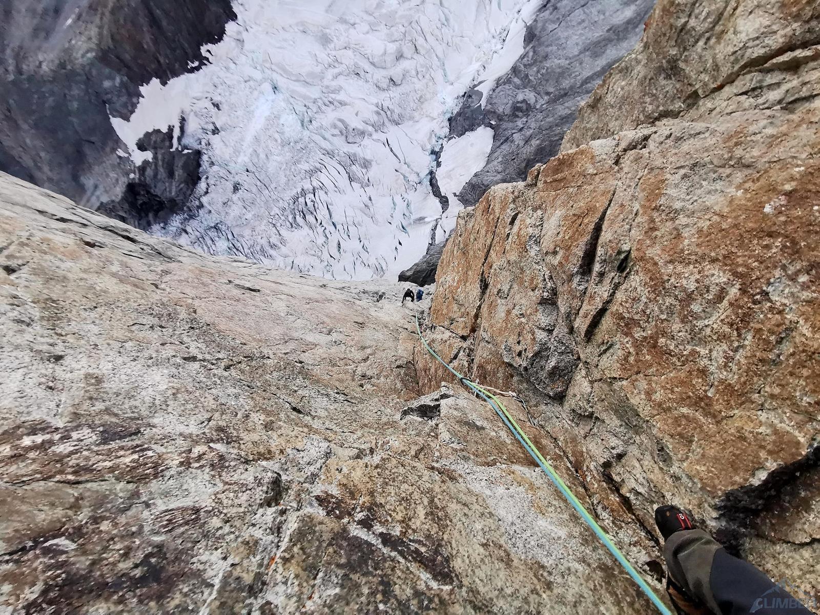 Ja zostaję na miejscu i zajmuję się rozplanowaniem wspinania, uzupełnieniem materiałów oraz wypytaniem obsługi schroniska i gości o warunki i samą drogę. Większość osób na miejscu przybyła jednak na trekking lub będącą w dobrych warunkach Innominatę, nie dowiaduję się więc za wiele – poza tym, że Ratti nie miał w tym sezonie za wielu przejść oraz, że o podejściu przez lodowiec wprost o tej porze roku możemy zapomnieć. To samo potwierdzają koledzy po powrocie z rekonesansu – ogromne szczeliny może i dałoby się sforsować, oznaczałoby to jednak zapewne kilka godzin błądzenia między nimi. Niestety musimy więc spróbować dostać się pod ścianę dookoła, nadal nie mając pewności czy uda nam się przejść przez lodowiec.
