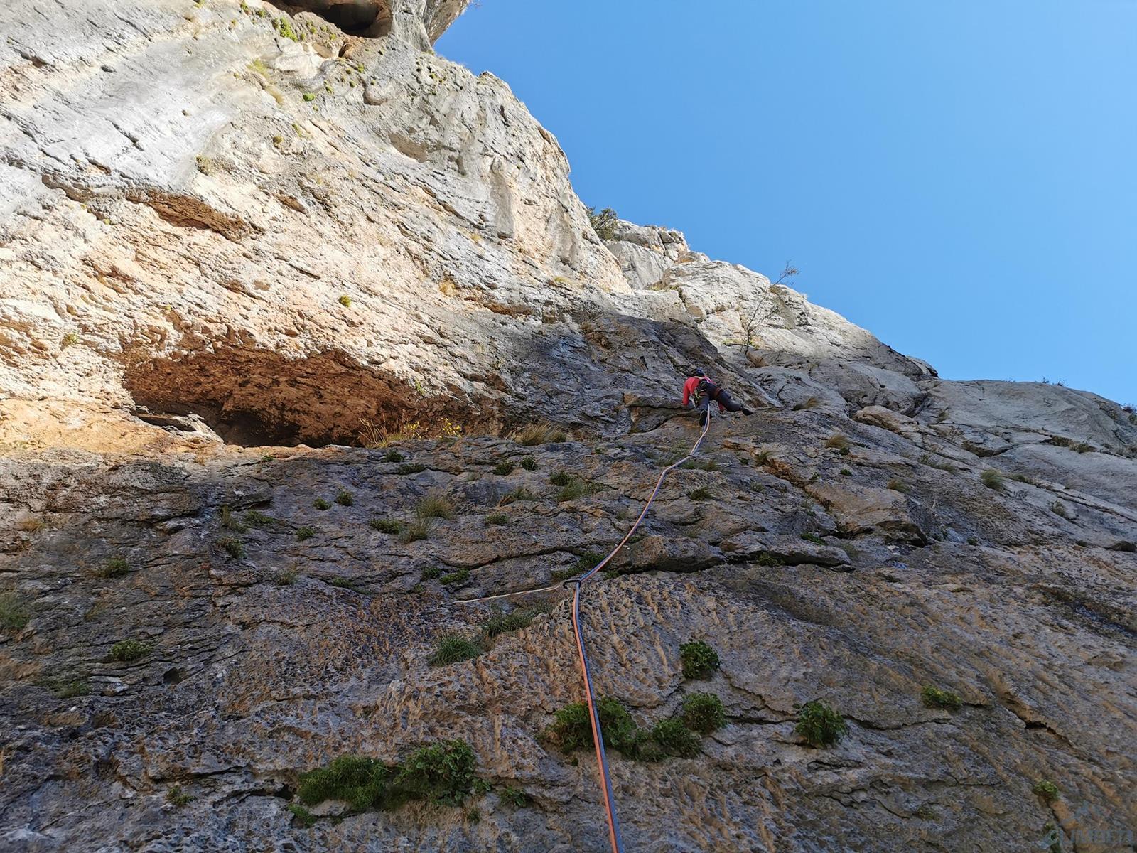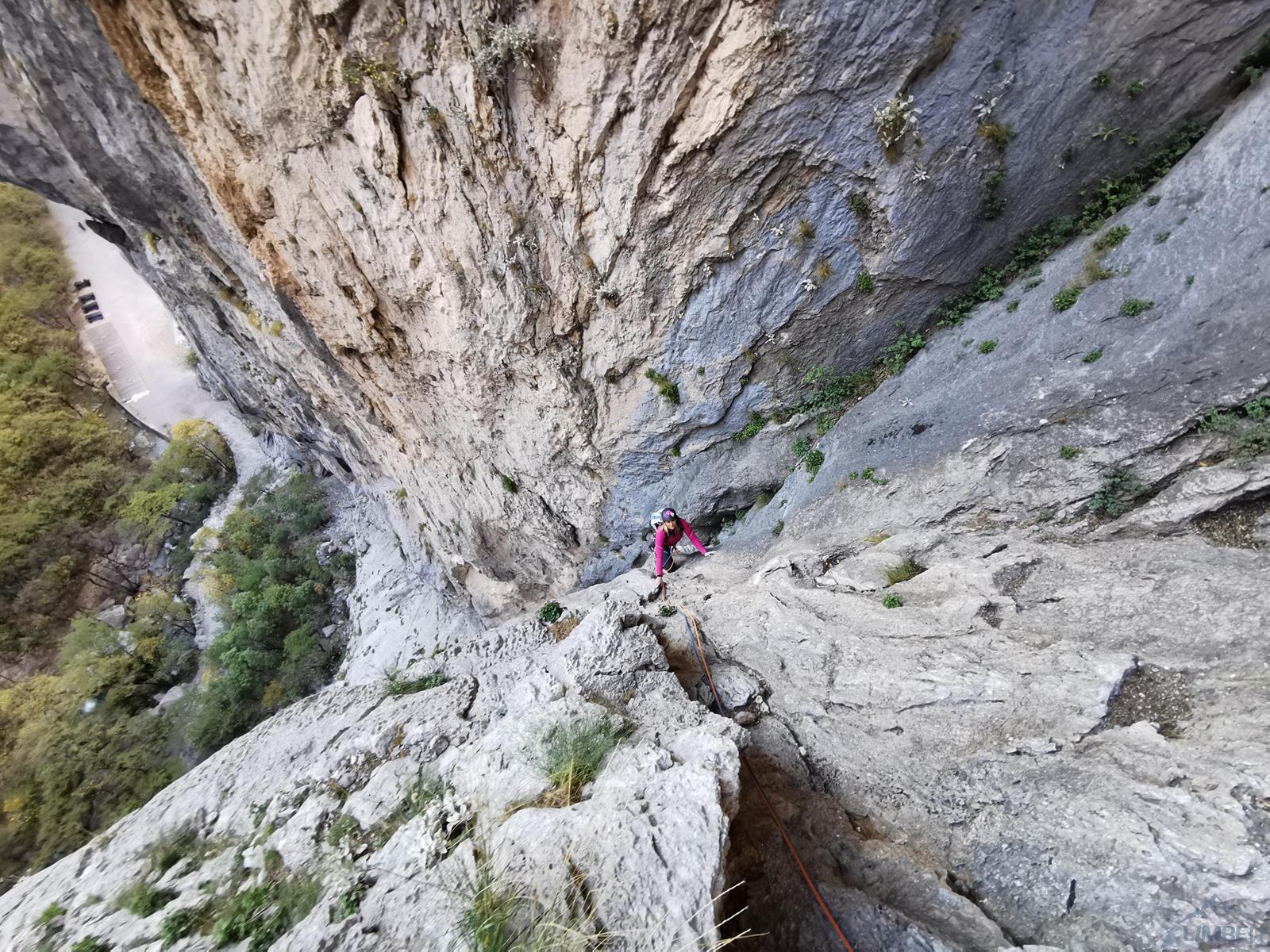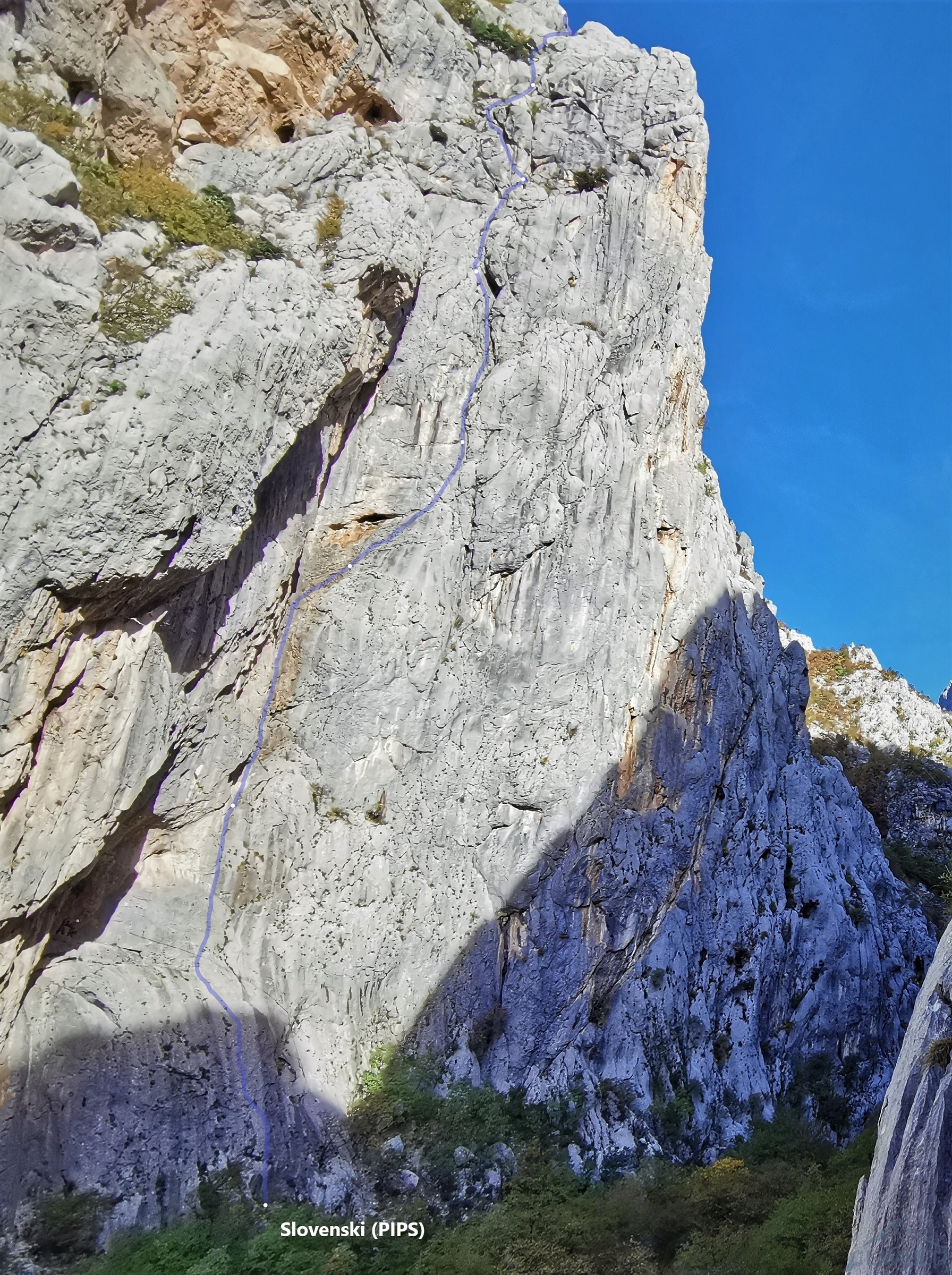 Ponieważ ostatnim razem nie opisywałem poszczególnych wyciągów, zaległości nadrabiam tutaj. Pod Slovenski (PIPS) podchodzimy z parkingu w kilka minut – kierujemy się na widoczną południową ścianę Debeli Kuk i skręcamy ku jej podstawie, gdzie namierzamy tabliczkę z nazwą drogi. Pierwszy wyciąg (IV+, 60 metrów) prowadzi wielką płytą – wspinamy się wzdłuż nielicznych spitów z dwoma dość czujnymi jak na 4a miejscami i po wyjściu w łatwy teren podchodzimy wysoko pod głęboko wcięty komin. Kolejny wyciąg (ok. 30 m.) słynie ze swojego niebanalnego charakteru - gdy robiłem go trzy lata byliśmy w szoku, że w przewodniku wyceniony jest na 5c, w nowej edycji ma już 6a+ (VII- w Bergsteigen) i jest to zdecydowanie bliższe prawdy 😊. Obicie jest dobre, trzeba się jednak wykazać techniką i umiejętnym odnajdywaniem chwytów i stopni. Idąca na drugiego partnerka, podobnie jak wszyscy odwiedzający to miejsce po raz pierwszy jest w lekkim szoku i ułatwia sobie przejście za pomocą ekspresów. Po wyjściu z trudności już łatwiejszym terenem docieramy do stanowiska.