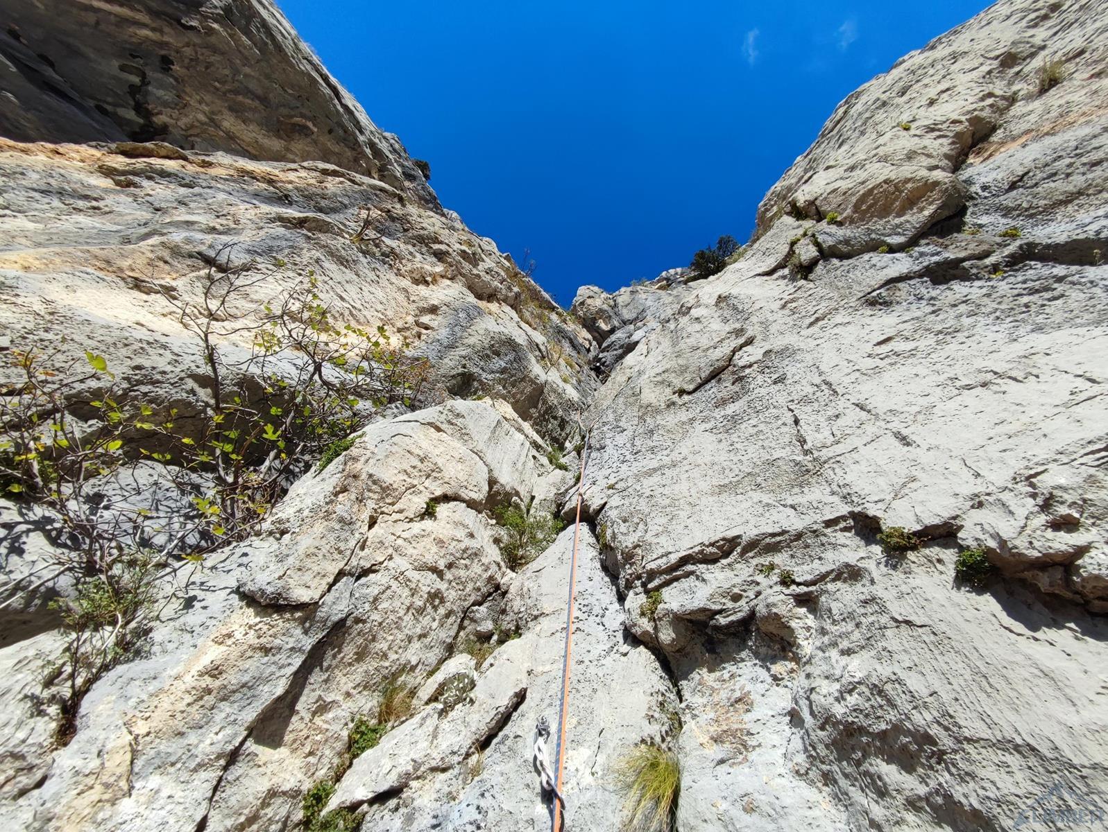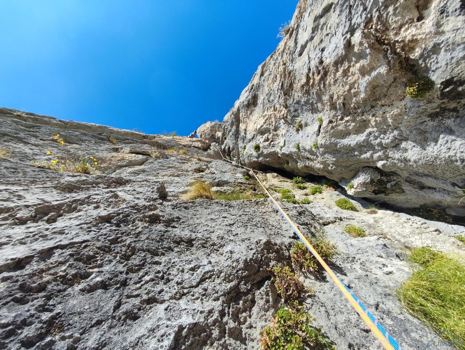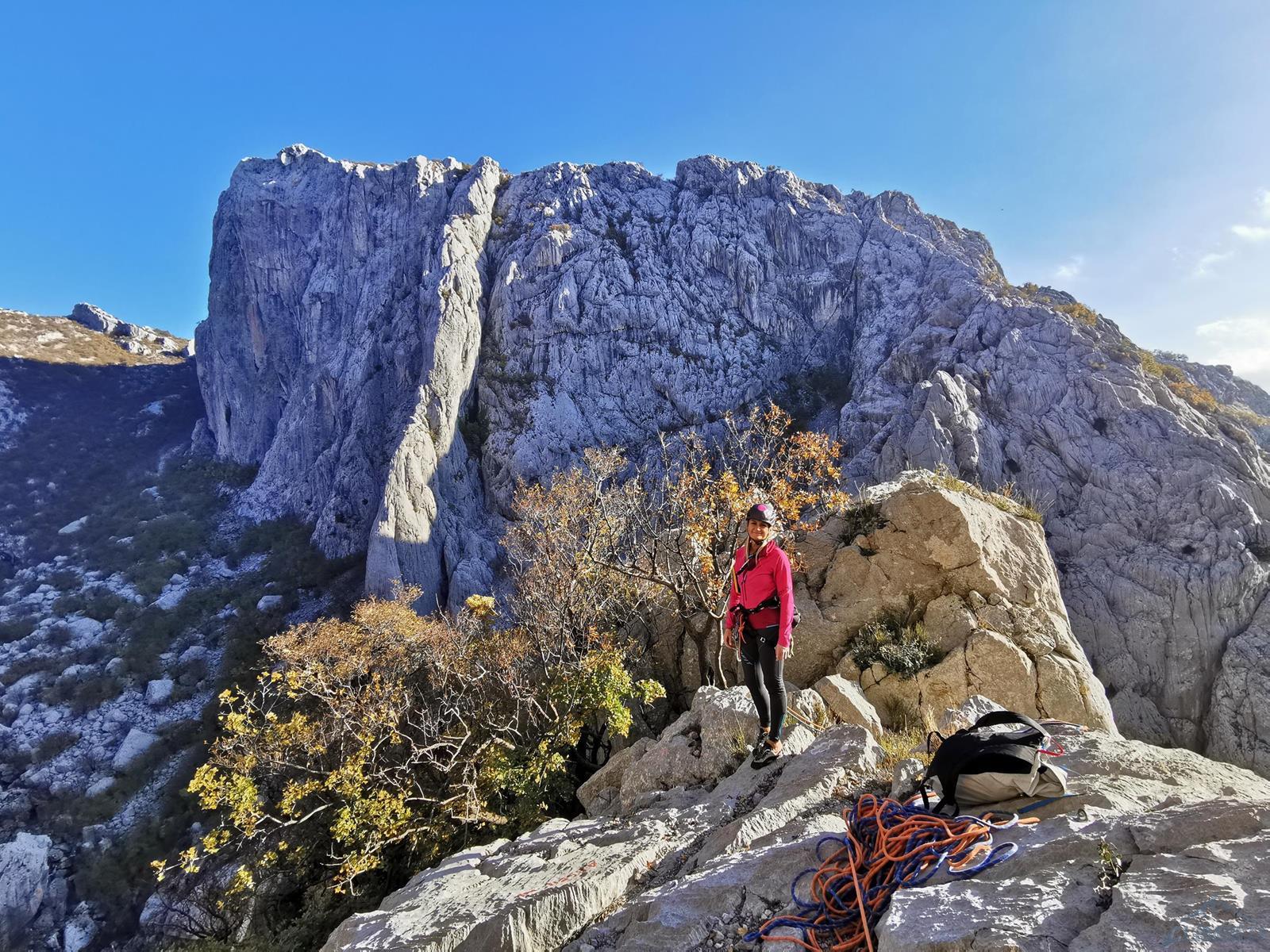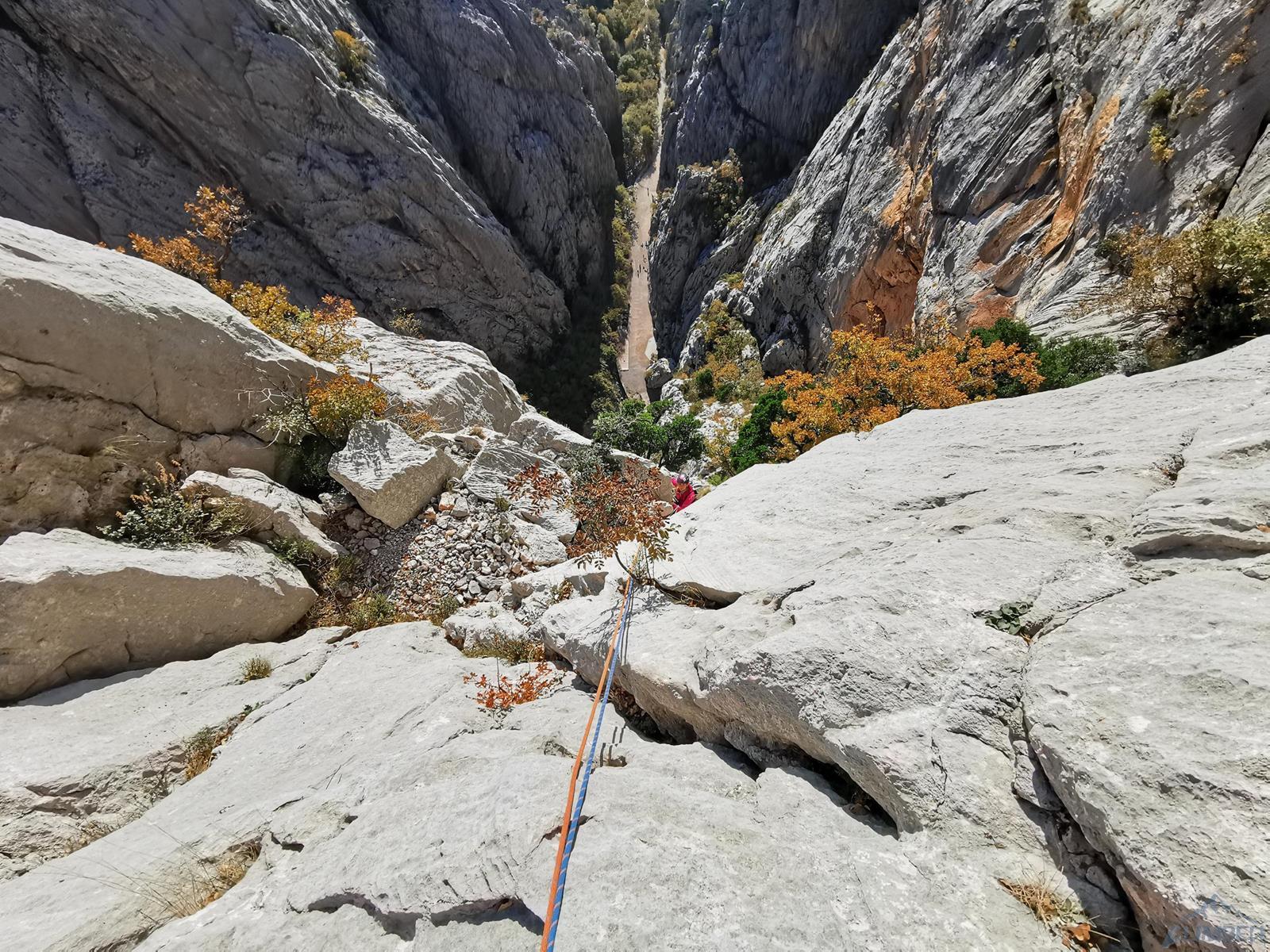 Na piątym wyciągu (V+, ok. 30 m.) startujemy zacięciem wprost do góry, po czym kierujemy się w prawo do stanowiska w nyży. Na starcie kolejnego odcinka (VI, ok. 40 m.) czeka nas ciekawy bulder, po przejściu którego dostajemy się do kolejnego zacięcia po lewej stronie. Idziemy do góry, mijamy przewieszenie lewą stroną i po wdrapaniu się na półkę skręcamy skośnie w prawo do stanowiska. Ostatni wyciąg (VI+, 40 m.) zaczyna się bardzo fajnym dilfrem – po przejściu tego krótkiego odcinka czeka nas już łatwiejsze wspinanie po płytach i wyjście z zagruzowanego tarasu na szczyt. Zadowoleni ze zrobienia drogi, a jeszcze bardziej chyba ze ściągnięcia butów podziwiamy widoki na Anićę Kuk z jednej i zatokę z drugiej, po czym szykujemy się do powrotu pod ścianę. Jedna opcja zakłada zjazd do ścieżki zejściowej po drugiej stronie, nie zabierając jednak butów zjeżdżamy ścianą – linią drogi BWSC (5 zjazdów, szczegóły na topo Bergsteigen). Zgarniamy towarzyszy i ruszamy w dziewięciogodzinną podróż powrotną, podczas której w głowie układają się plany na kolejną wizytę w Paklenicy 😊.