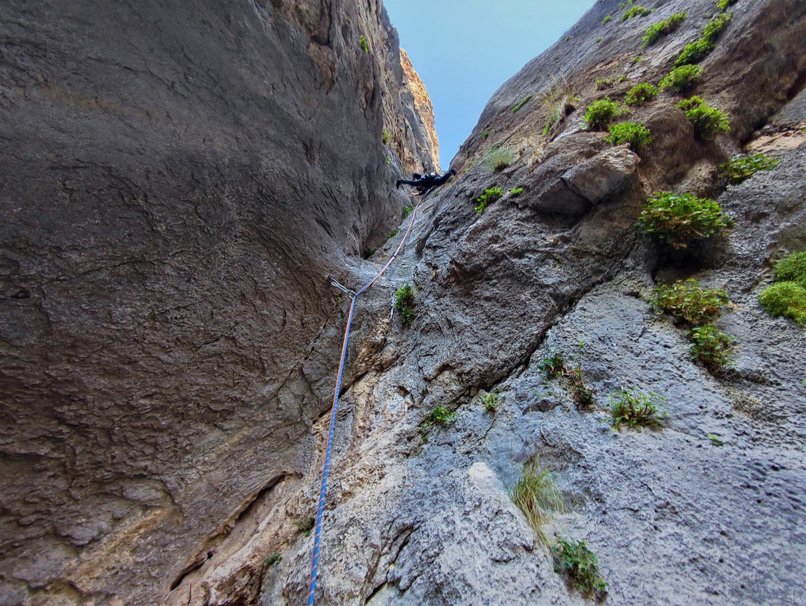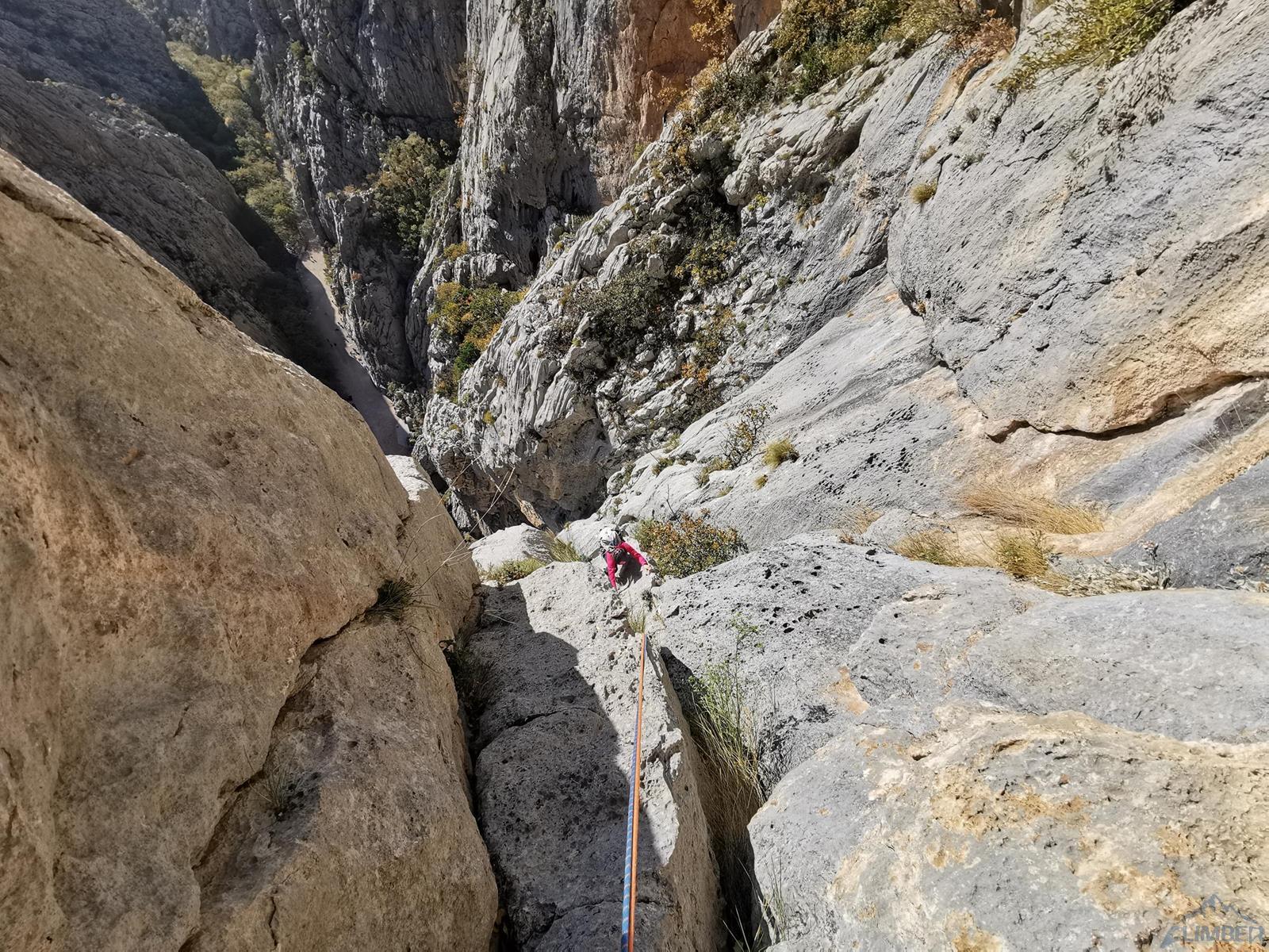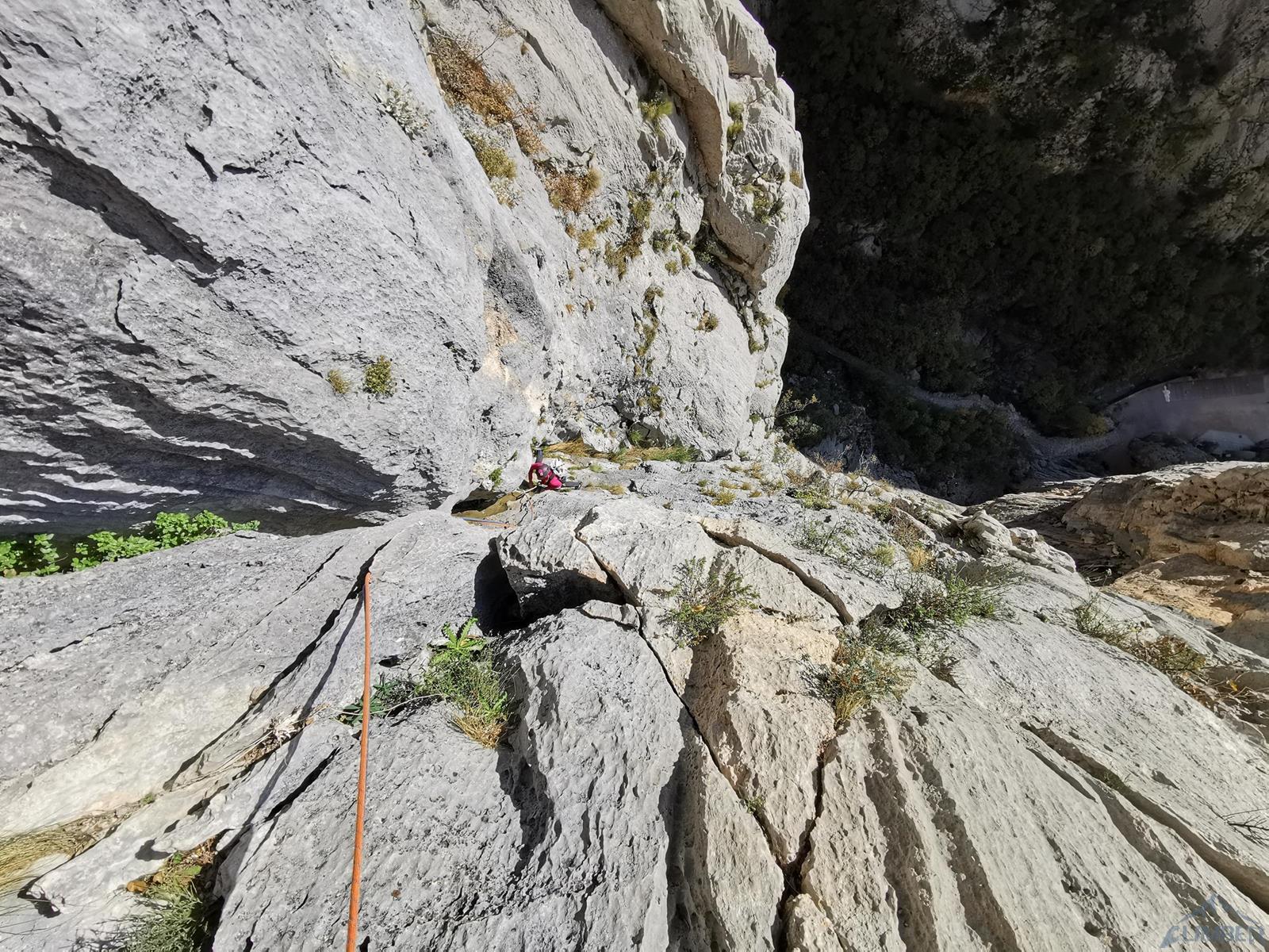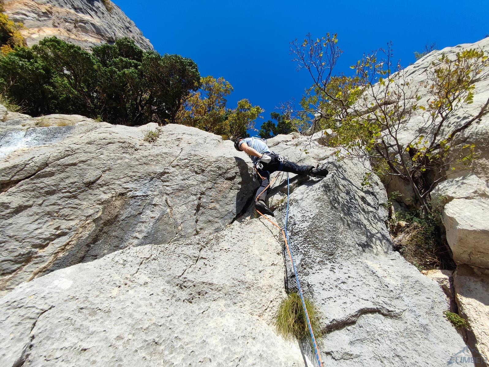 Na piątym wyciągu (V+, ok. 30 m.) startujemy zacięciem wprost do góry, po czym kierujemy się w prawo do stanowiska w nyży. Na starcie kolejnego odcinka (VI, ok. 40 m.) czeka nas ciekawy bulder, po przejściu którego dostajemy się do kolejnego zacięcia po lewej stronie. Idziemy do góry, mijamy przewieszenie lewą stroną i po wdrapaniu się na półkę skręcamy skośnie w prawo do stanowiska. Ostatni wyciąg (VI+, 40 m.) zaczyna się bardzo fajnym dilfrem – po przejściu tego krótkiego odcinka czeka nas już łatwiejsze wspinanie po płytach i wyjście z zagruzowanego tarasu na szczyt. Zadowoleni ze zrobienia drogi, a jeszcze bardziej chyba ze ściągnięcia butów podziwiamy widoki na Anićę Kuk z jednej i zatokę z drugiej, po czym szykujemy się do powrotu pod ścianę. Jedna opcja zakłada zjazd do ścieżki zejściowej po drugiej stronie, nie zabierając jednak butów zjeżdżamy ścianą – linią drogi BWSC (5 zjazdów, szczegóły na topo Bergsteigen). Zgarniamy towarzyszy i ruszamy w dziewięciogodzinną podróż powrotną, podczas której w głowie układają się plany na kolejną wizytę w Paklenicy 😊.