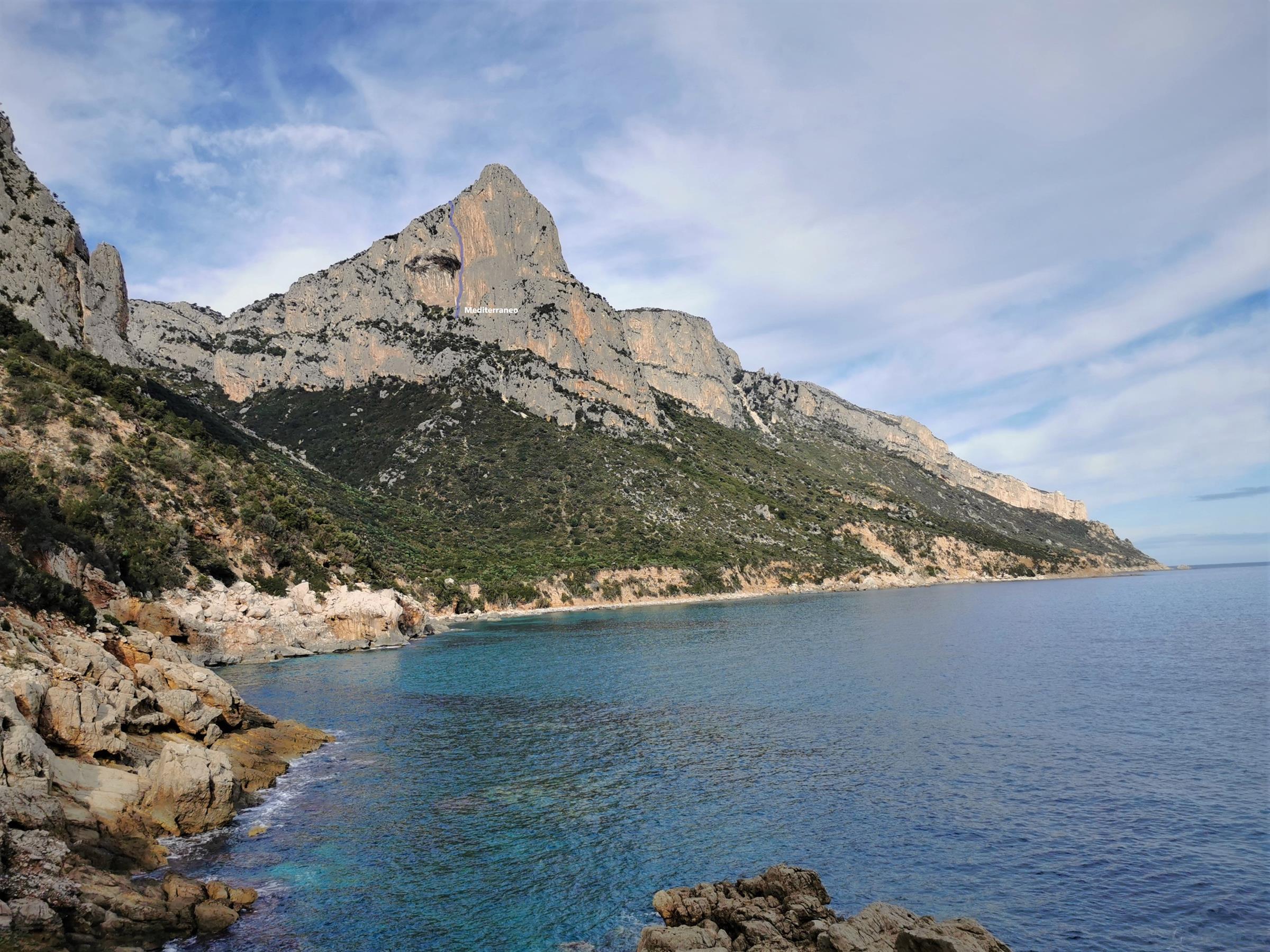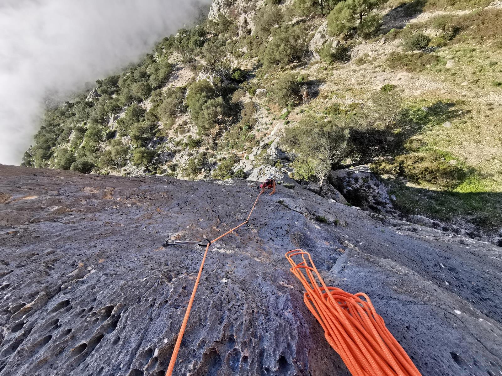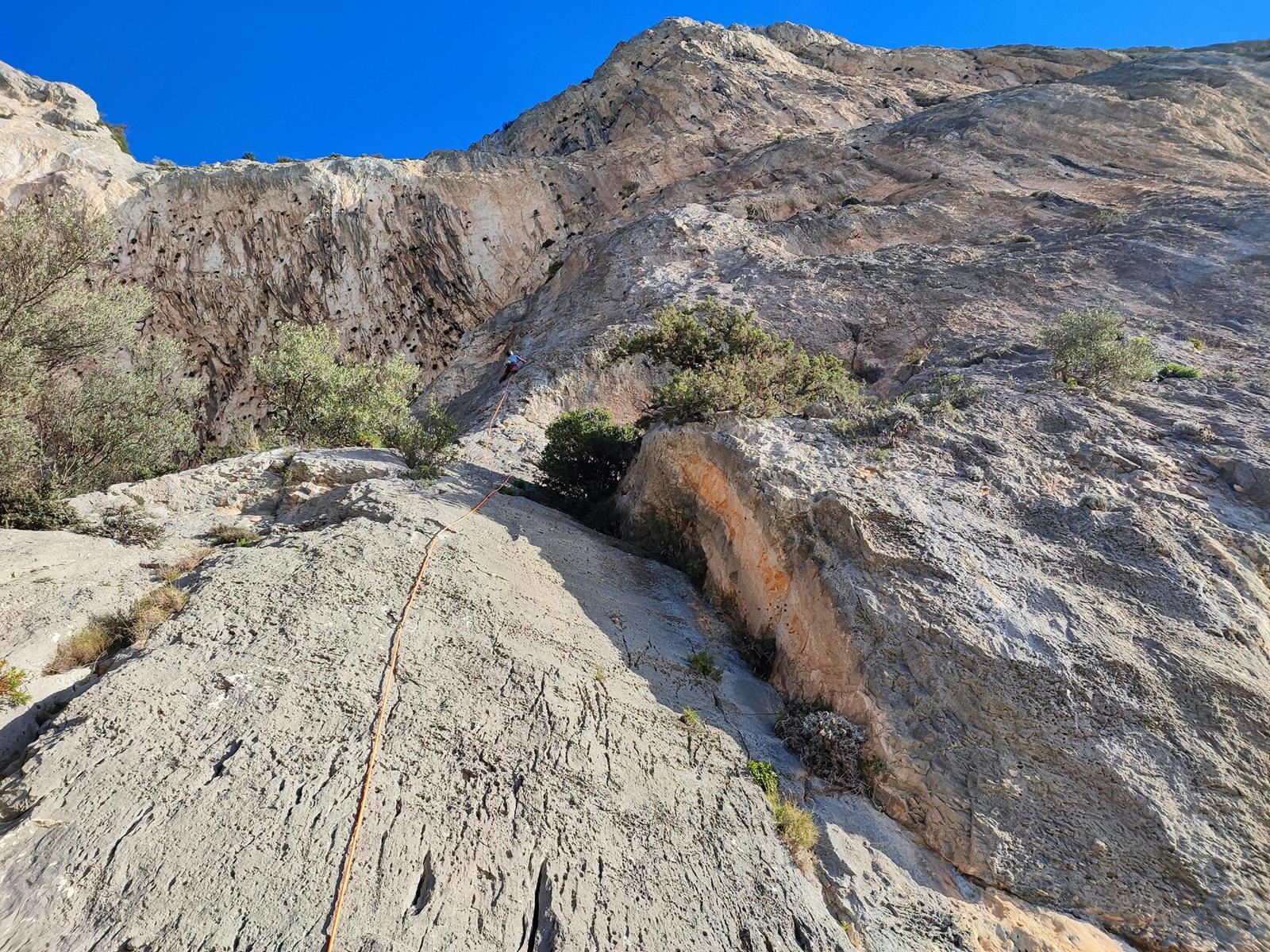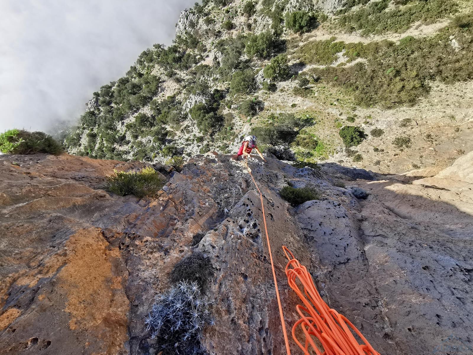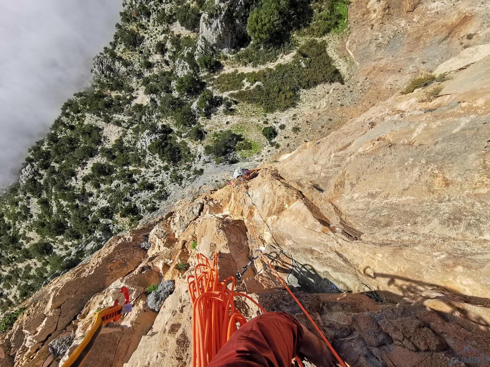 By dostać się pod ścianę wyjeżdżamy z Baunei na płaskowyż i skręcamy w drogę gruntową Monte Ginnirco – stąd nie zrażając się stanem drogi jedziemy aż do parkingu (40.048395, 9.693542) przy owczarni opisanej na mapach jako Ovile Us Piggius. Mapy Google nie doprowadzą nas do tego miejsca, punkt docelowy jednak oznaczony jest na nich dobrze, podobnie jak szlak doń doprowadzający. Bardzo dobra mapka wraz z listą dróg na ścianie jest na świetnej stronie Climbingsardinia (TUTAJ), przewodnik z wielowyciągami to Pietra di Luna Trad & Multipitches, Maurizio Oviglia. Po zaparkowaniu wchodzimy na farmę i kierujemy się wyraźną ścieżką w dół, wychodzimy przez bramkę i kontynuujemy wzdłuż skał – po około 30 minutach dotrzemy na tzw. Półkę Giradili, którą idziemy do momentu aż nad głową zobaczymy gigantyczną grotę w lewej części ściany. Pod drogi w okolicy groty (w tym Mediterraneo) dostajemy się po pokonaniu kilkumetrowego kominka ubezpieczonego liną. Odnajdujemy start drogi (trochę nam to zajęło ale mając zdjęcie pierwszego wyciągu nie będzie problemu) i szykujemy się do wspinania. Nawet łatwiejsze wyciągi zapowiadają się niebanalnie i są rzadziej obite (na niektórych asekuracja to raczej S3 niż S2!), dlatego też Ania nie decyduje się na prowadzenie i pójdę całość jako pierwszy na linie.