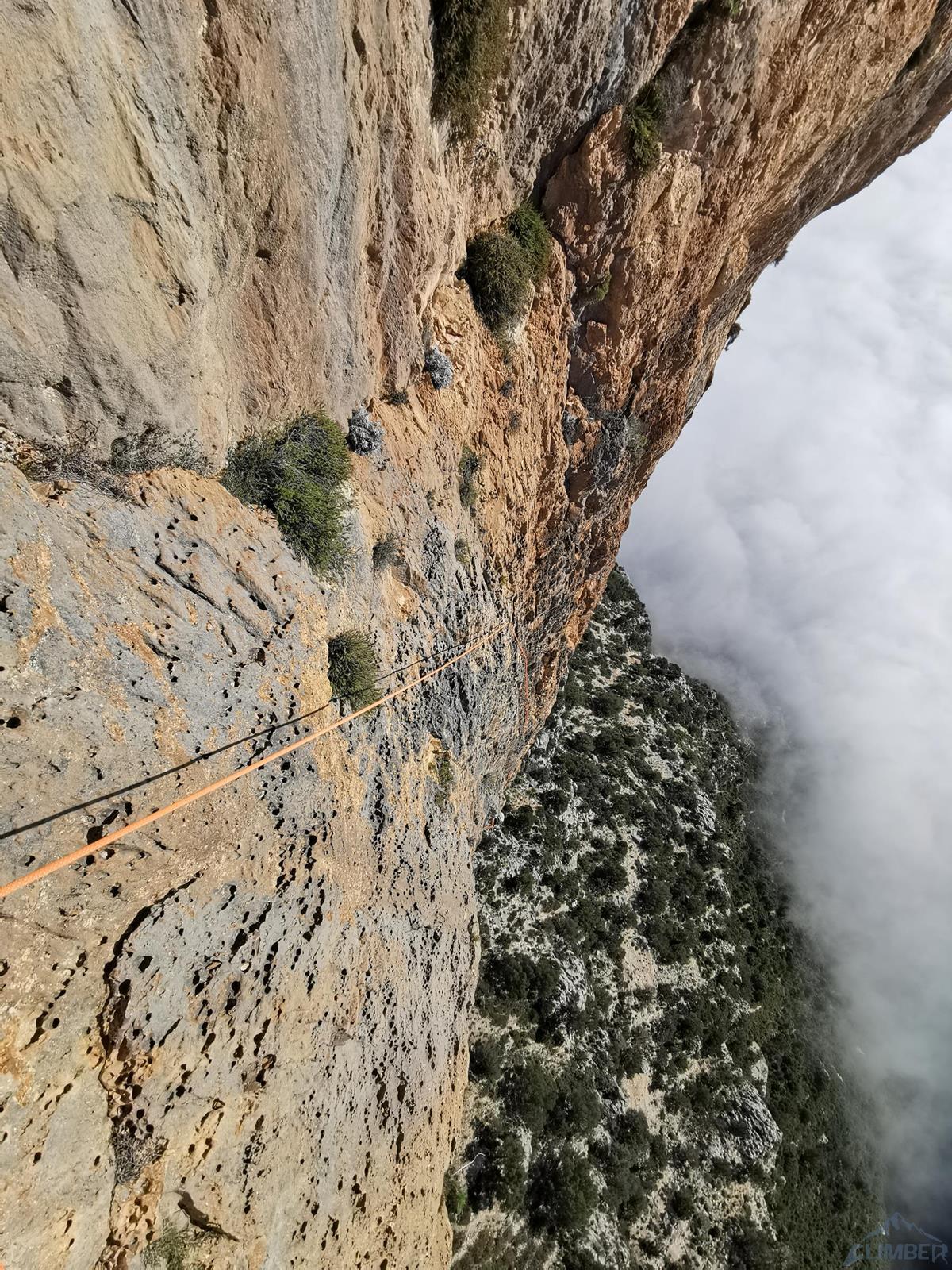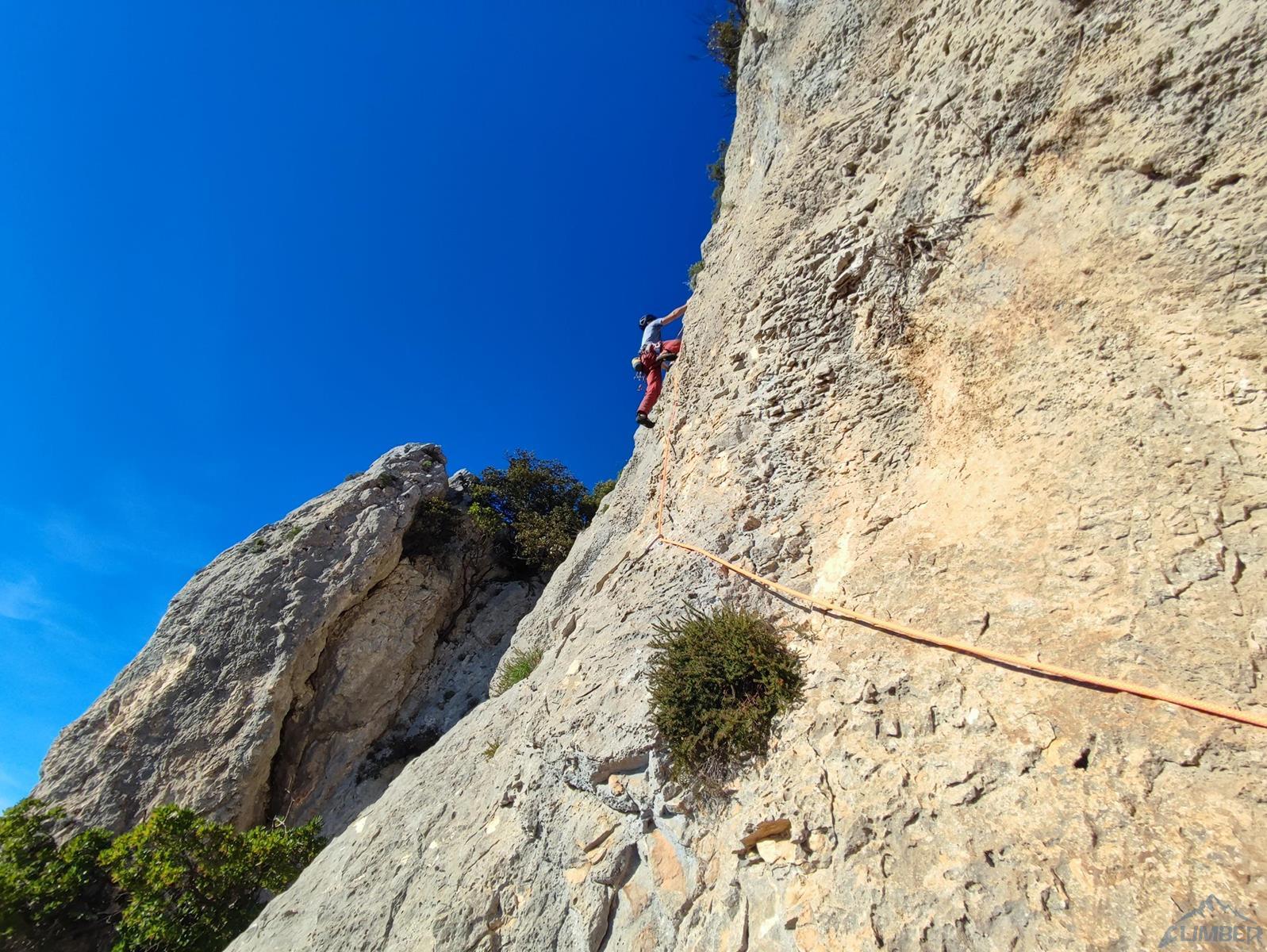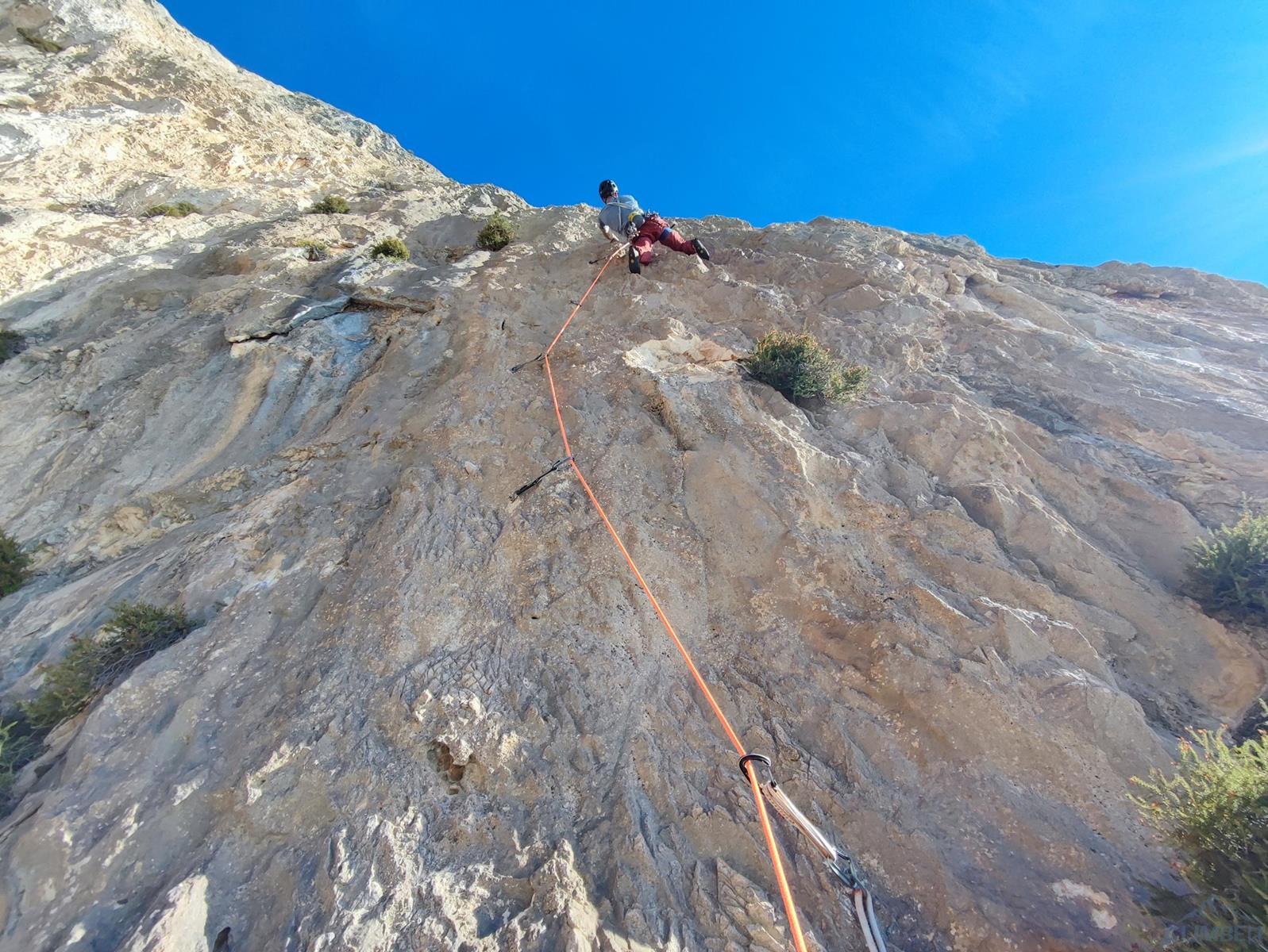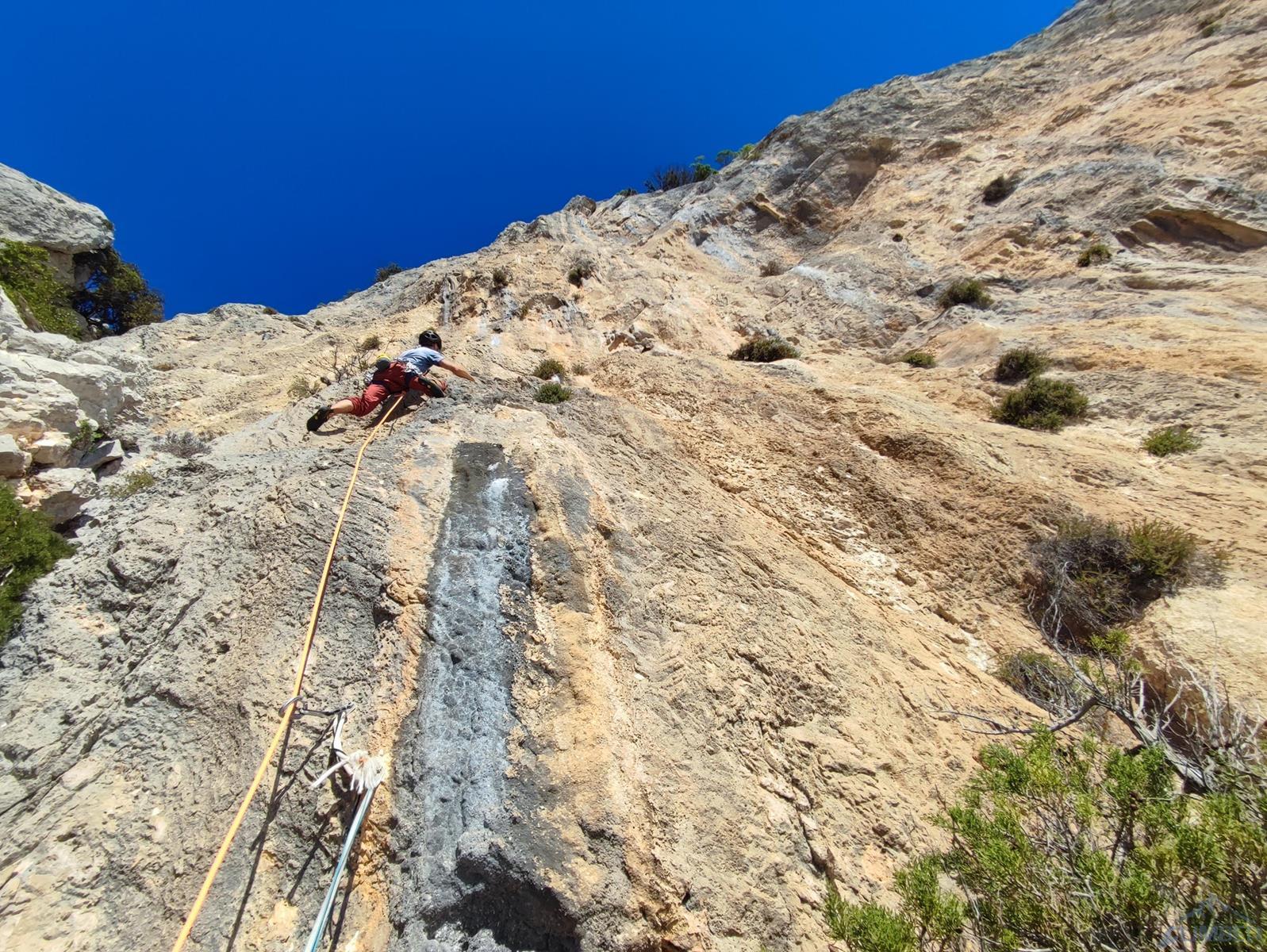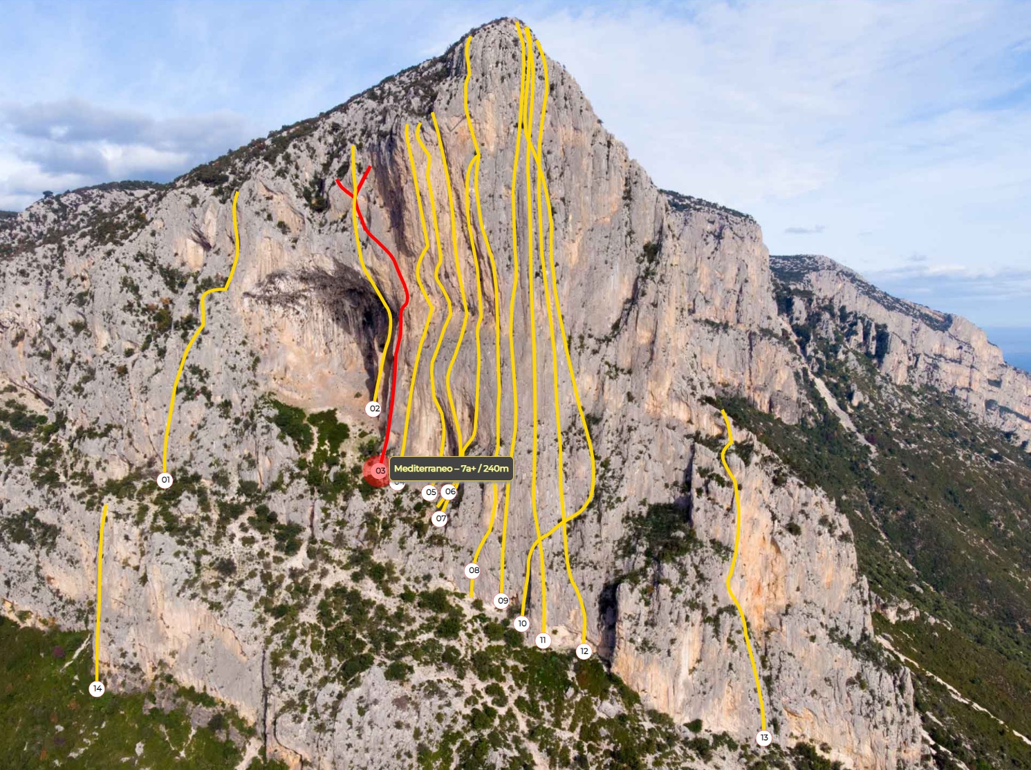 By dostać się pod ścianę wyjeżdżamy z Baunei na płaskowyż i skręcamy w drogę gruntową Monte Ginnirco – stąd nie zrażając się stanem drogi jedziemy aż do parkingu (40.048395, 9.693542) przy owczarni opisanej na mapach jako Ovile Us Piggius. Mapy Google nie doprowadzą nas do tego miejsca, punkt docelowy jednak oznaczony jest na nich dobrze, podobnie jak szlak doń doprowadzający. Bardzo dobra mapka wraz z listą dróg na ścianie jest na świetnej stronie Climbingsardinia (TUTAJ), przewodnik z wielowyciągami to Pietra di Luna Trad & Multipitches, Maurizio Oviglia. Po zaparkowaniu wchodzimy na farmę i kierujemy się wyraźną ścieżką w dół, wychodzimy przez bramkę i kontynuujemy wzdłuż skał – po około 30 minutach dotrzemy na tzw. Półkę Giradili, którą idziemy do momentu aż nad głową zobaczymy gigantyczną grotę w lewej części ściany. Pod drogi w okolicy groty (w tym Mediterraneo) dostajemy się po pokonaniu kilkumetrowego kominka ubezpieczonego liną. Odnajdujemy start drogi (trochę nam to zajęło ale mając zdjęcie pierwszego wyciągu nie będzie problemu) i szykujemy się do wspinania. Nawet łatwiejsze wyciągi zapowiadają się niebanalnie i są rzadziej obite (na niektórych asekuracja to raczej S3 niż S2!), dlatego też Ania nie decyduje się na prowadzenie i pójdę całość jako pierwszy na linie.