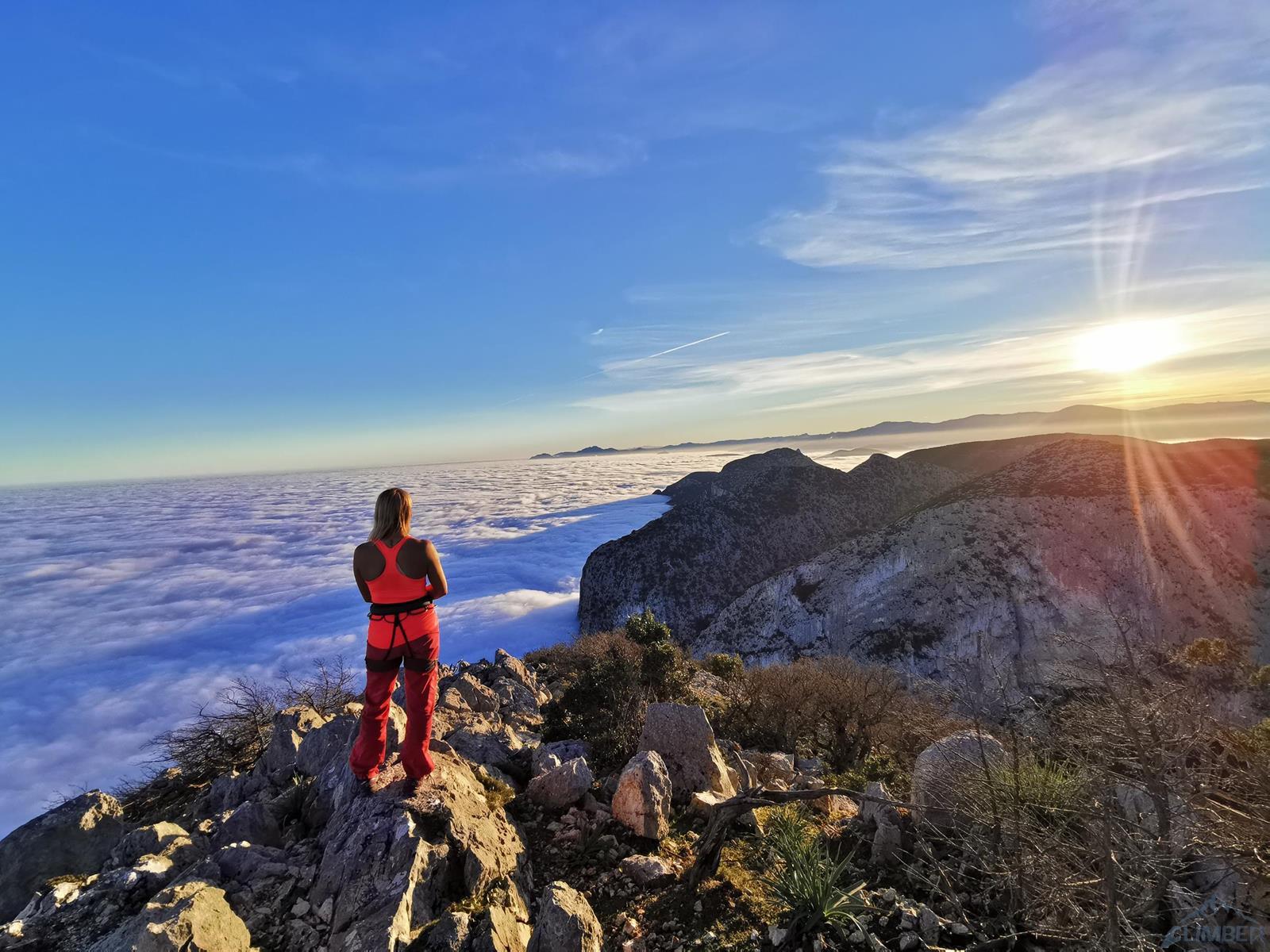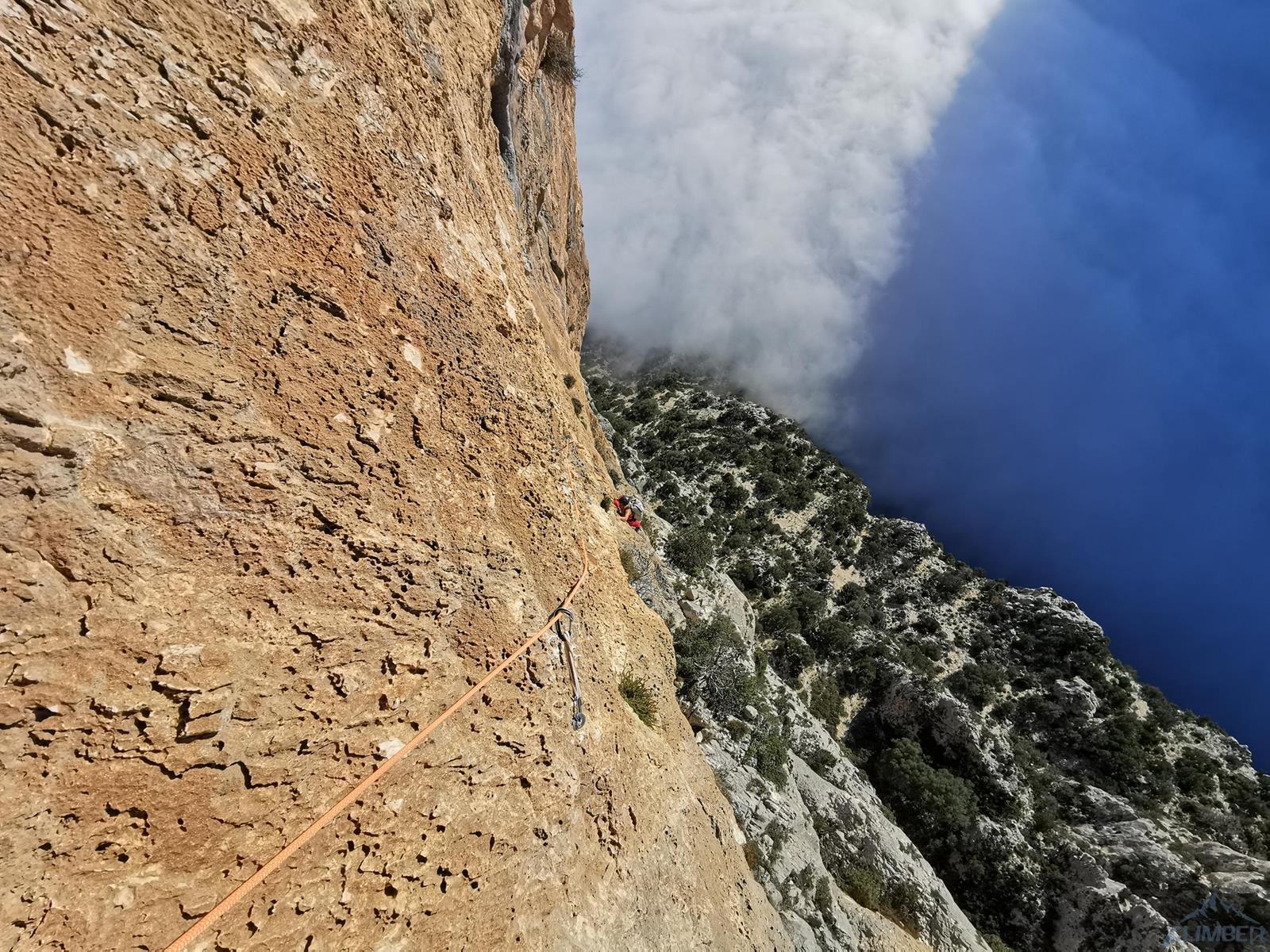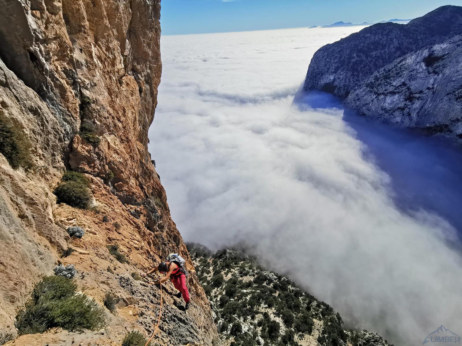 Wyciąg siódmy (6c, 25 m) startuje pionowo do góry po dobrych chwytach, trudno robi się dopiero pod koniec gdy wykonać musimy bulderowy trawers po ostrych jak żyletki chwytach. Za pierwszym razem wypadam pod koniec, druga próba (PP) jest już jednak skuteczna. Do końca drogi pozostaje jeden wyciąg – oryginalny wariant (6c+, 15 m) prowadzi w lewo, nowszy (dłuższy ale łatwiejszy bo 6c) w prawo, co ważne nie idziemy wprost bo jest to 7b należące do drogi dochodzącej z dołu. Wybieram pierwszą opcję i o ile początek jest łatwy, o tyle trudności nie puszczają już przy tym stanie stóp – bulder ma zaledwie kilka ruchów ale chwyty oraz stopnie są bardzo małe. Próbuję dwa razy od dołu, za trzecim razem idę już po bloku i godząc się z drugim AF na drodze pokonuję trudności i wychodzę do stanowiska na tarasie za przełamaniem ściany. Po chwili dołącza do mnie partnerka, rozwiązujemy się i szczęśliwi, że udało przejść się ścianę ruszamy na szczyt – na początek krótka skalna grańka po prawej (II), dalej kilka półek i ścianek. Na wierzchołku Punta Giradili zamiast morza, podobnie jak cały dzień, obserwujemy morze chmur i zbliżający się zachód Słońca. Marzymy o łyku wody, której w ścianie mieliśmy zdecydowanie za mało i po chwili nasze marzenia się spełniają – na szczycie pojawia się dwójka turystów i odstępują nam jedną z przyniesionych butelek 😊.